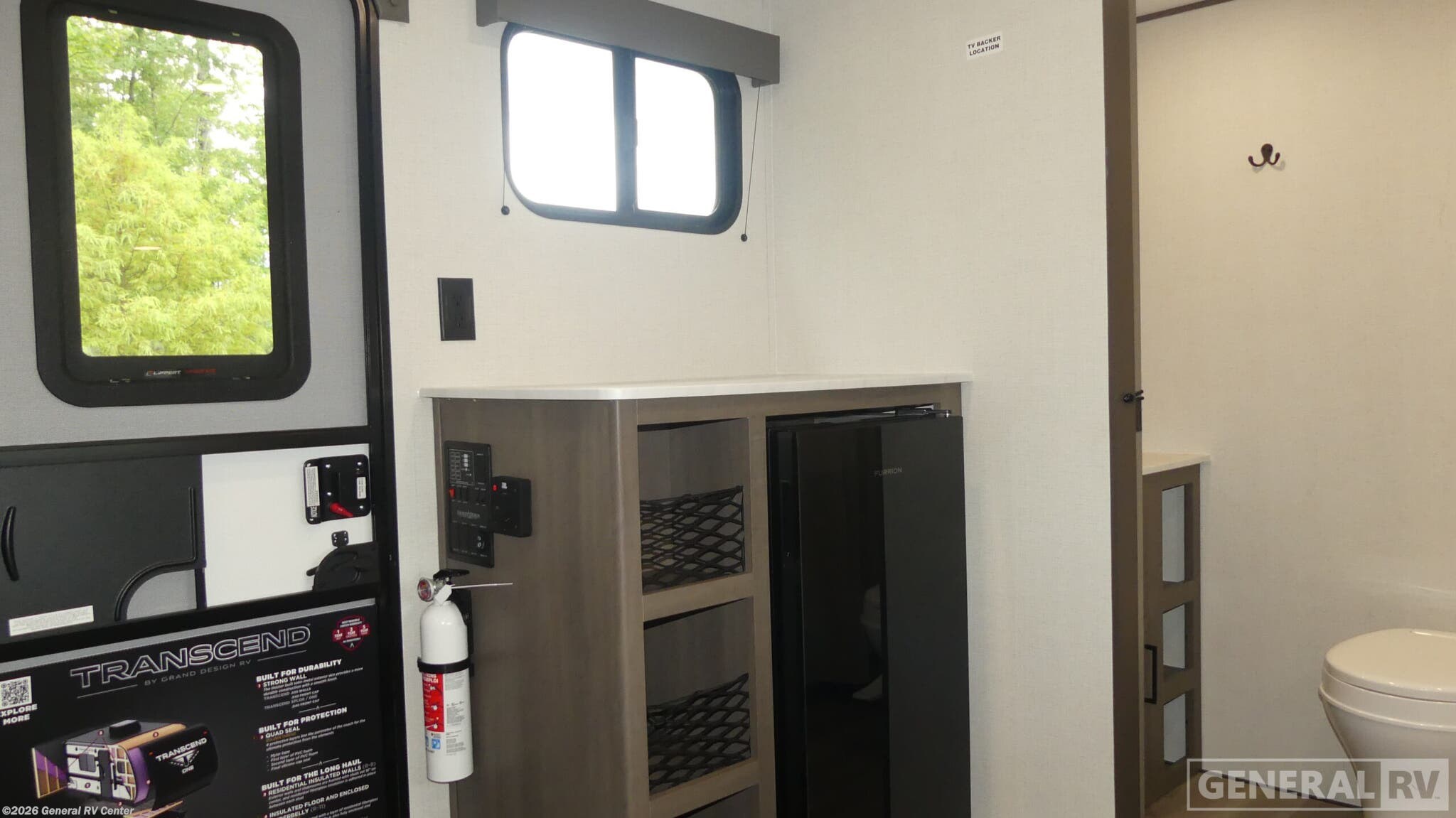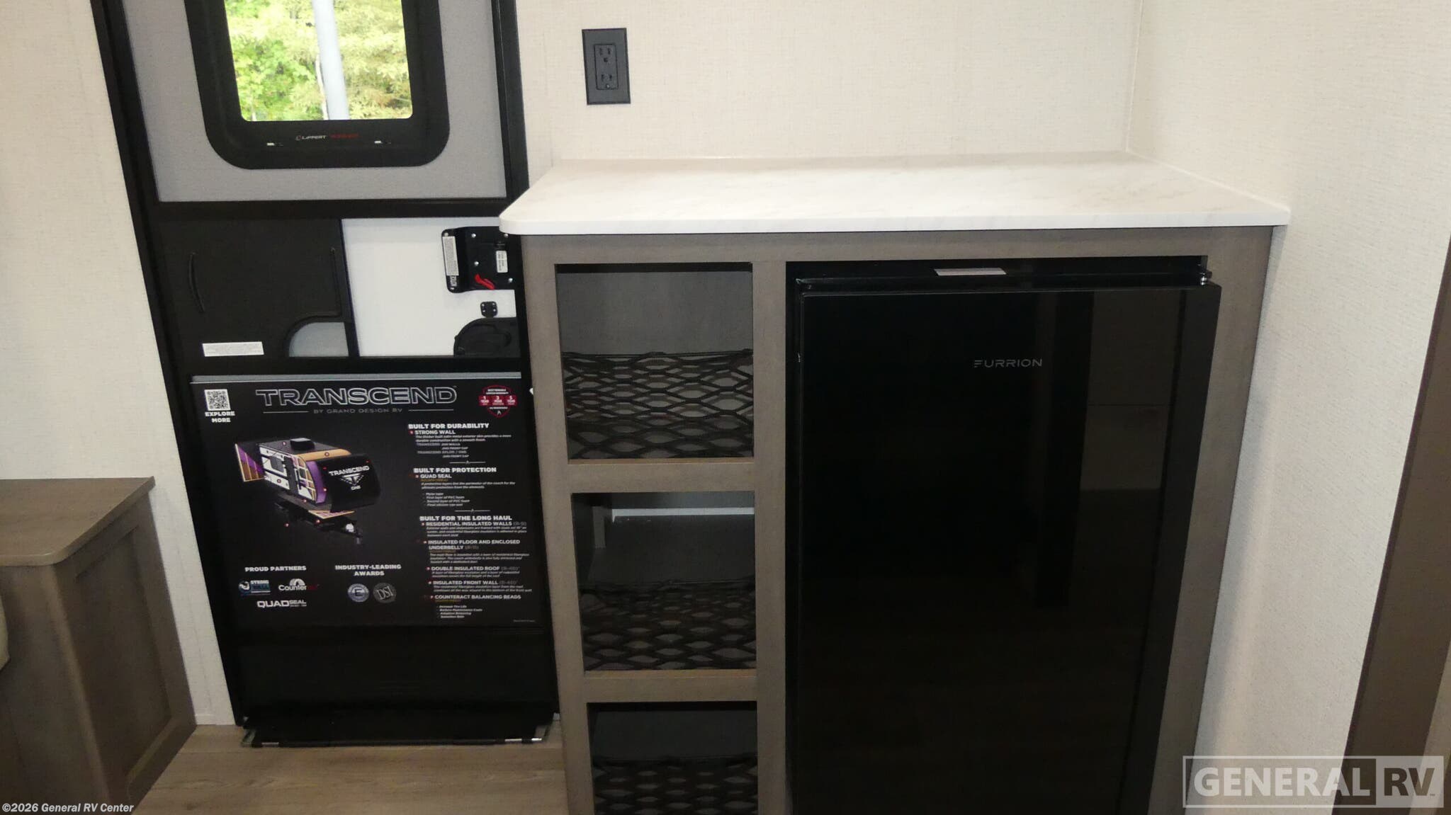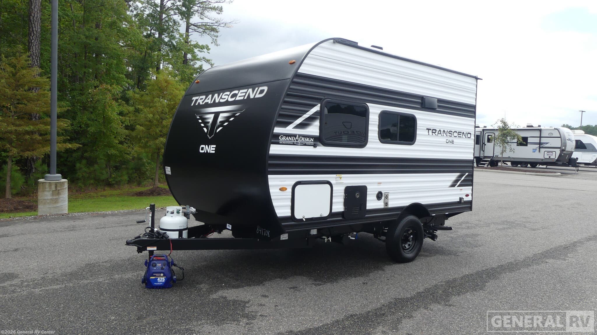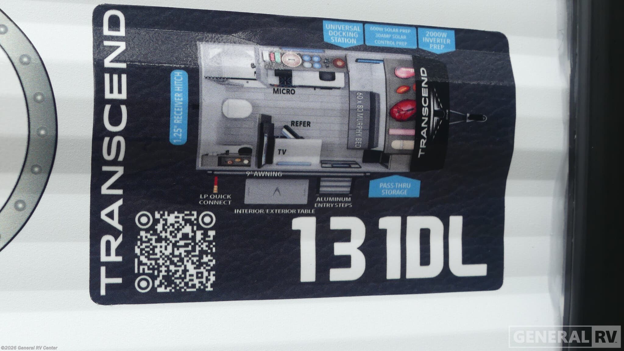 Grand Design Transcend One travel trailer 131DL highlights: Rear Bathroom Interior/Exterior Table Pass Through Storage Foot Flush Toilet Travel in this 131DL model and step inside through the sturdy aluminum entry steps and you'll be greeted by a versatile 60" x 80" Murphy bed that doubles as a comfortable seating area during the day—perfect for relaxing with your furry companion, thanks to the included pet dish. In the center, the kitchen offers all the essentials for preparing a delicious meal, featuring a microwave, 2-burner range, 3.3 cu. ft. refrigerator, and overhead cabinets for added storage. At the rear, enjoy the convenience of a full bathroom complete with a walk-in shower and foot-flush toilet, making life on the road both comfortable and functional. With any Transcend One travel trailer by Grand Design, you will enjoy lightweight towing thanks to their single-axle. There are many interior comforts to make camping easier than ever, such as recessed lighting, residential countertops, and a 6' 6" interior height. Each model is constructed with a heated and enclosed underbelly with suspended tanks, a moisture barrier floor enclosure, and Thermofoil over the roof and front cap for added protection. And a JBL sound system will let you listen to tunes as you visit under the power awning with a Fusion light!