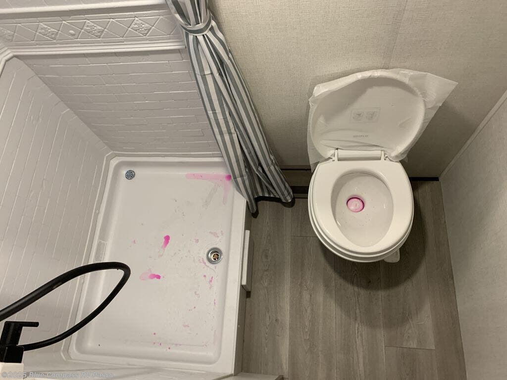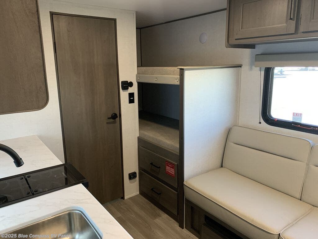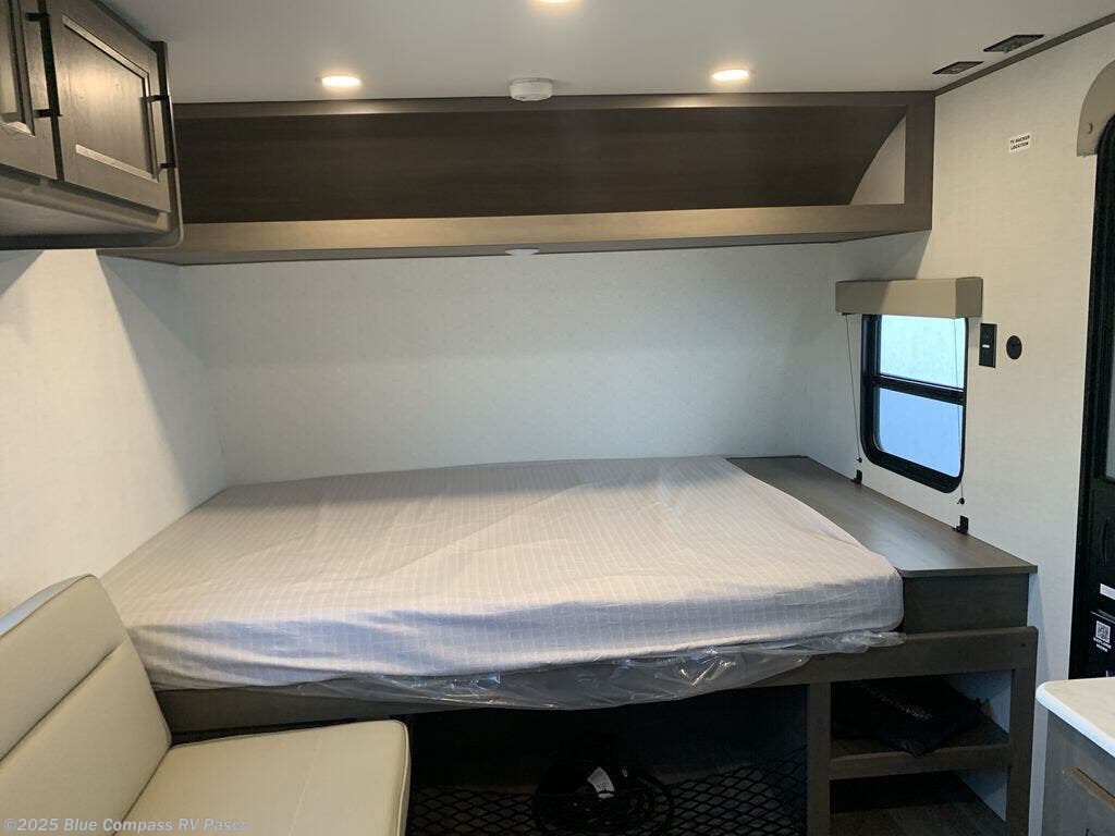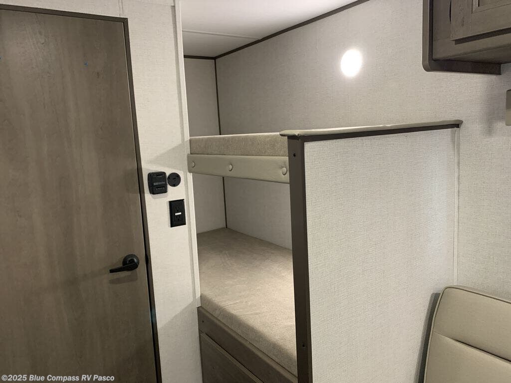 Camping trips to the lake have never been easier than with this travel trailer! The 28" x 67" bunks are right next to the private bath for easy nighttime use, and the front queen bed includes hidden storage for your things. There is also a 66" Jack knife sofa that provides a little more sleeping space for guests. A full kitchen lets you cook meals each day and there is an exterior LP quick connect if you want to fire up your own propane grill.