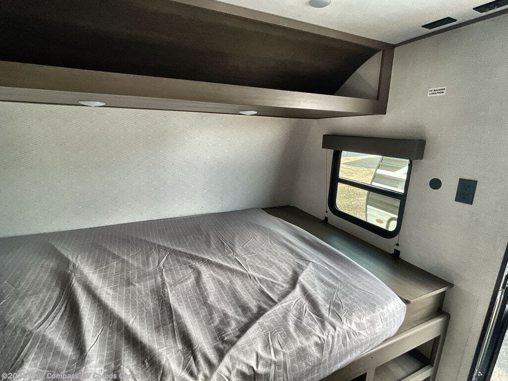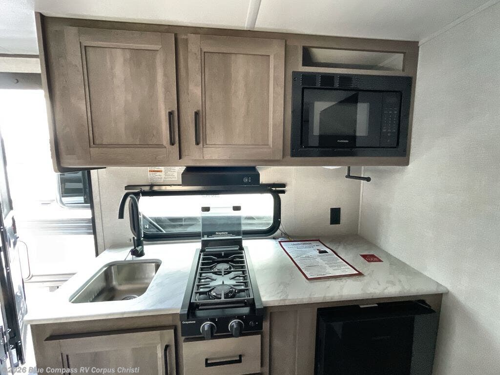 Camping trips to the lake have never been easier than with this travel trailer! The 28" x 67" bunks are right next to the private bath for easy nighttime use, and the front queen bed includes hidden storage for your things. There is also a 66" Jack knife sofa that provides a little more sleeping space for guests. A full kitchen lets you cook meals each day and there is an exterior LP quick connect if you want to fire up your own propane grill.