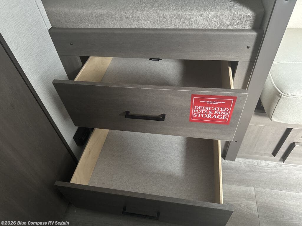 Camping trips to the lake have never been easier than with this travel trailer! The 28" x 67" bunks are right next to the private bath for easy nighttime use, and the front queen bed includes hidden storage for your things. There is also a 66" Jack knife sofa that provides a little more sleeping space for guests. A full kitchen lets you cook meals each day and there is an exterior LP quick connect if you want to fire up your own propane grill.