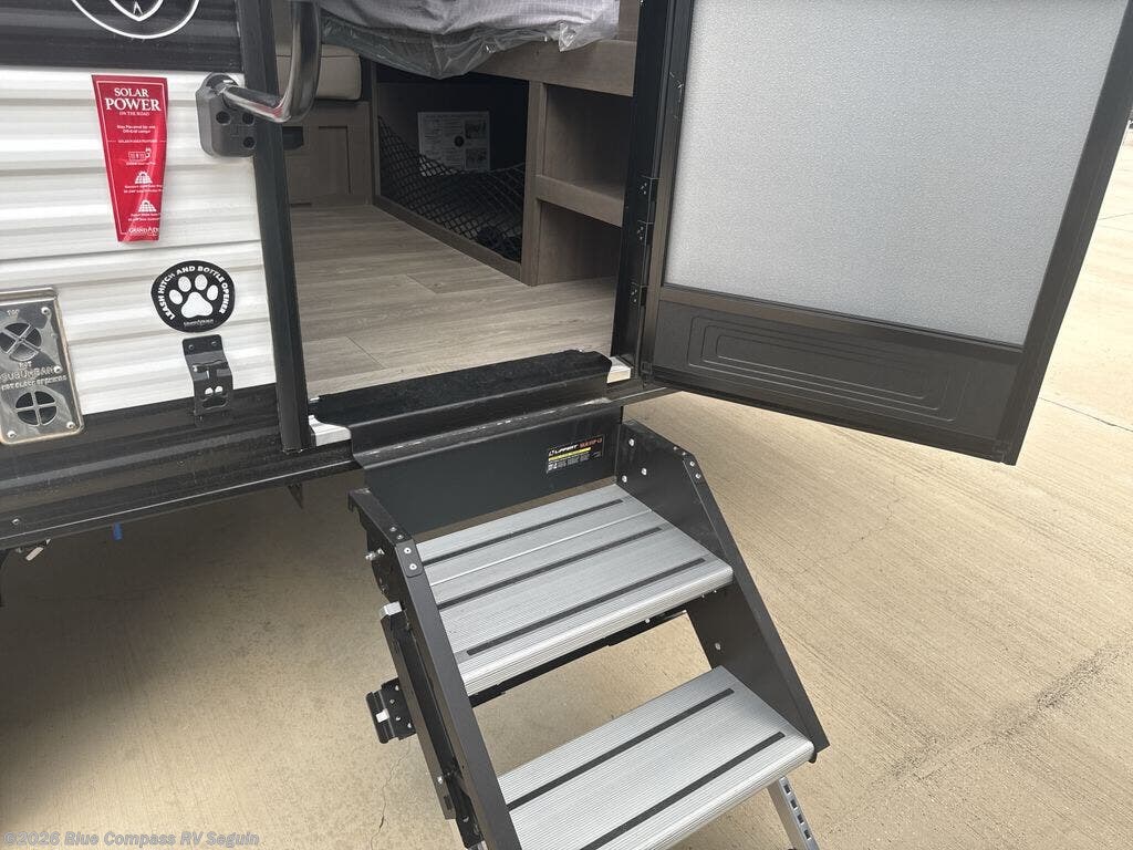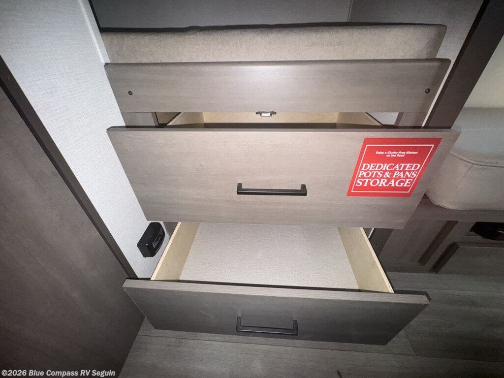 Camping trips to the lake have never been easier than with this travel trailer! The 28" x 67" bunks are right next to the private bath for easy nighttime use, and the front queen bed includes hidden storage for your things. There is also a 66" Jack knife sofa that provides a little more sleeping space for guests. A full kitchen lets you cook meals each day and there is an exterior LP quick connect if you want to fire up your own propane grill.