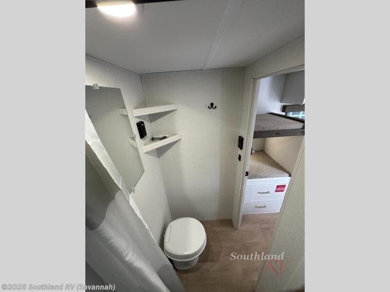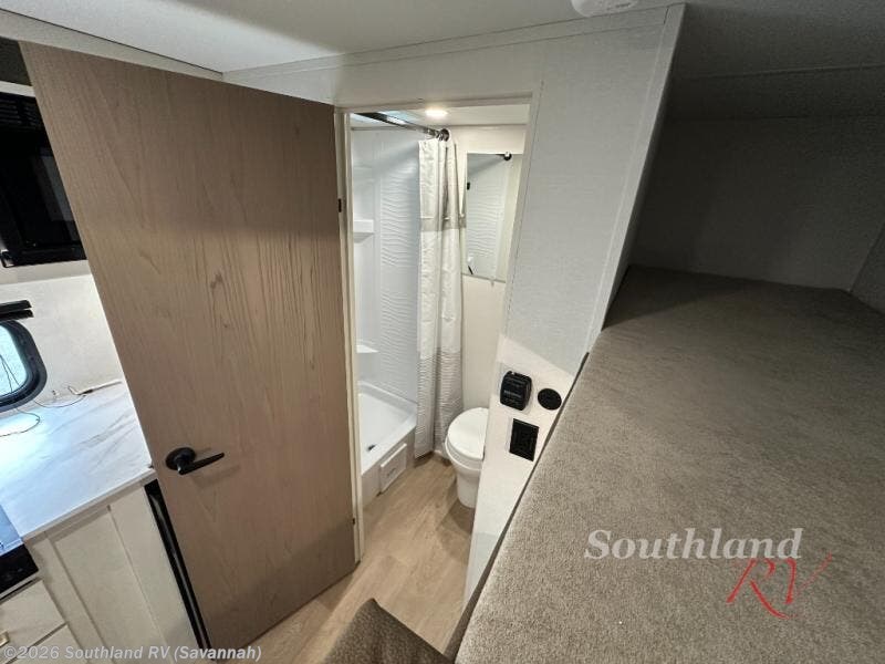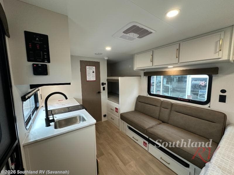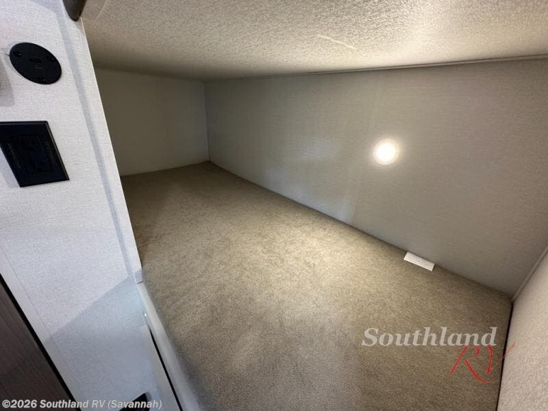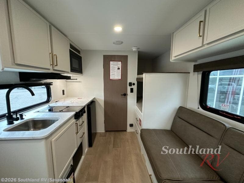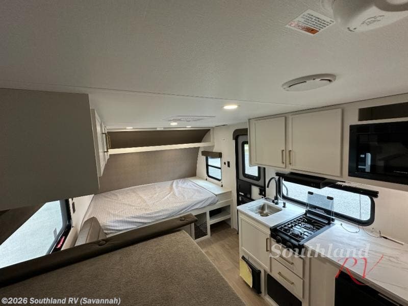 Camping trips to the lake have never been easier than with this travel trailer! The 28" x 67" bunks are right next to the private bath for easy nighttime use, and the front queen bed includes hidden storage for your things. There is also a 66" Jack knife sofa that provides a little more sleeping space for guests. A kitchen lets you cook meals each day and there is an exterior LP quick connect if you want to fire up your own propane grill.