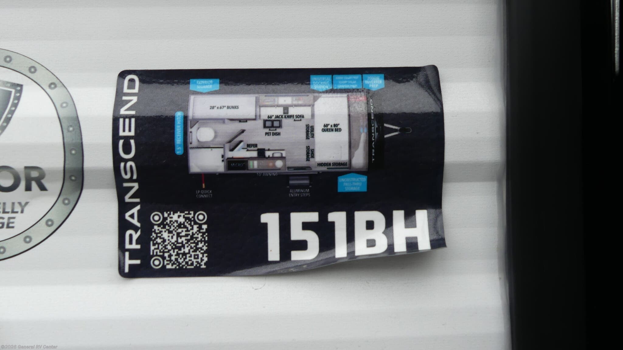 **Grand Design Transcend One travel trailer 151BH highlights:** - Bunk Beds - Unobstructed Pass-Thru Storage - Pet Dish - 10' Power Awning Camping trips to the lake have never been easier than with this travel trailer! The 28" x 67" bunks are right next to the private bath for easy nighttime use, and the front queen bed includes hidden storage for your things. There is also a 66" Jack knife sofa that provides a little more sleeping space for guests. A full kitchen lets you cook meals each day and there is an exterior LP quick connect if you want to fire up your own propane grill. With any Transcend One travel trailer by Grand Design, you will enjoy lightweight towing thanks to their single-axle. There are many interior comforts to make camping easier than ever, such as recessed lighting, residential countertops, and a 6' 6" interior height. Each model is constructed with a heated and enclosed underbelly with suspended tanks, a moisture barrier floor enclosure, and Thermofoil over the roof and front cap for added protection. And a JBL sound system will let you listen to tunes as you visit under the power awning with a Fusion light!