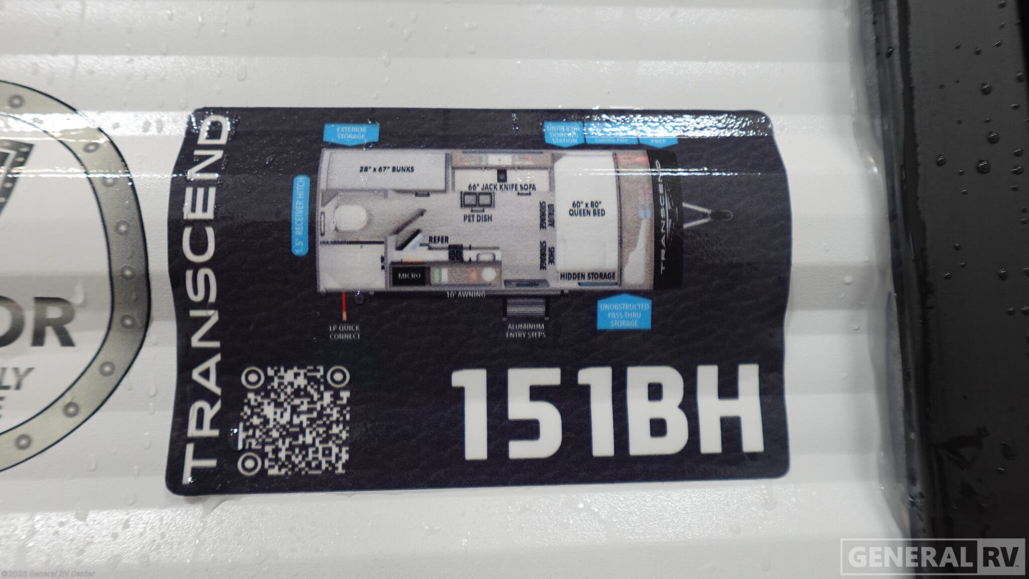 Grand Design Transcend One travel trailer 151BH highlights: Bunk Beds Unobstructed Pass-Thru Storage Pet Dish 10' Power Awning Camping trips to the lake have never been easier than with this travel trailer! The 28" x 67" bunks are right next to the private bath for easy nighttime use, and the front queen bed includes hidden storage for your things. There is also a 66" Jack knife sofa that provides a little more sleeping space for guests. A full kitchen lets you cook meals each day and there is an exterior LP quick connect if you want to fire up your own propane grill. With any Transcend One travel trailer by Grand Design, you will enjoy lightweight towing thanks to their single-axle. There are many interior comforts to make camping easier than ever, such as recessed lighting, residential countertops, and a 6' 6" interior height. Each model is constructed with a heated and enclosed underbelly with suspended tanks, a moisture barrier floor enclosure, and Thermofoil over the roof and front cap for added protection. And a JBL sound system will let you listen to tunes as you visit under the power awning with a Fusion light!