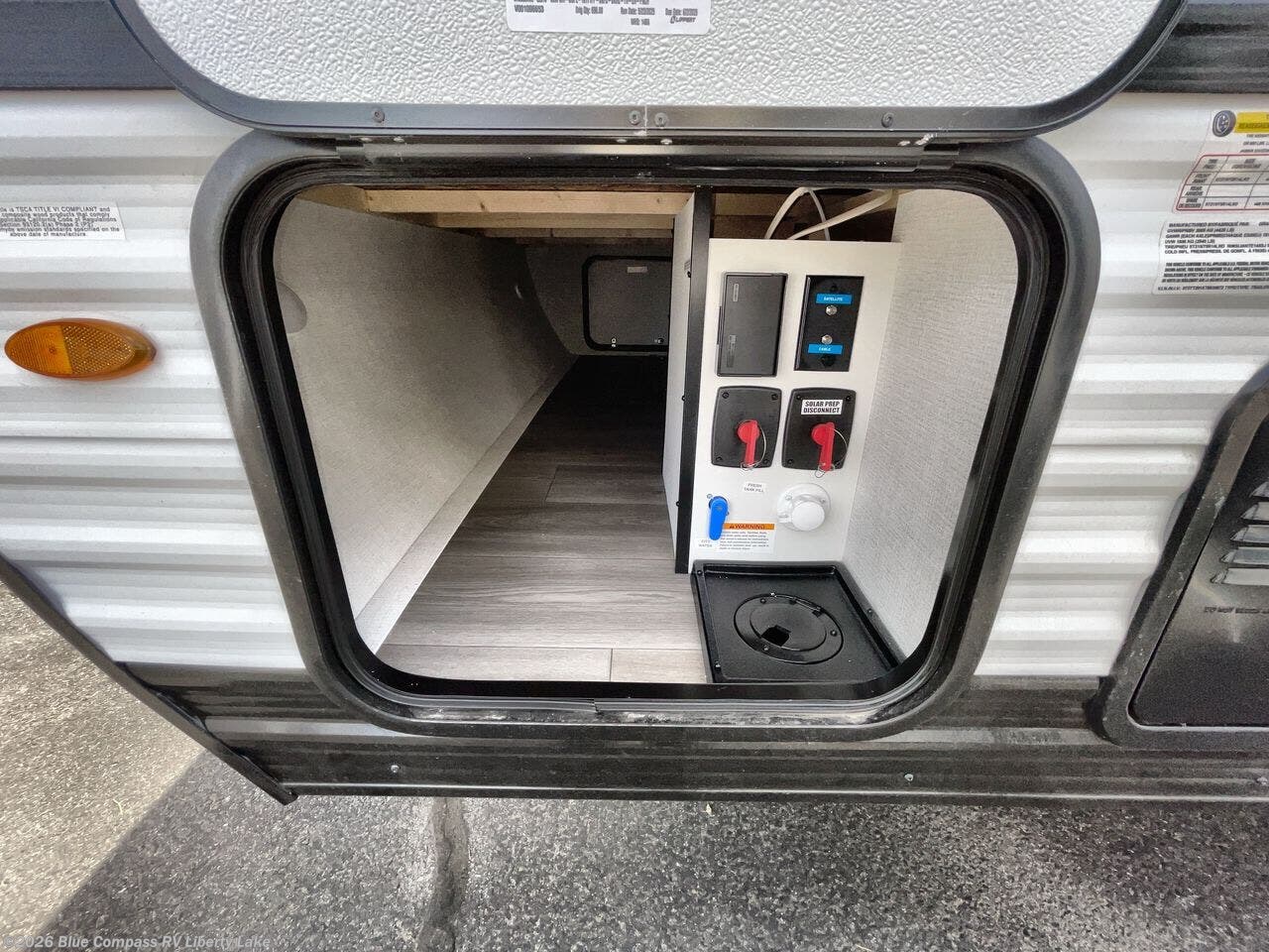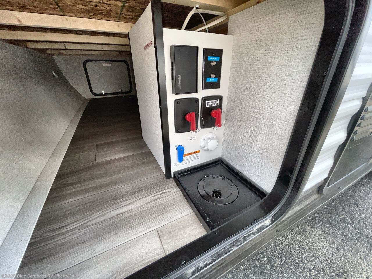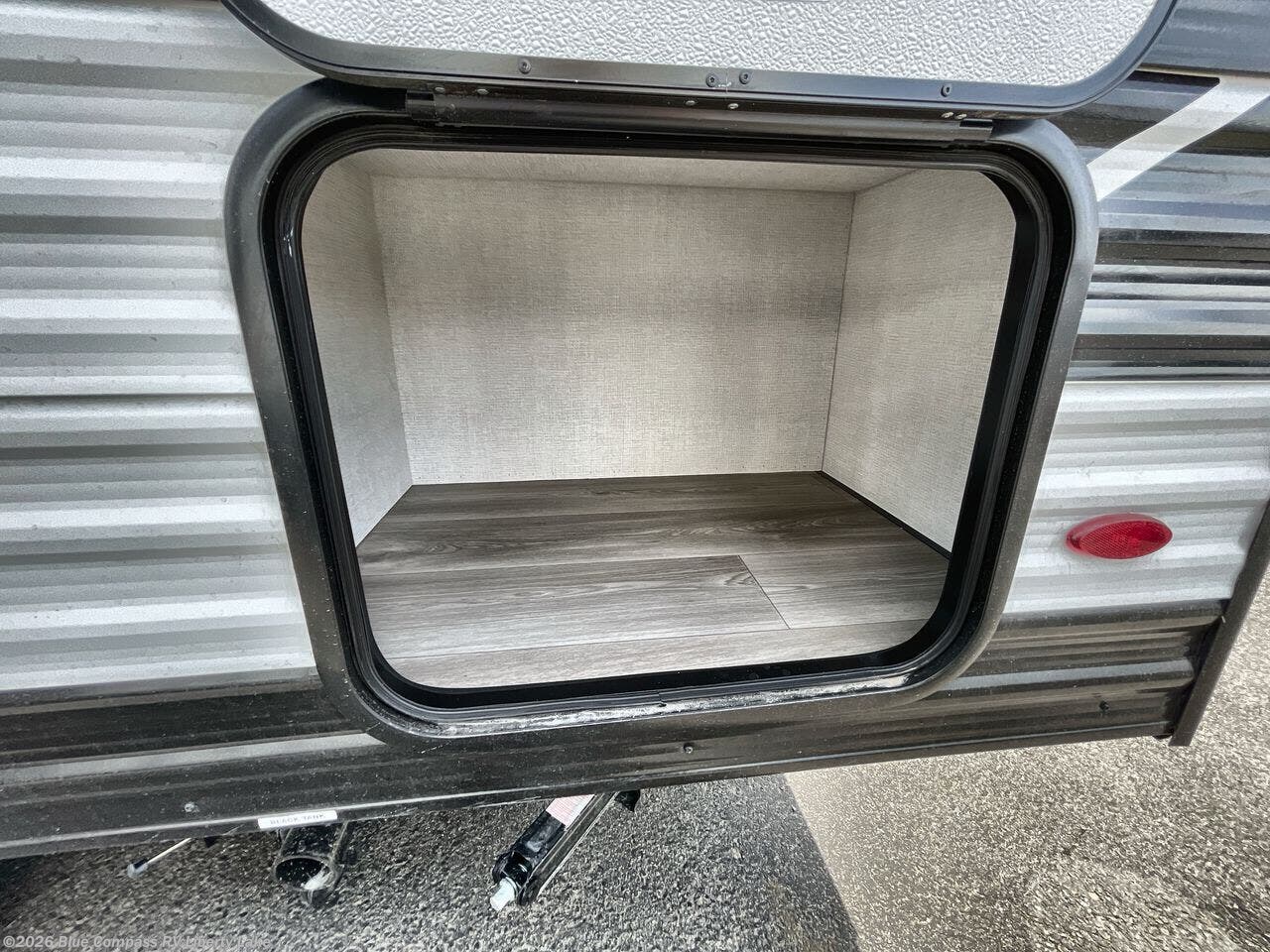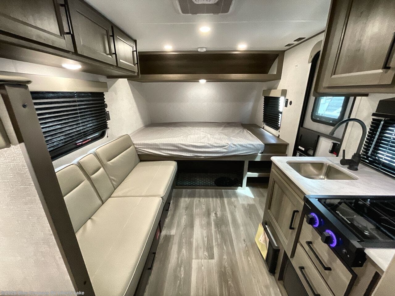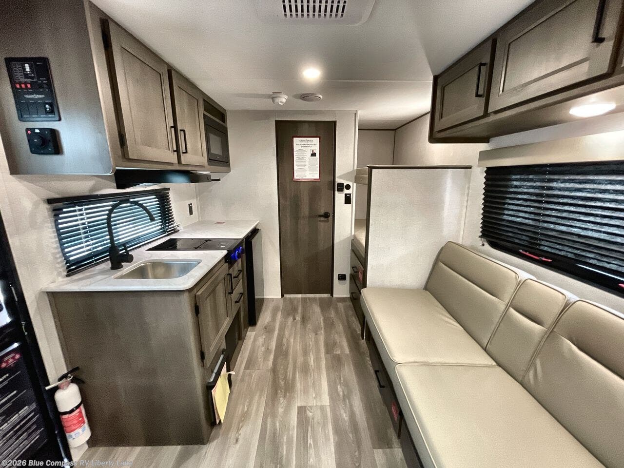 Camping trips to the lake have never been easier than with this travel trailer! The 28" x 67" bunks are right next to the private bath for easy nighttime use, and the front queen bed includes hidden storage for your things. There is also a 66" Jack knife sofa that provides a little more sleeping space for guests. A full kitchen lets you cook meals each day and there is an exterior LP quick connect if you want to fire up your own propane grill.