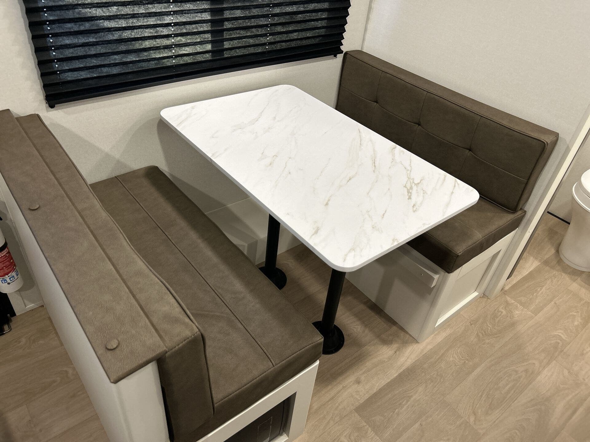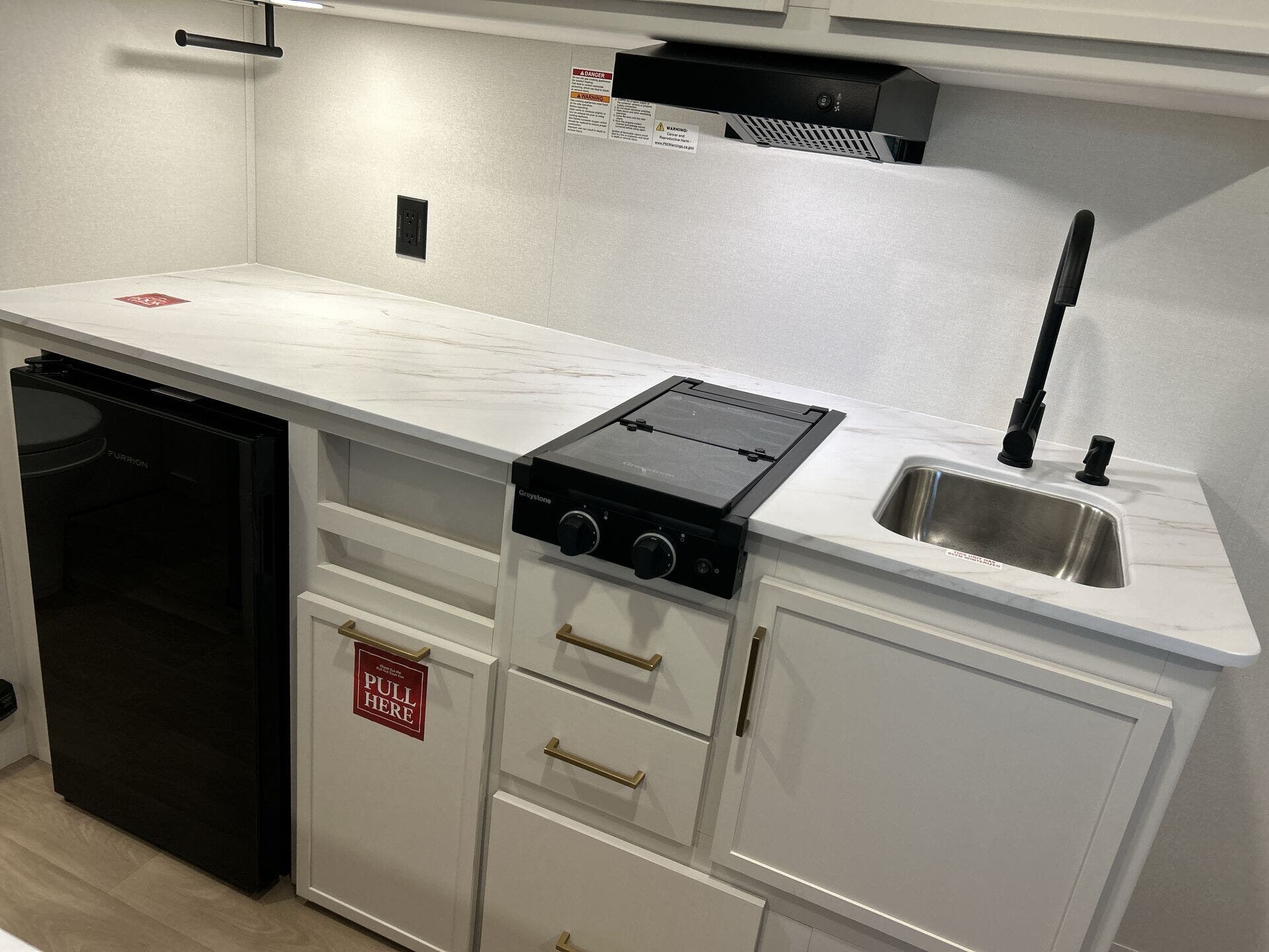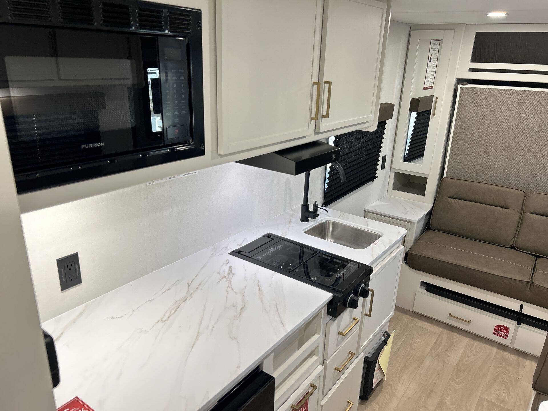 The 151RB floorplan showcases a Front Bedroom, Mid Kitchen, and Rear Bath, arranged to maximize usable space in a compact trailer. The absence of slide-outs contributes to straightforward setup, reduced maintenance, and predictable towing dynamics. This layout brings the bedroom forward for privacy, a central kitchen for convenient meal prep, and a rear bath for convenient access after a day of adventures.