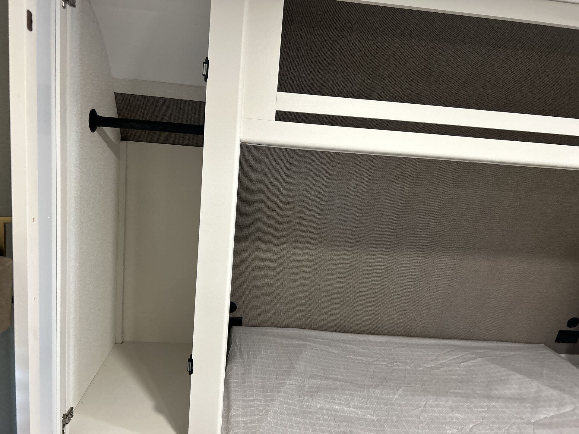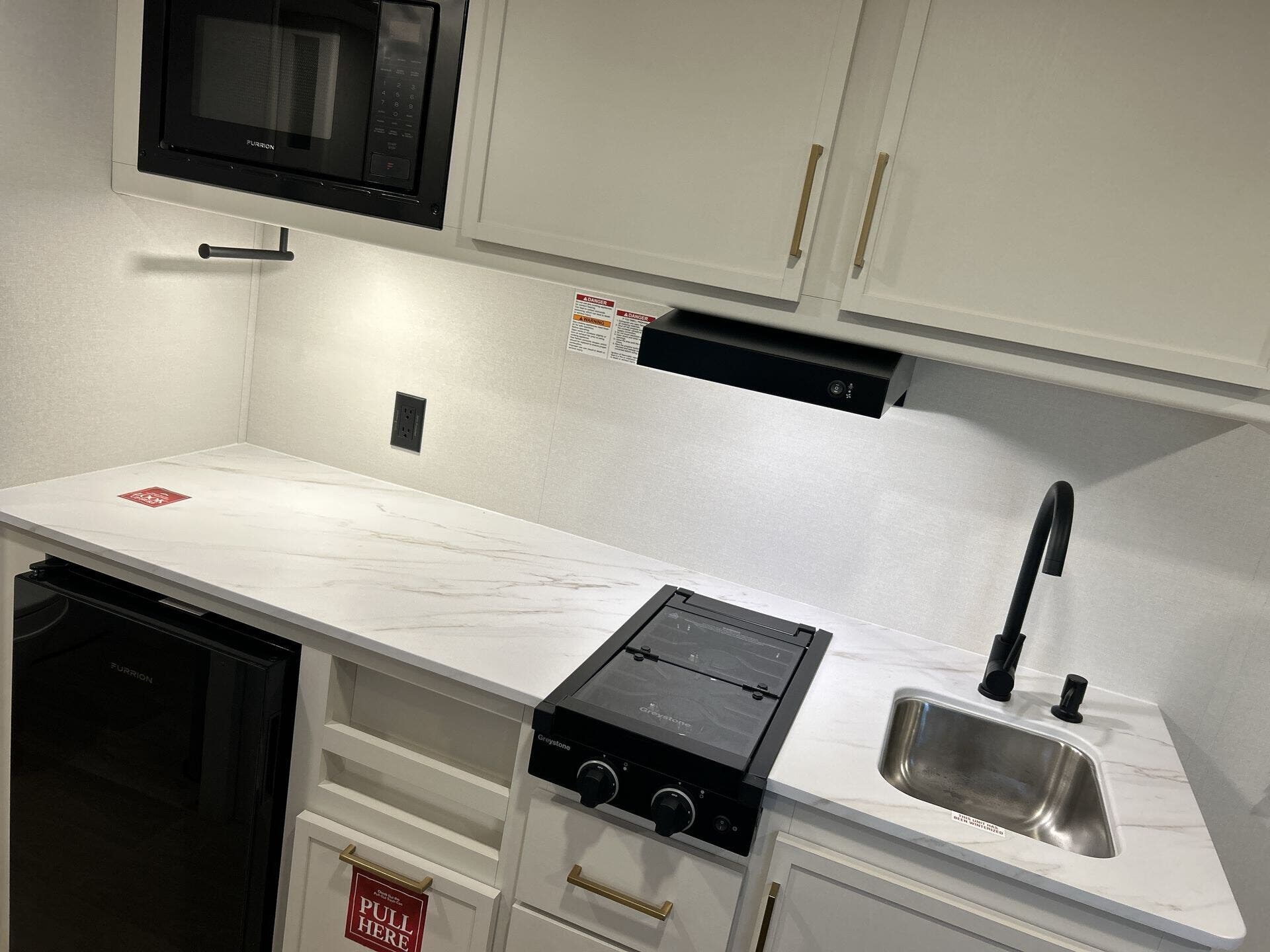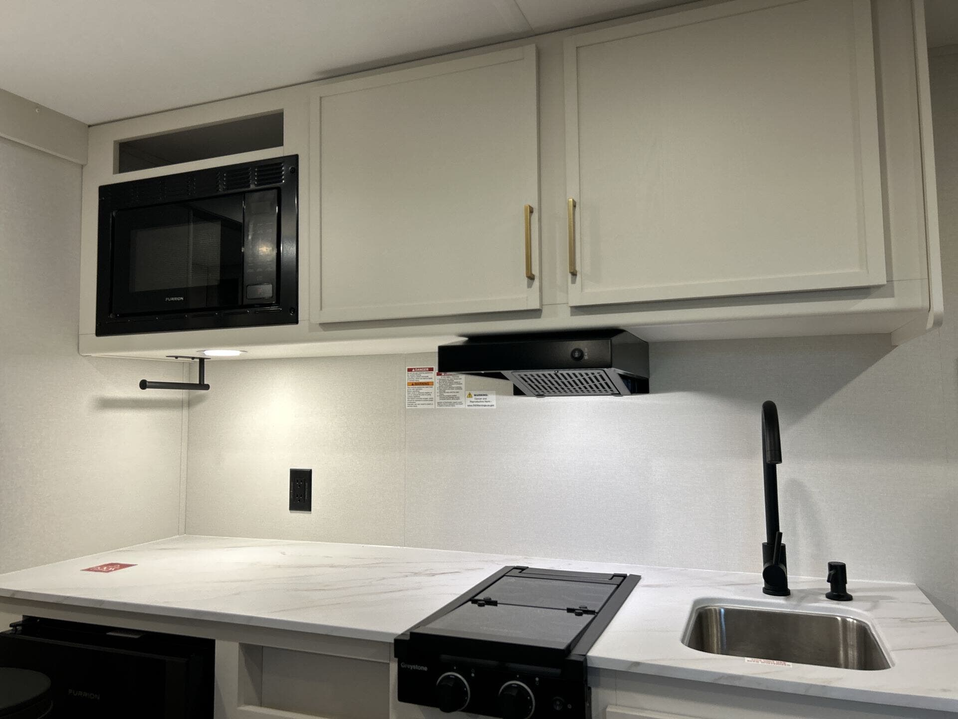 The 151RB floorplan showcases a Front Bedroom, Mid Kitchen, and Rear Bath, arranged to maximize usable space in a compact trailer. The absence of slide-outs contributes to straightforward setup, reduced maintenance, and predictable towing dynamics. This layout brings the bedroom forward for privacy, a central kitchen for convenient meal prep, and a rear bath for convenient access after a day of adventures.