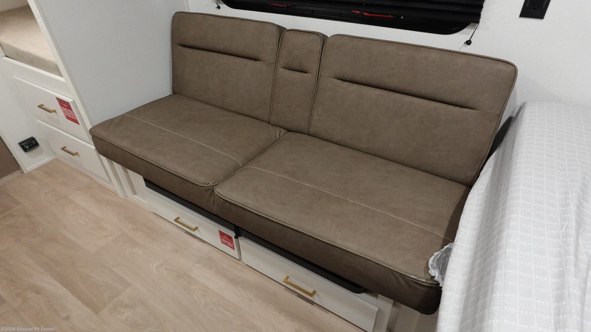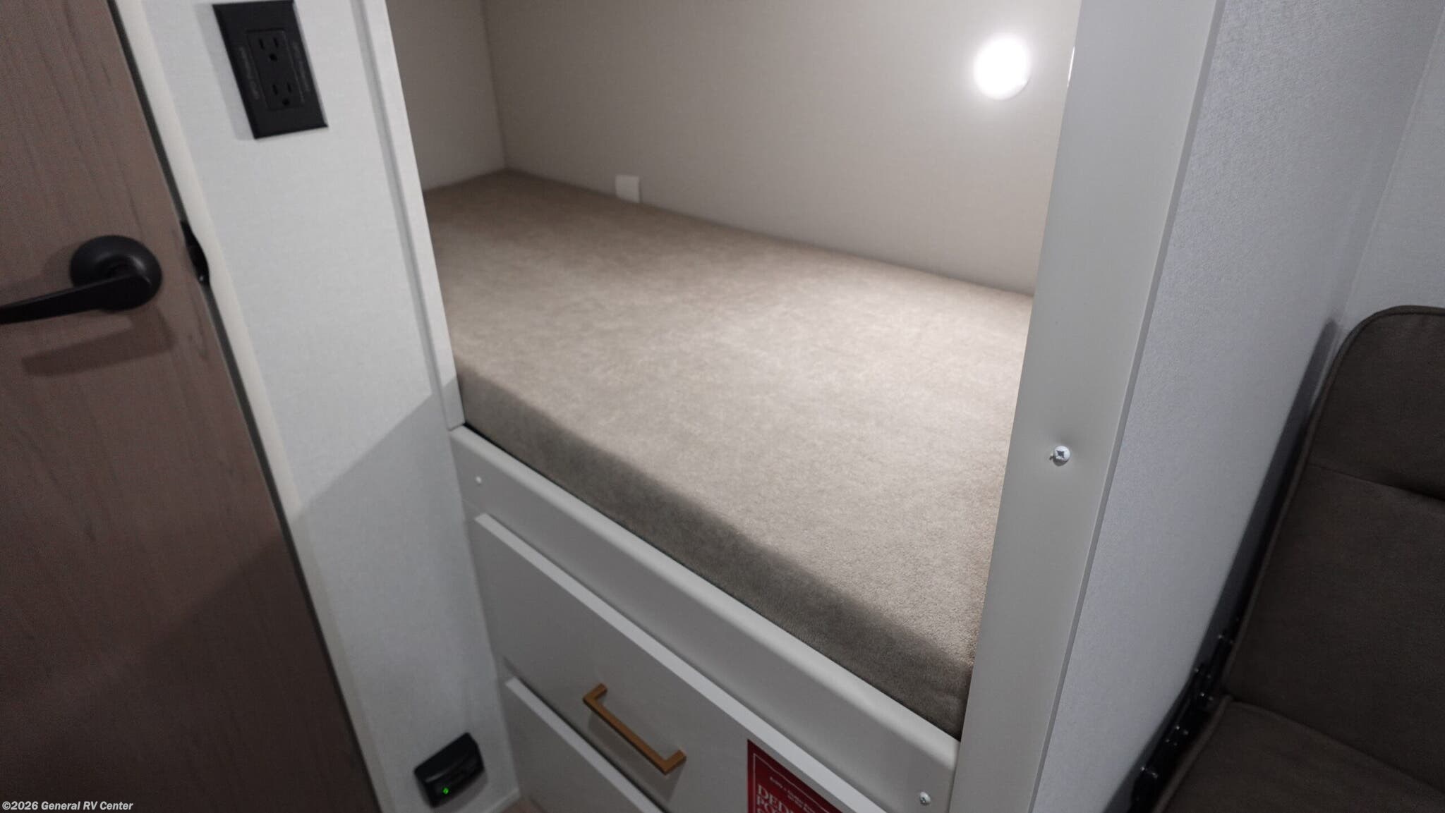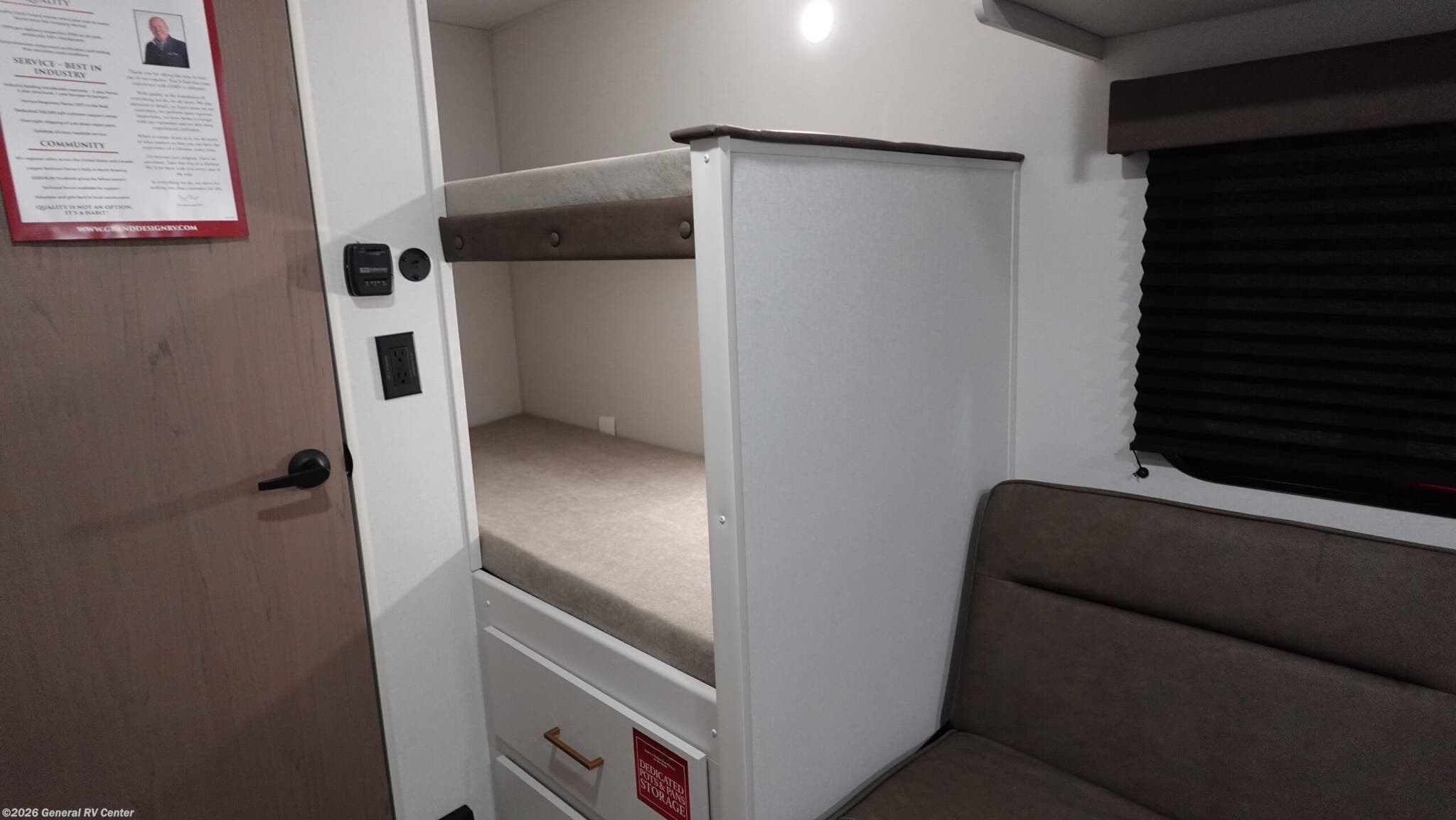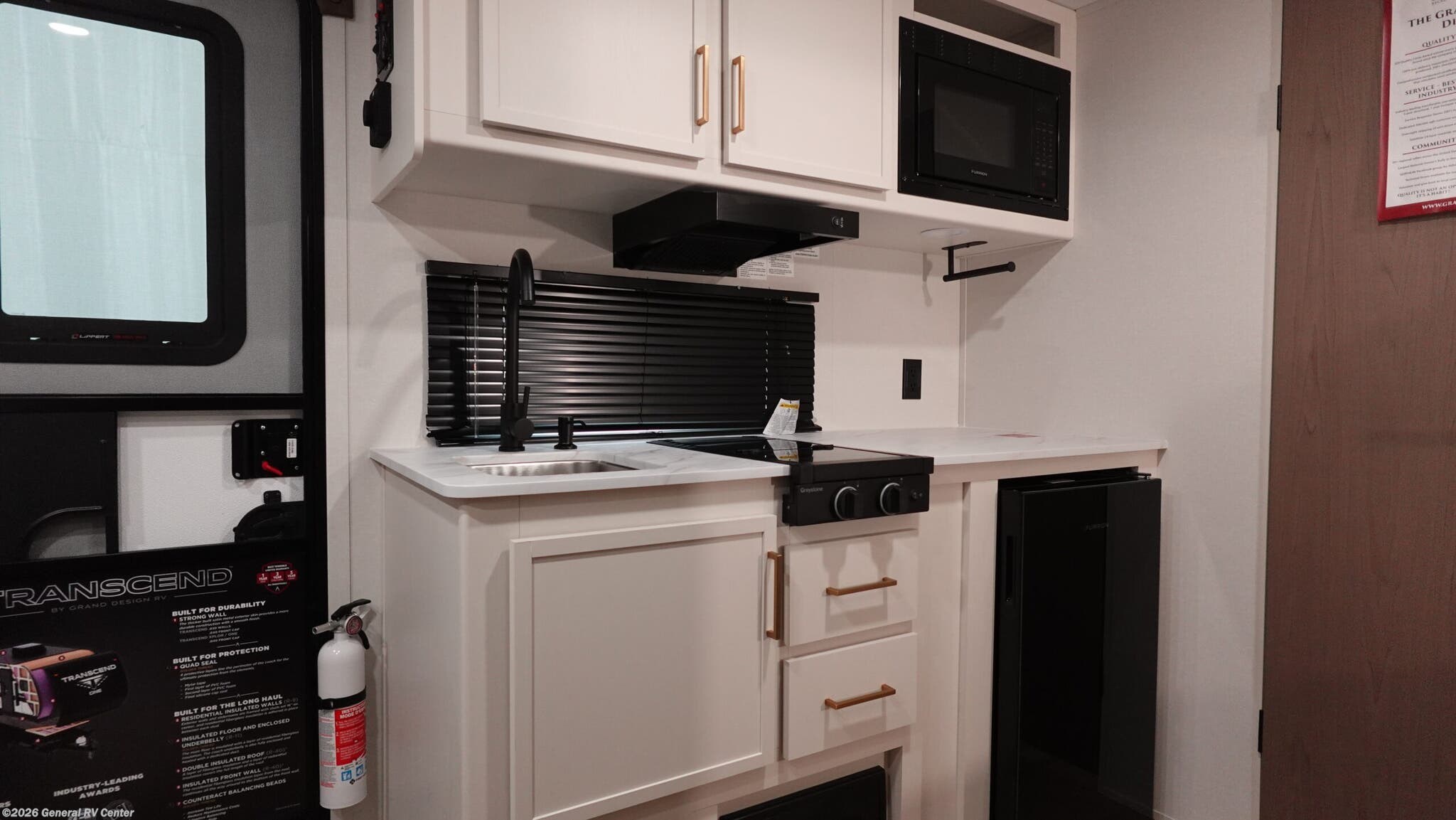 Experience the perfect blend of compact convenience and Grand Design quality with the 2026 Grand Design Transcend One 151BH travel trailer. This lightweight bunkhouse is engineered for easy towing and maximum adventure, making it an ideal choice for first-time RV owners or seasoned travelers looking to downsize without compromise. The smart design comfortably sleeps up to five people with a residential-size queen bed upfront and private, rear double-over-double bunks (28" x 67") perfect for kids or guests. A generous 6' 6" interior height ensures a spacious feel, while clever storage solutions, including an unobstructed pass-through compartment, maximize every inch of space. A fully equipped galley kitchen features residential countertops, a 2-burner cooktop, microwave, and a 12V glass-front refrigerator. Enjoy modern conveniences on the go including the power awning with LED lighting and exterior JBL speakers - perfect for campsite ambiance. Pet-friendly features like pull-out pet bowls and an exterior leash link ensure the whole family can enjoy the trip.