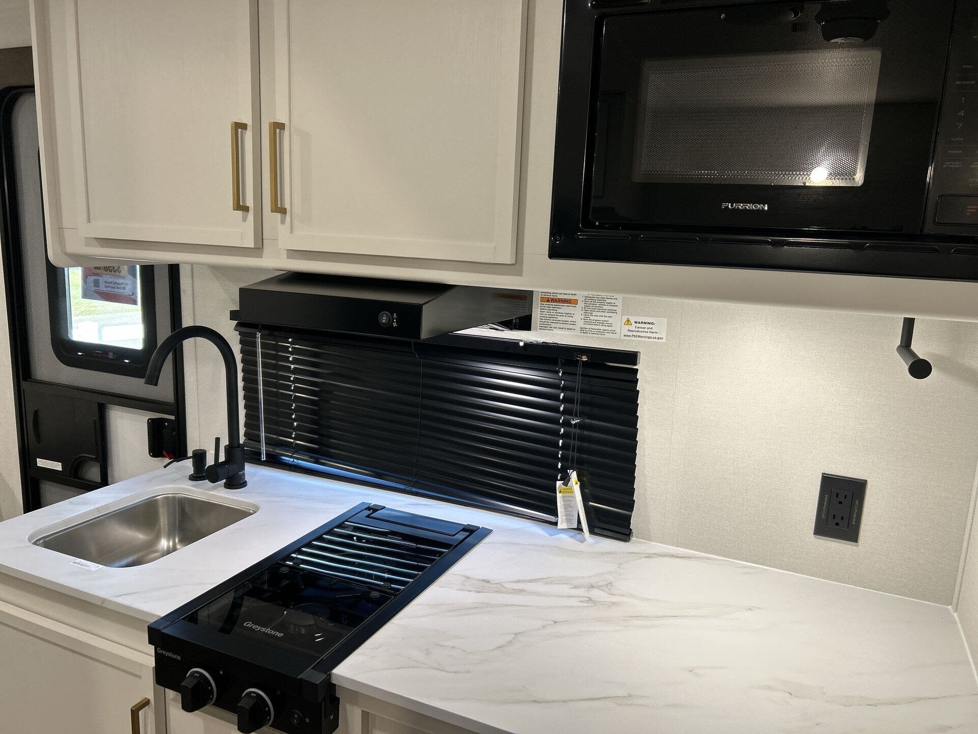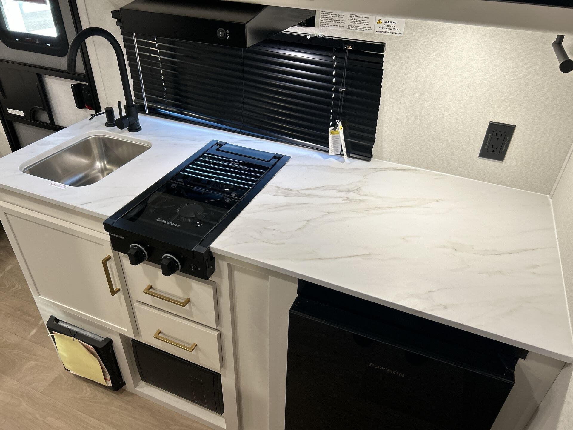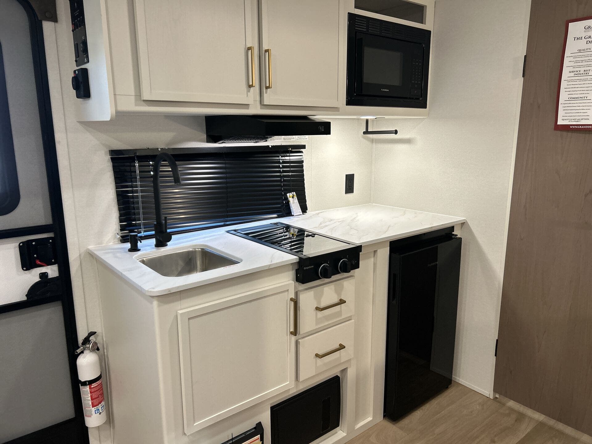 Designed for easy towing and versatile camping, the 151BH measures 19 feet 8 inches in length and stands 10 feet 3 inches tall, making it one of the most approachable Grand Design models for campgrounds and backcountry sites alike. It carries a gross vehicle weight rating of 4,420 pounds with a hitch weight of 442 pounds, supporting a reliable, balanced tow by mid-size SUVs and light trucks. The floorplan supports up to five sleepers and includes bunk beds, a private front bedroom with a queen bed, and a rear bath for added privacy. Water capacities are generous for its size: 37 gallons each for fresh, grey, and black water, while the unit features a single 8,000 BTU air conditioner to keep interior comfort consistent.