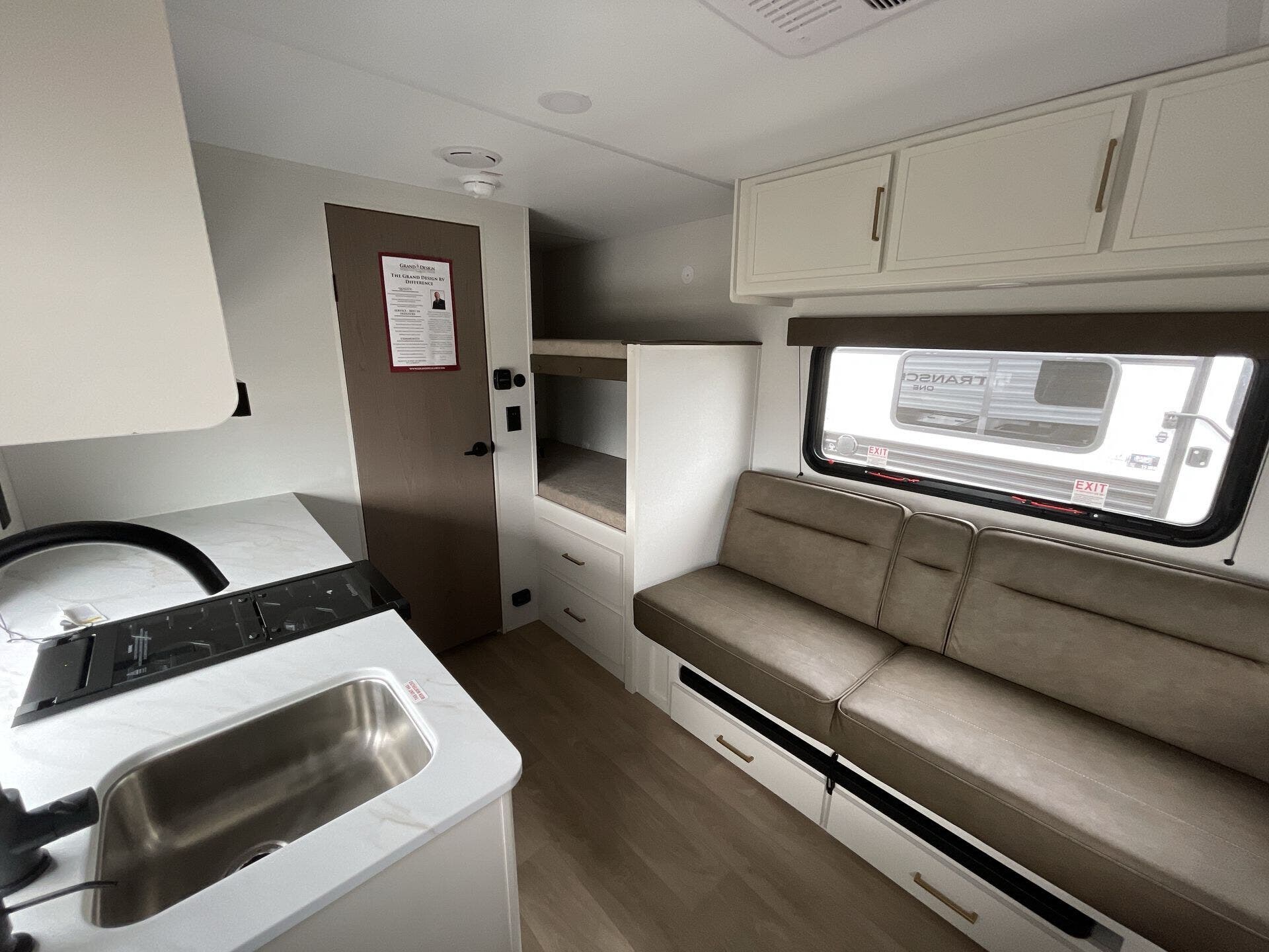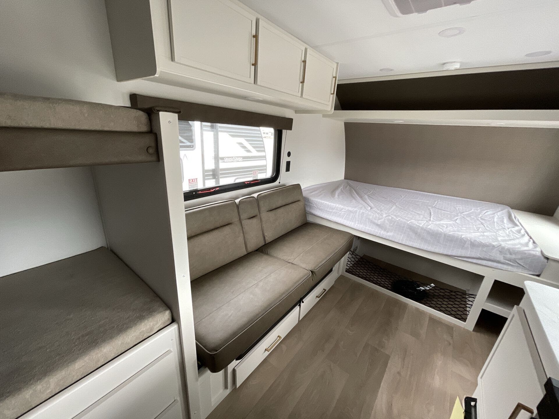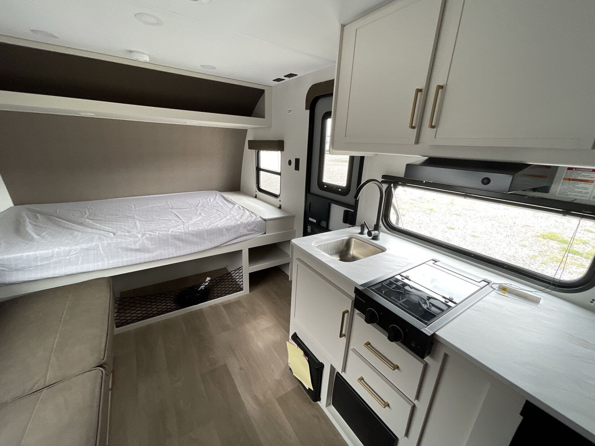 Inside, the 151BH maximizes every inch of space with a smart and functional layout. The rear bunk beds provide dedicated sleeping space for kids or guests, while the front bed offers a comfortable retreat for parents. A cozy dinette serves as both a dining area and an additional sleeping option, and the efficient kitchen is equipped with all the essentials, including a cooktop, refrigerator, microwave, and storage for your gear. Bright finishes and large windows create an open, welcoming atmosphere despite its compact footprint.