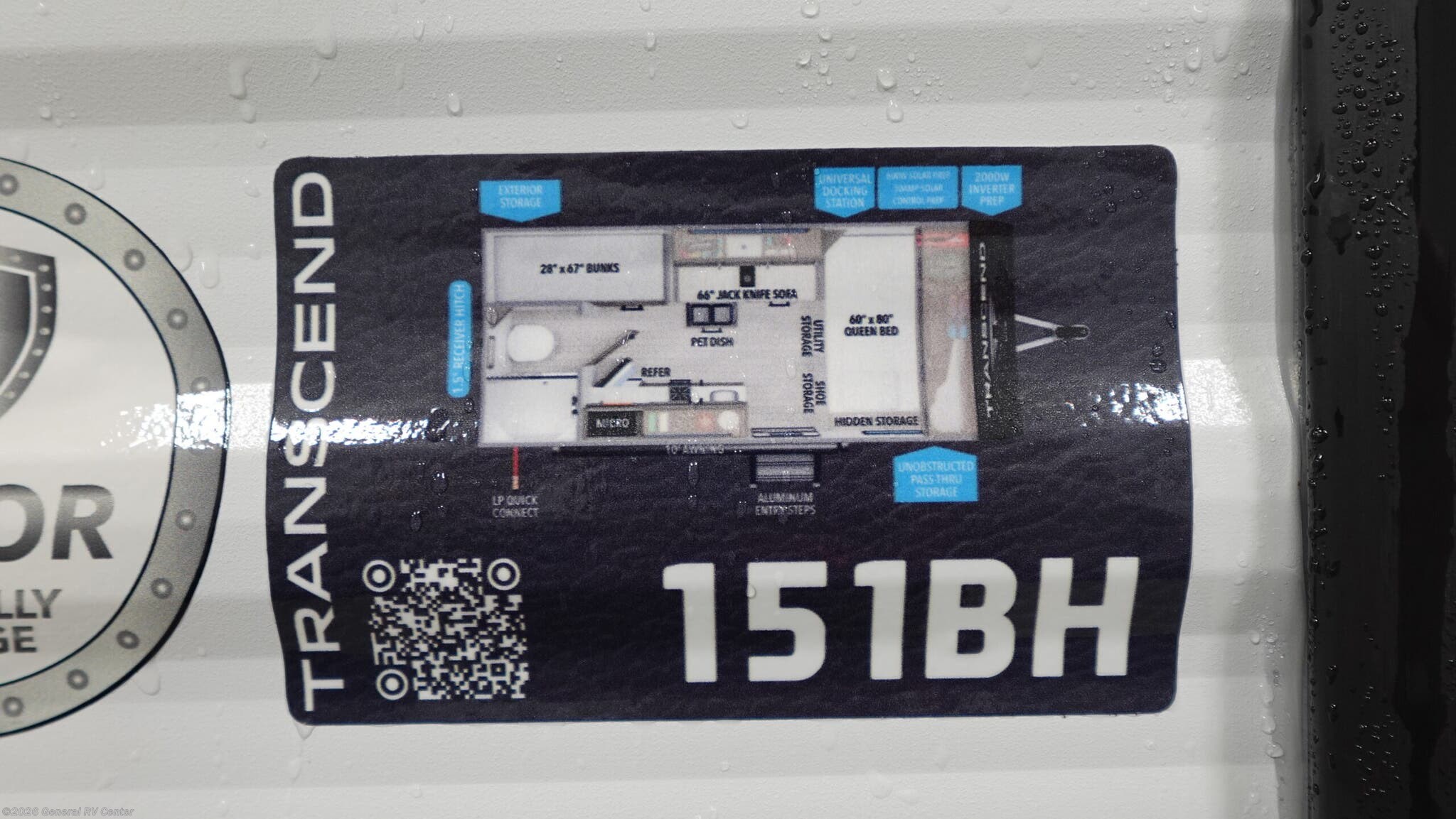 **Grand Design Transcend One travel trailer 151BH highlights:** - Bunk Beds - Unobstructed Pass-Thru Storage - Pet Dish - 10' Power Awning Camping trips to the lake have never been easier than with this travel trailer! The 28" x 67" bunks are right next to the private bath for easy nighttime use, and the front queen bed includes hidden storage for your things. There is also a 66" Jack knife sofa that provides a little more sleeping space for guests. A full kitchen lets you cook meals each day and there is an exterior LP quick connect if you want to fire up your own propane grill. With any Transcend One travel trailer by Grand Design, you will enjoy lightweight towing thanks to their single-axle. There are many interior comforts to make camping easier than ever, such as recessed lighting, residential countertops, and a 6' 6" interior height. Each model is constructed with a heated and enclosed underbelly with suspended tanks, a moisture barrier floor enclosure, and Thermofoil over the roof and front cap for added protection. And a JBL sound system will let you listen to tunes as you visit under the power awning with a Fusion light!