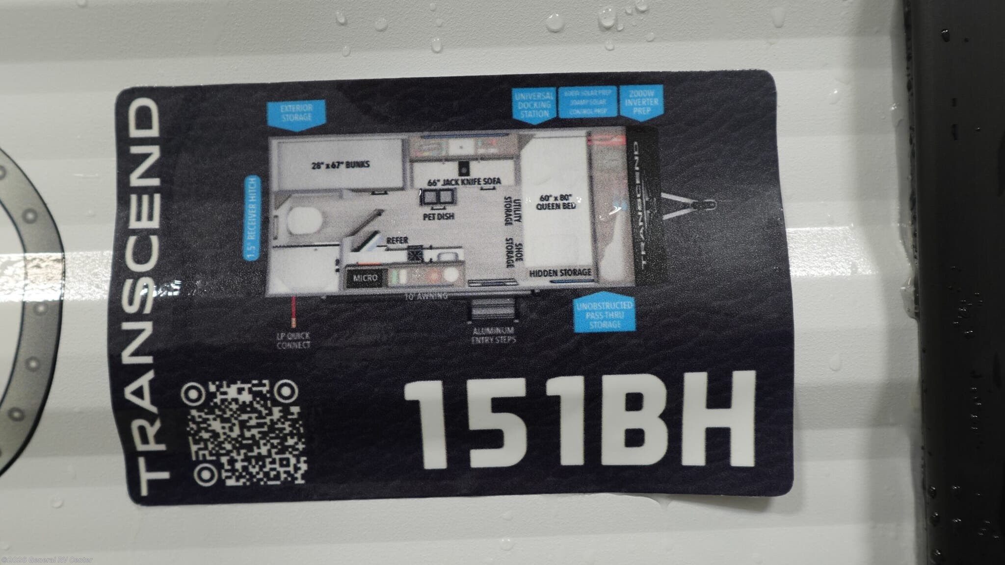 **Grand Design Transcend One travel trailer 151BH highlights:** - Bunk Beds - Unobstructed Pass-Thru Storage - Pet Dish - 10' Power Awning Camping trips to the lake have never been easier than with this travel trailer! The 28" x 67" bunks are right next to the private bath for easy nighttime use, and the front queen bed includes hidden storage for your things. There is also a 66" Jack knife sofa that provides a little more sleeping space for guests. A full kitchen lets you cook meals each day and there is an exterior LP quick connect if you want to fire up your own propane grill. With any Transcend One travel trailer by Grand Design, you will enjoy lightweight towing thanks to their single-axle. There are many interior comforts to make camping easier than ever, such as recessed lighting, residential countertops, and a 6' 6" interior height. Each model is constructed with a heated and enclosed underbelly with suspended tanks, a moisture barrier floor enclosure, and Thermofoil over the roof and front cap for added protection. And a JBL sound system will let you listen to tunes as you visit under the power awning with a Fusion light!