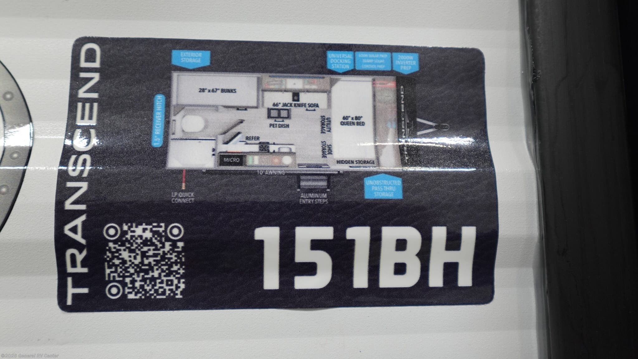 **Grand Design Transcend One travel trailer 151BH highlights:** - Bunk Beds - Unobstructed Pass-Thru Storage - Pet Dish - 10' Power Awning Camping trips to the lake have never been easier than with this travel trailer! The 28" x 67" bunks are right next to the private bath for easy nighttime use, and the front queen bed includes hidden storage for your things. There is also a 66" Jack knife sofa that provides a little more sleeping space for guests. A full kitchen lets you cook meals each day and there is an exterior LP quick connect if you want to fire up your own propane grill. With any Transcend One travel trailer by Grand Design, you will enjoy lightweight towing thanks to their single-axle. There are many interior comforts to make camping easier than ever, such as recessed lighting, residential countertops, and a 6' 6" interior height. Each model is constructed with a heated and enclosed underbelly with suspended tanks, a moisture barrier floor enclosure, and Thermofoil over the roof and front cap for added protection. And a JBL sound system will let you listen to tunes as you visit under the power awning with a Fusion light!