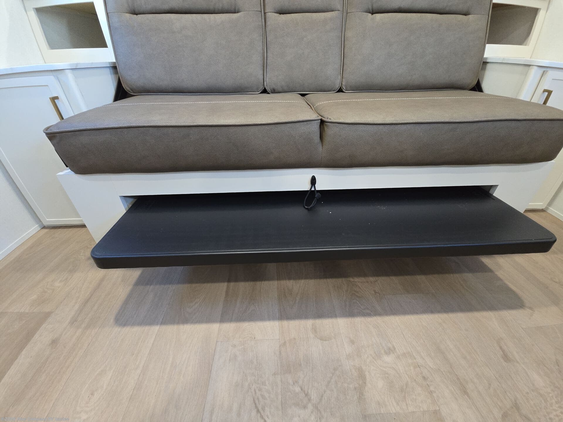 This is the perfect couple's trailer with versatile seating and sleeping space! You'll find a queen-size Murphy bed up front with storage space beside and above plus a full rear bath for added privacy. Once you've made lunch in the full kitchen, you can dine at the booth dinette or take your plate outdoors to sit under the 10' power awning. You'll also find pass-thru storage outside that will be perfect for fishing poles, lawn chairs, tools and more!