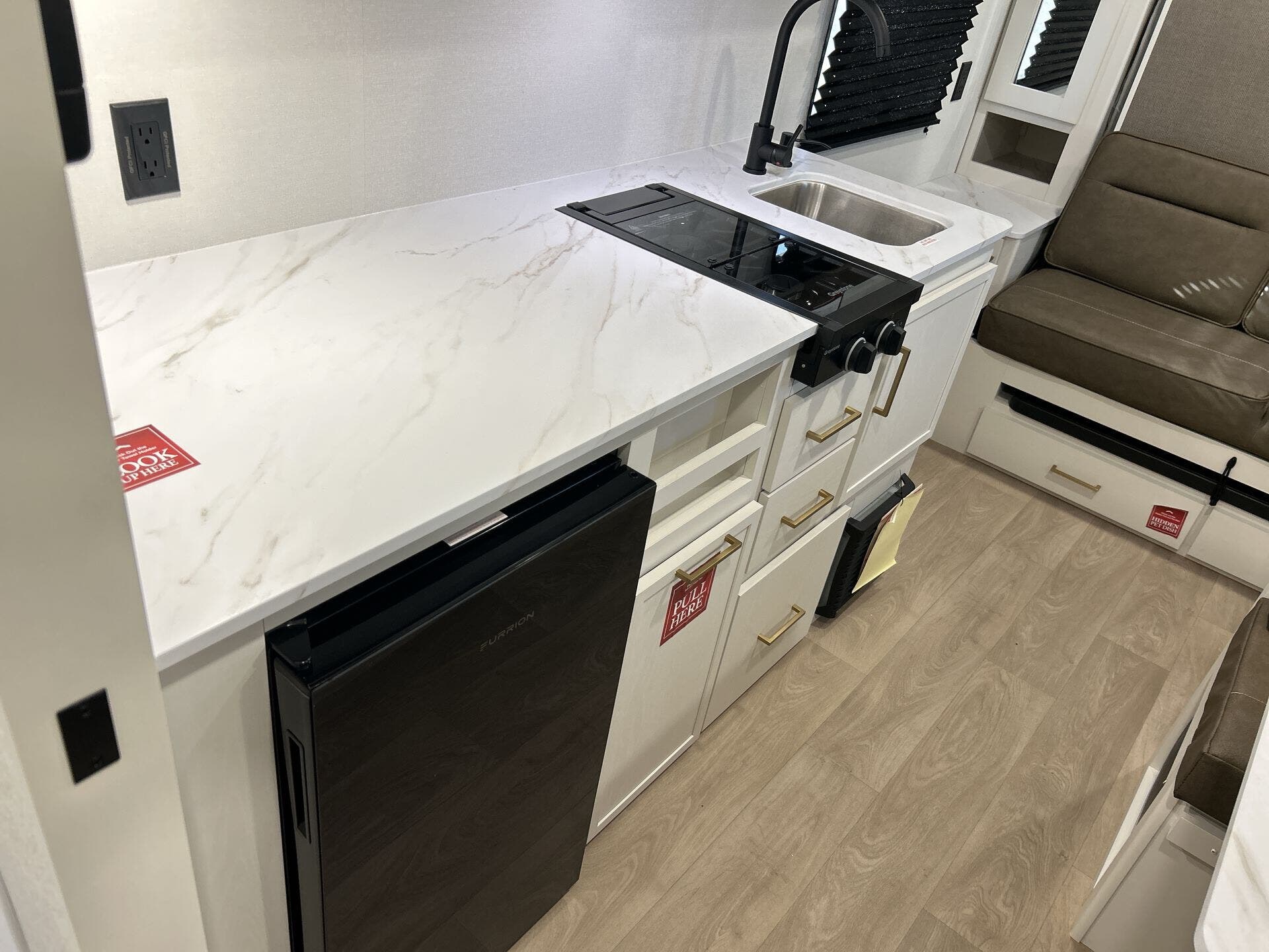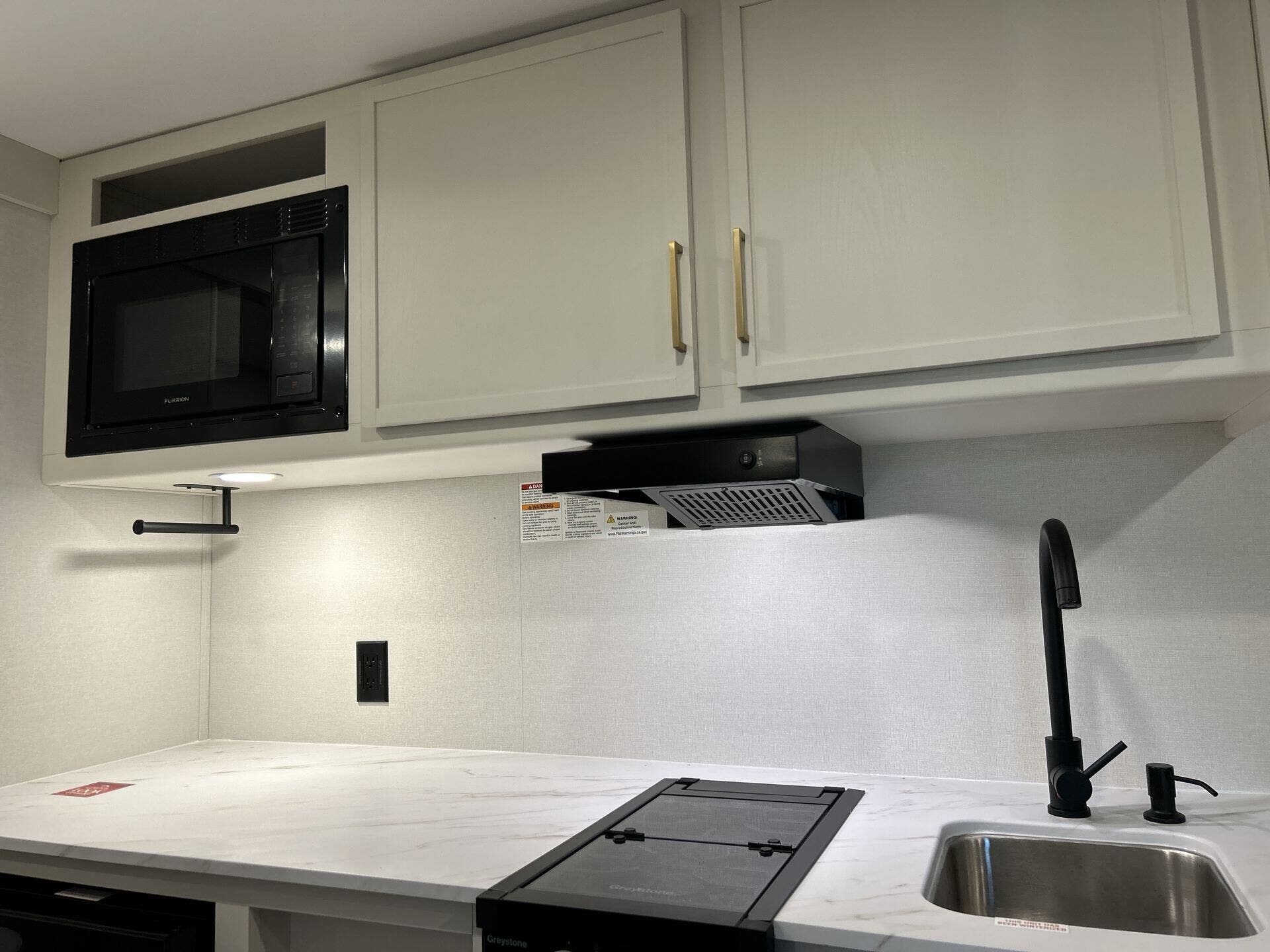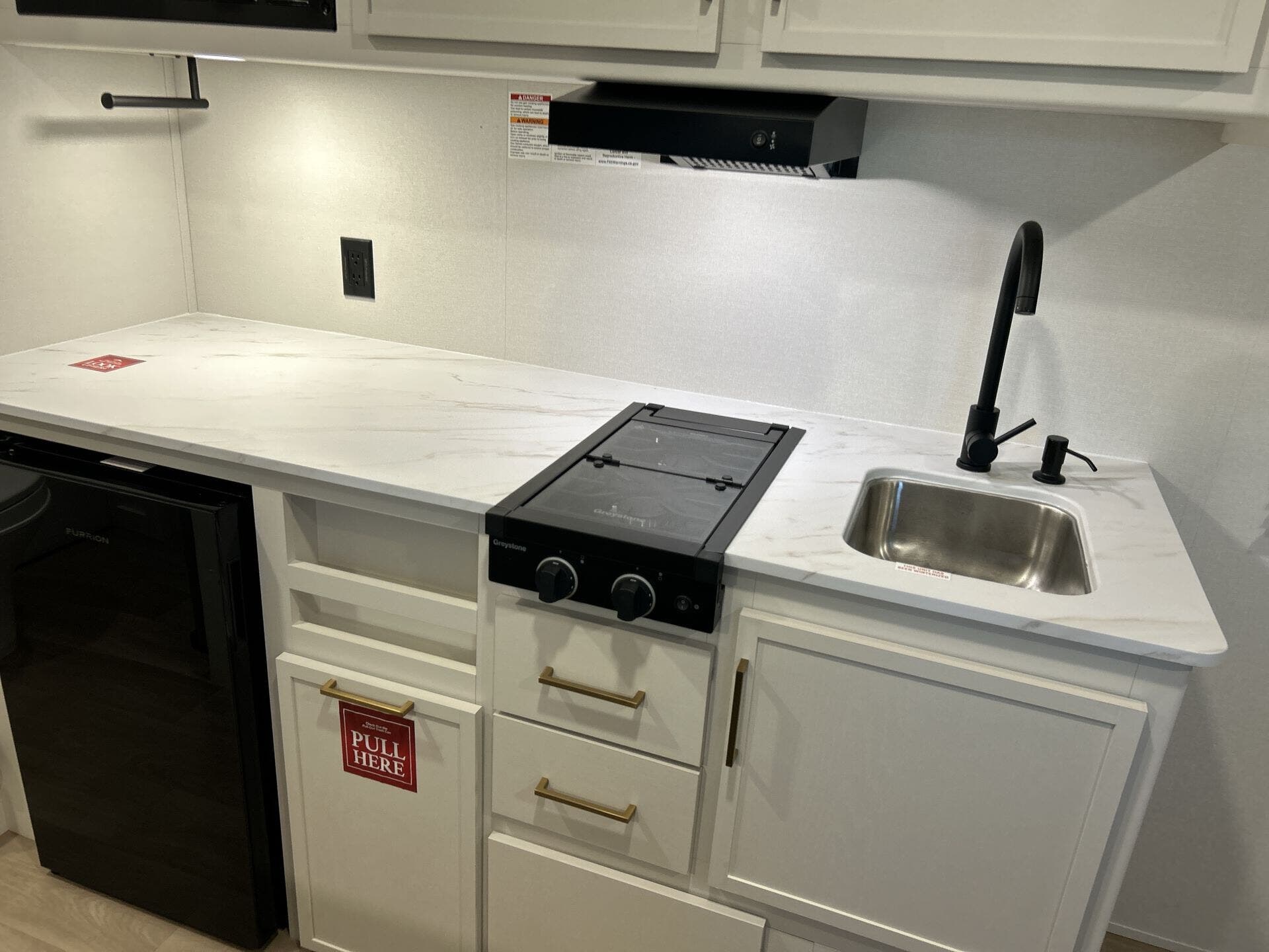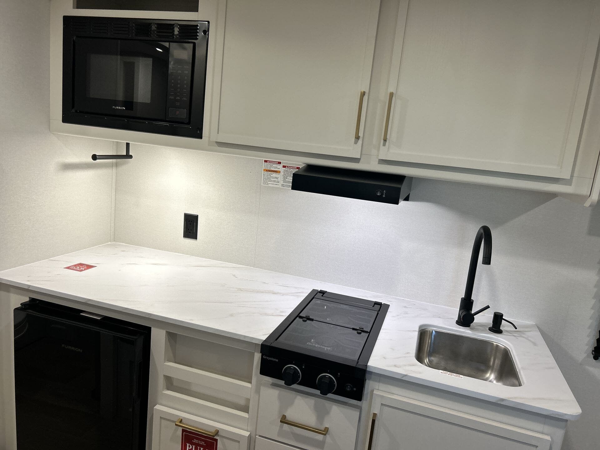 - Convection microwave, refrigerator, and stove top burner for versatile cooking