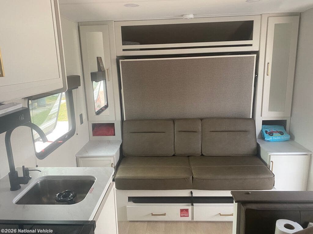 Inside, you?ll find a flexible living space with a queen Murphy bed that transforms into a cozy seating area by day, a full rear bathroom for privacy and convenience, and a well-equipped kitchen that makes meal prep a breeze.