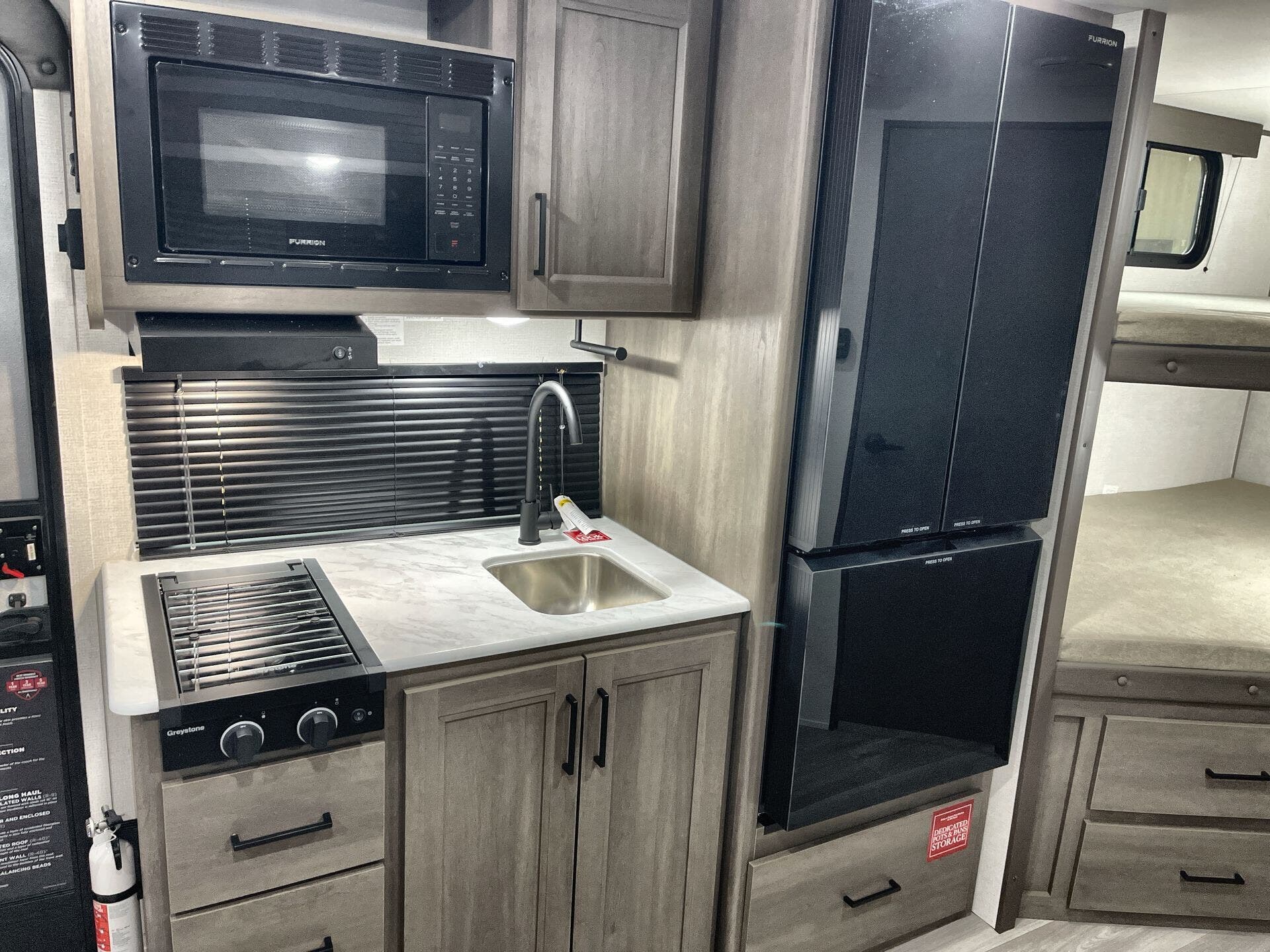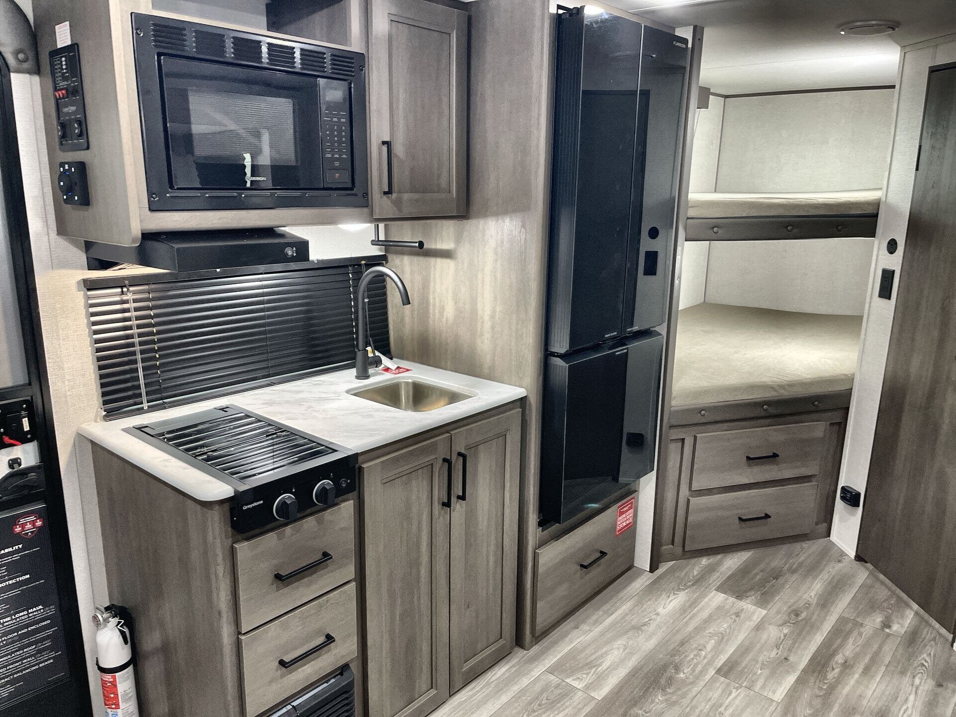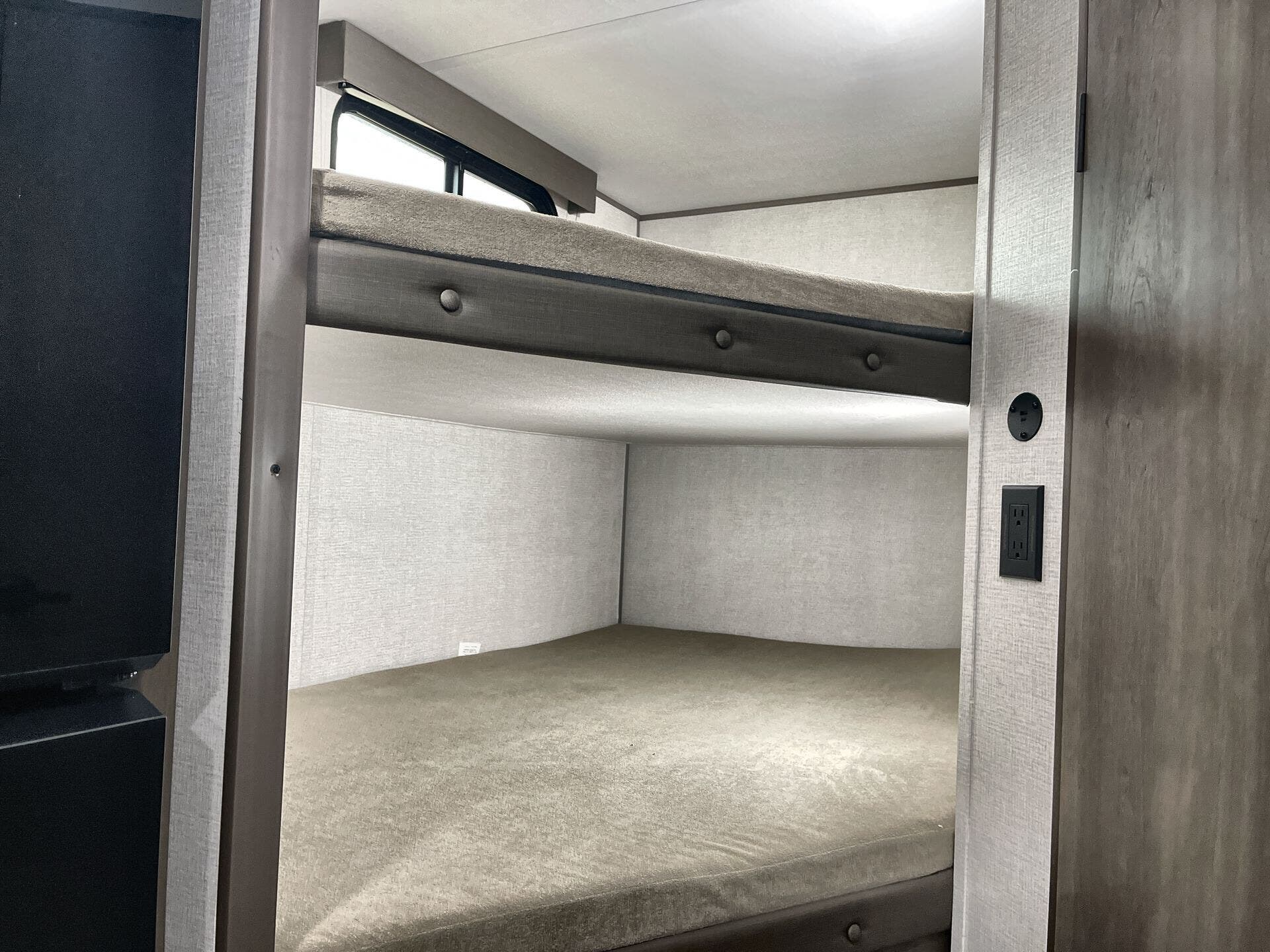 The 161BH floorplan places a practical bunkhouse configuration beside a welcoming front bedroom and a rear bath, with a mid-kitchen zone for convenient meal prep. The bunk beds provide space for kids or guests, while a comfortable queen bed in the front area ensures private nightly rest. A single slide-out broadens the living space, creating a roomy feel without expanding the trailer’s footprint. This layout is ideal for families seeking separation between sleeping areas and daily living spaces while keeping overall length manageable for easier travel.