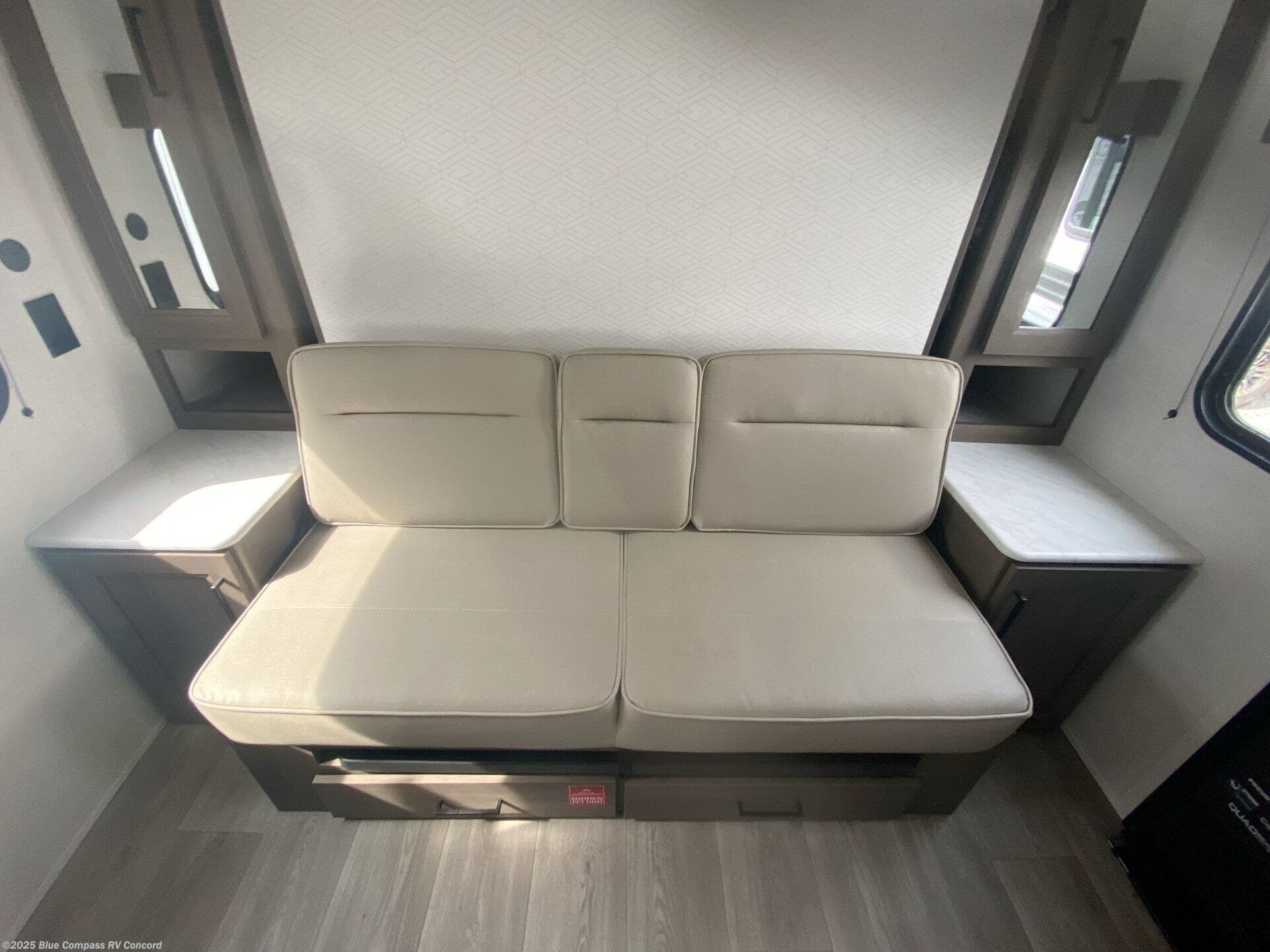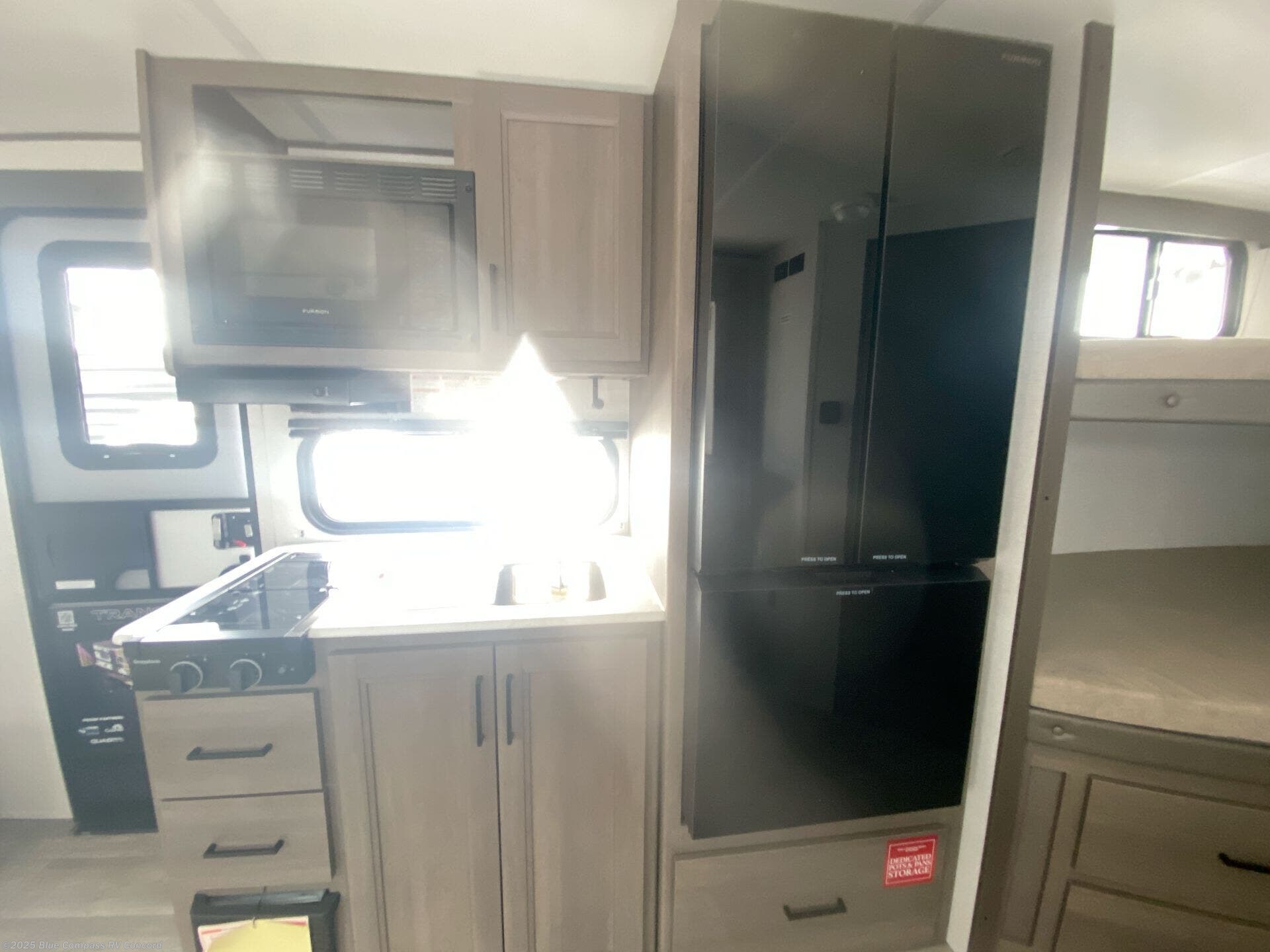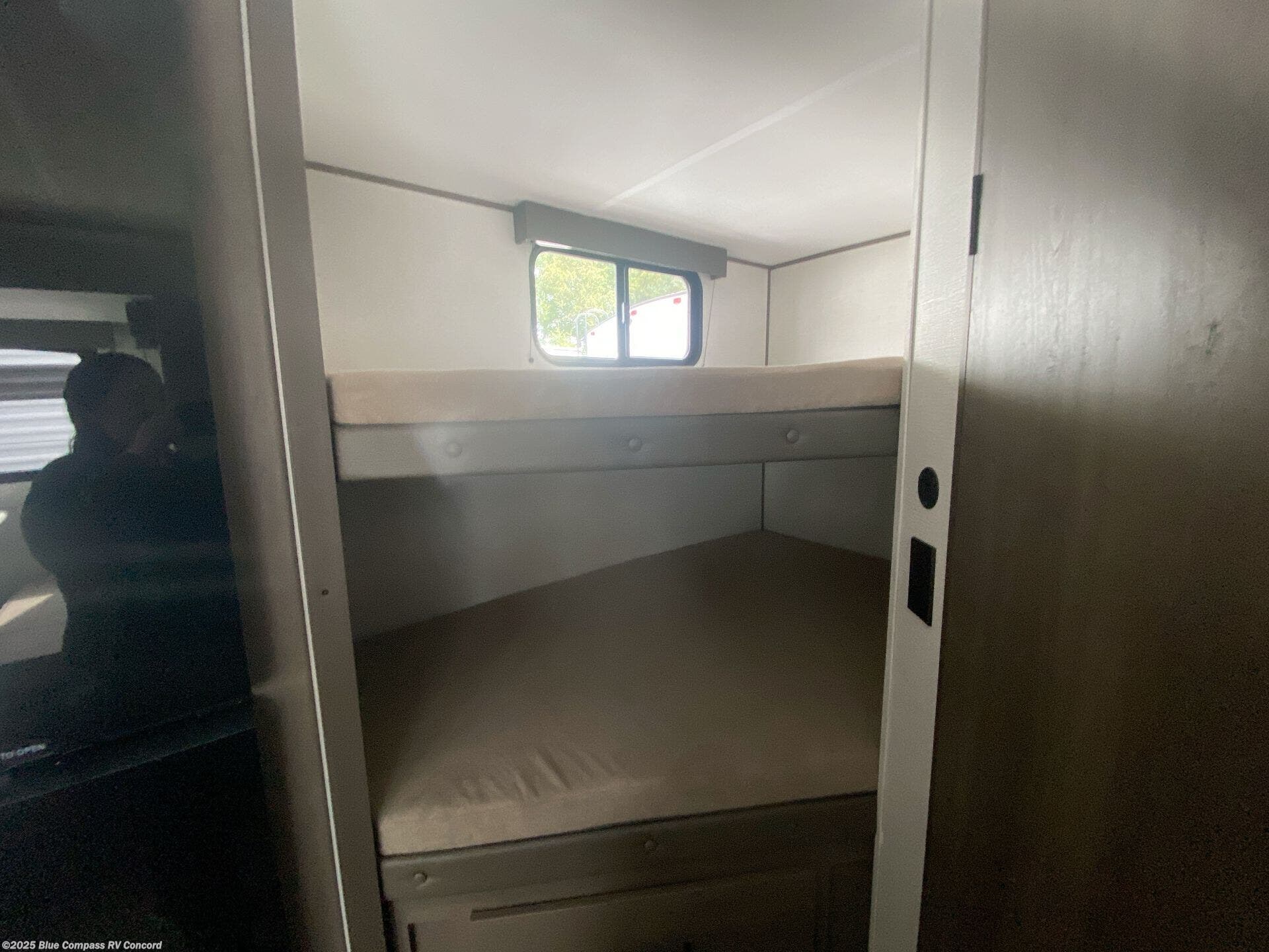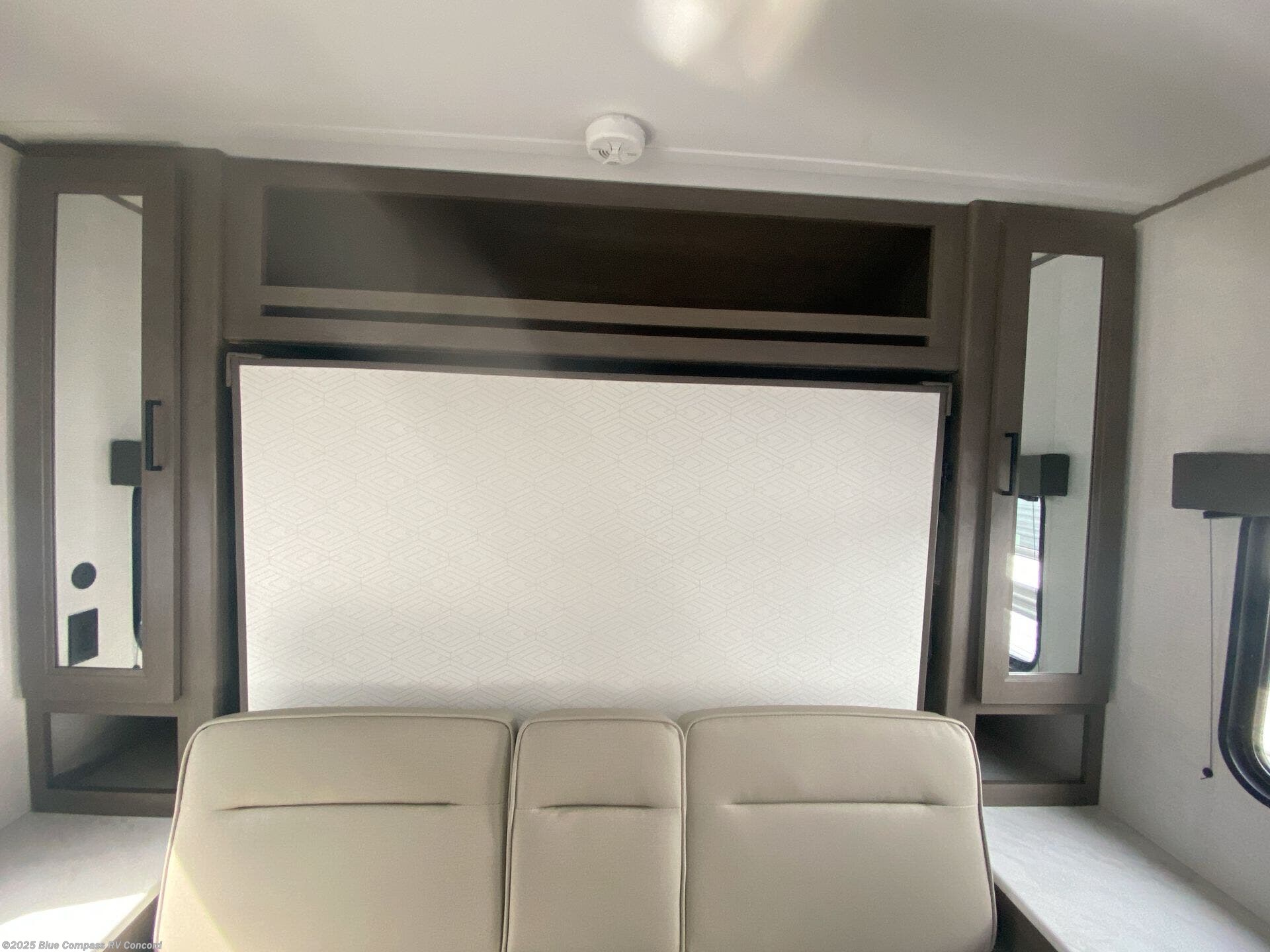 Spacious and versatile, this travel trailer is perfect for weekend trips to the campground or weeklong visits to the lake! There is a front Murphy bed with storage on both sides plus a pull-out pet drawer to keep your furry friends happy. Your guests or little ones will love the double-size bunks with privacy curtains, and the full bath is right next to the bunks for easy nighttime use. Once you make breakfast on the two burner range, you can dine at the booth dinette slide. And this model also includes an outdoor griddle and refrigerator if you want to make breakfast outdoors. Additional exterior features include a 16' power awning, an interior/exterior table, and a pass-thru storage for larger camp gear.