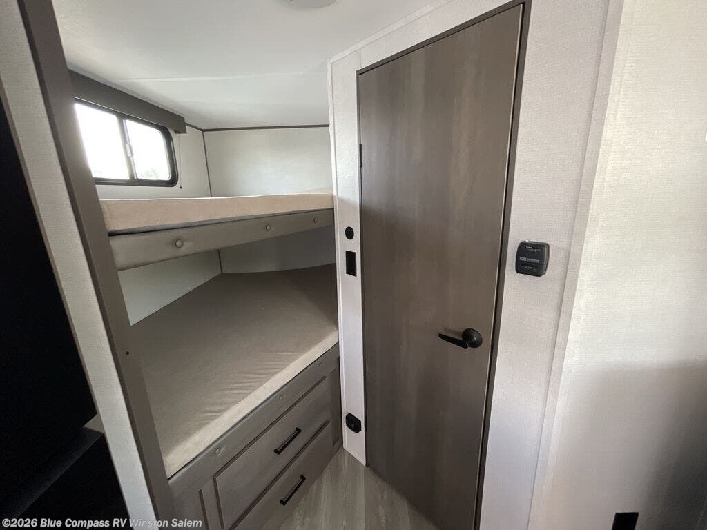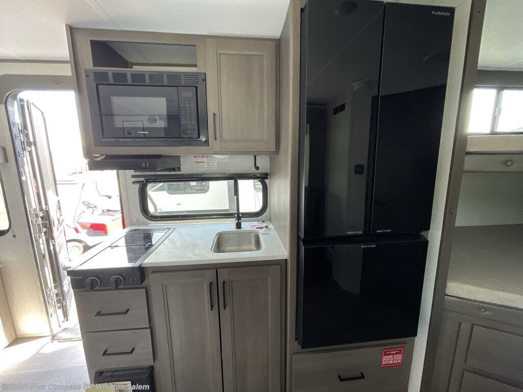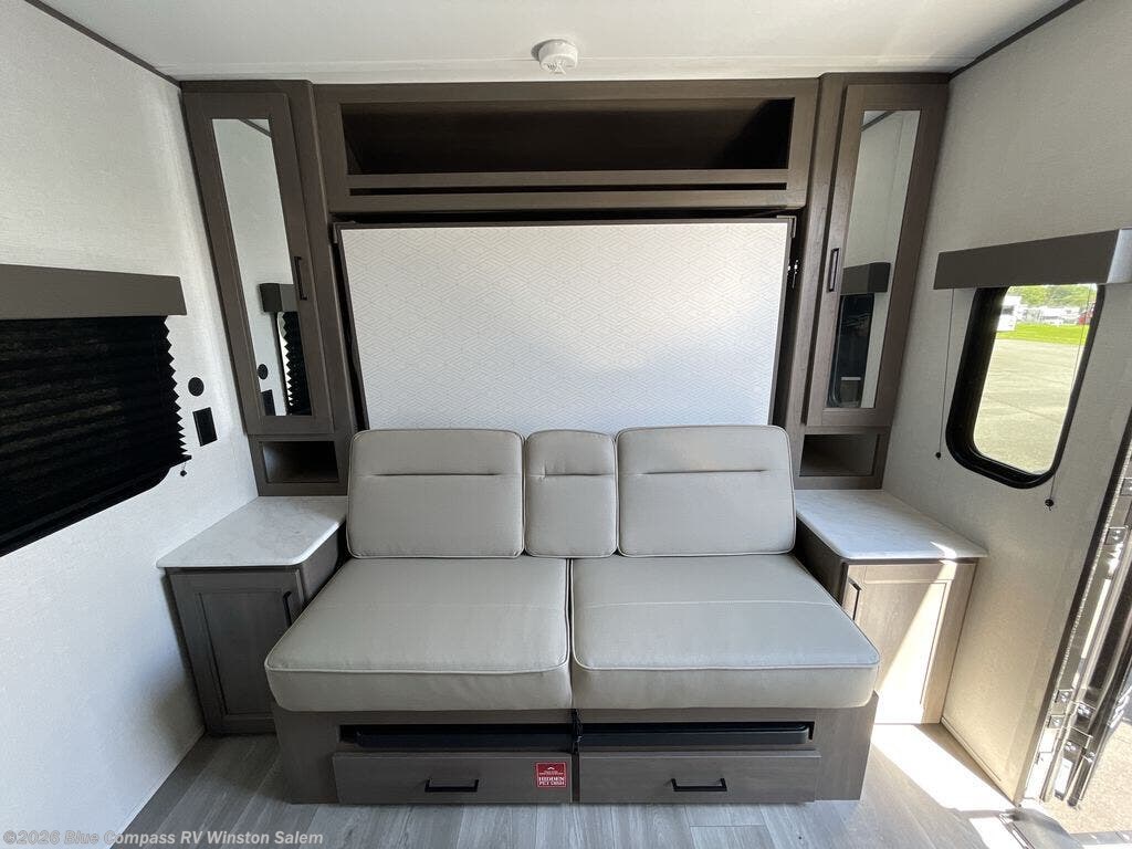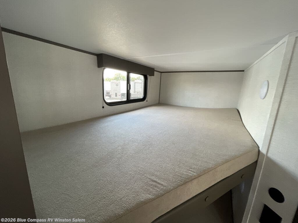 Spacious and versatile, this travel trailer is perfect for weekend trips to the campground or weeklong visits to the lake! There is a front Murphy bed with storage on both sides plus a pull-out pet drawer to keep your furry friends happy. Your guests or little ones will love the double-size bunks with privacy curtains, and the full bath is right next to the bunks for easy nighttime use. Once you make breakfast on the two burner range, you can dine at the booth dinette slide. And this model also includes an outdoor griddle and refrigerator if you want to make breakfast outdoors. Additional exterior features include a 16' power awning, an interior/exterior table, and a pass-thru storage for larger camp gear.