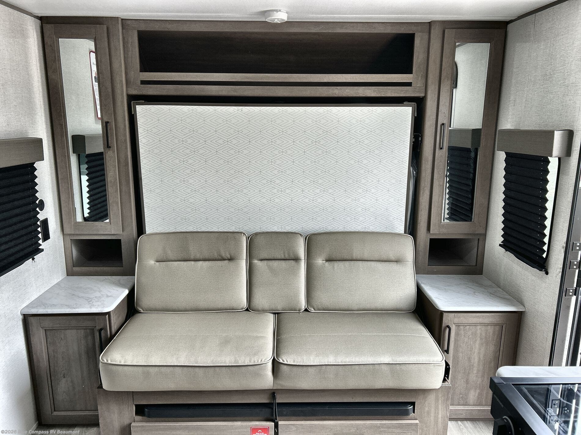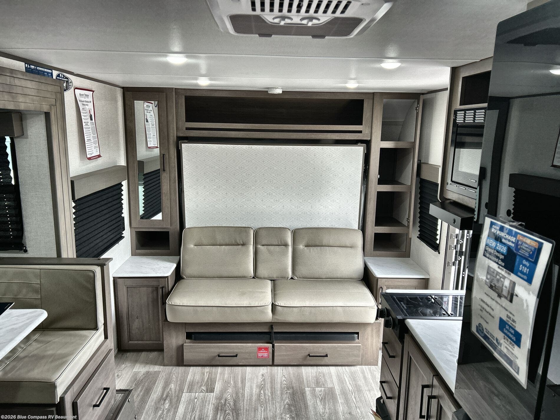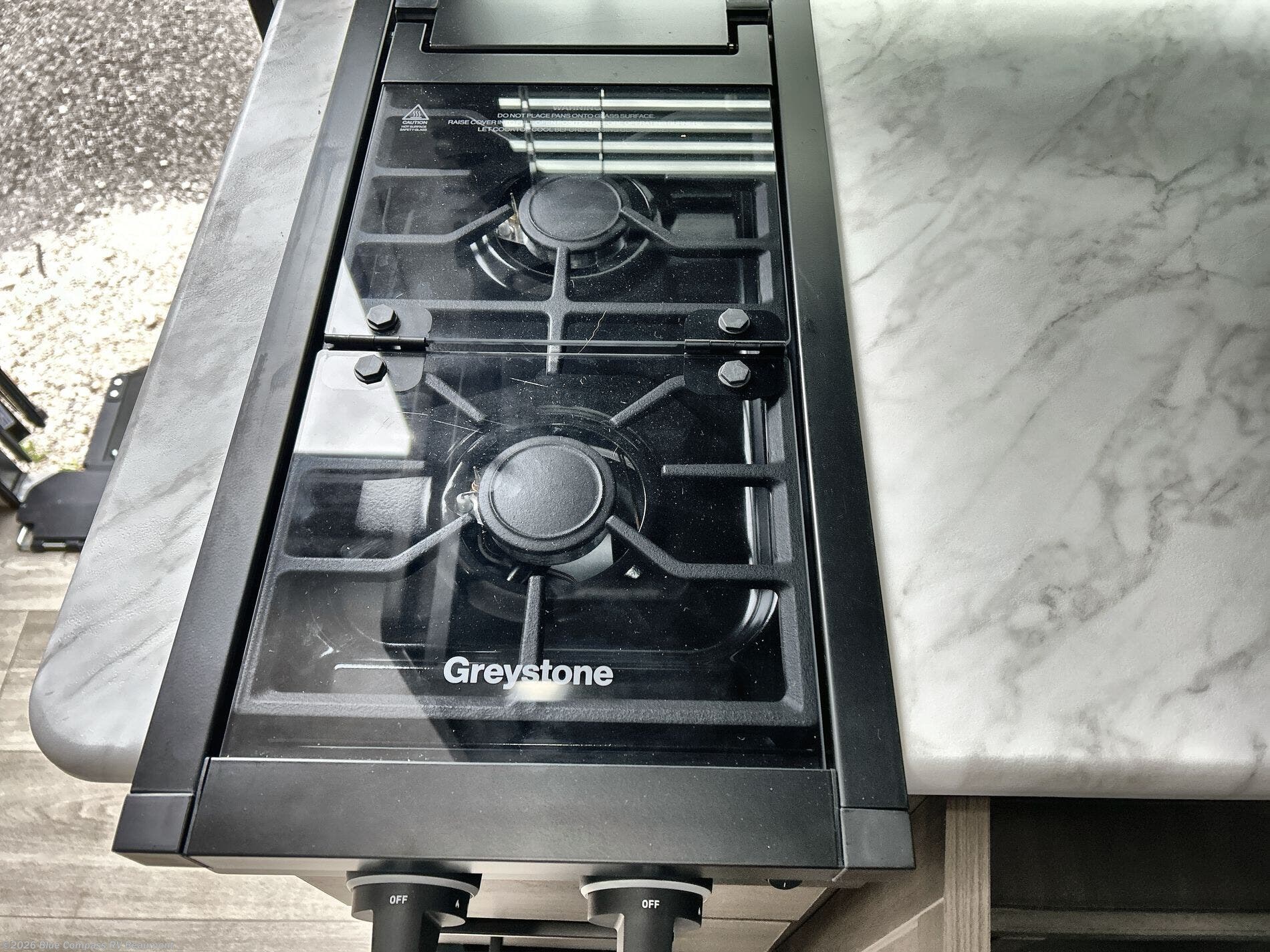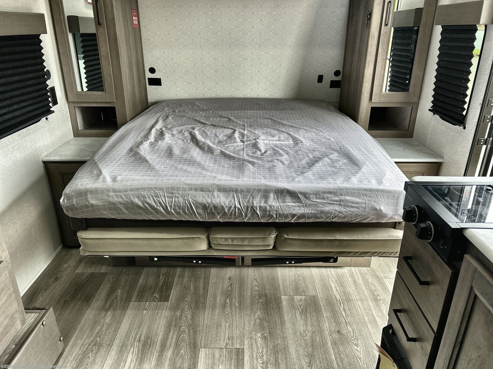 Spacious and versatile, this travel trailer is perfect for weekend trips to the campground or weeklong visits to the lake! There is a front Murphy bed with storage on both sides plus a pull-out pet drawer to keep your furry friends happy. Your guests or little ones will love the double-size bunks with privacy curtains, and the full bath is right next to the bunks for easy nighttime use. Once you make breakfast on the two burner range, you can dine at the booth dinette slide. And this model also includes an outdoor griddle and refrigerator if you want to make breakfast outdoors. Additional exterior features include a 16' power awning, an interior/exterior table, and a pass-thru storage for larger camp gear.