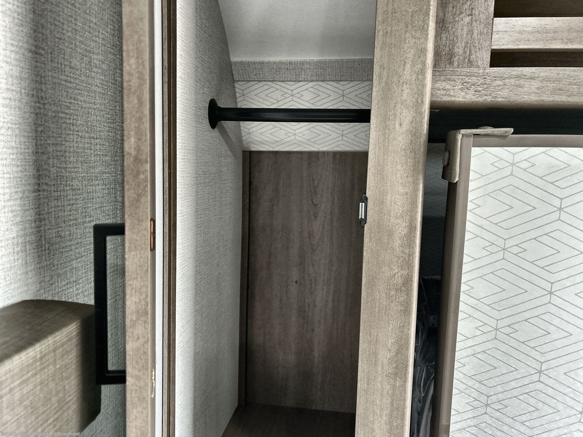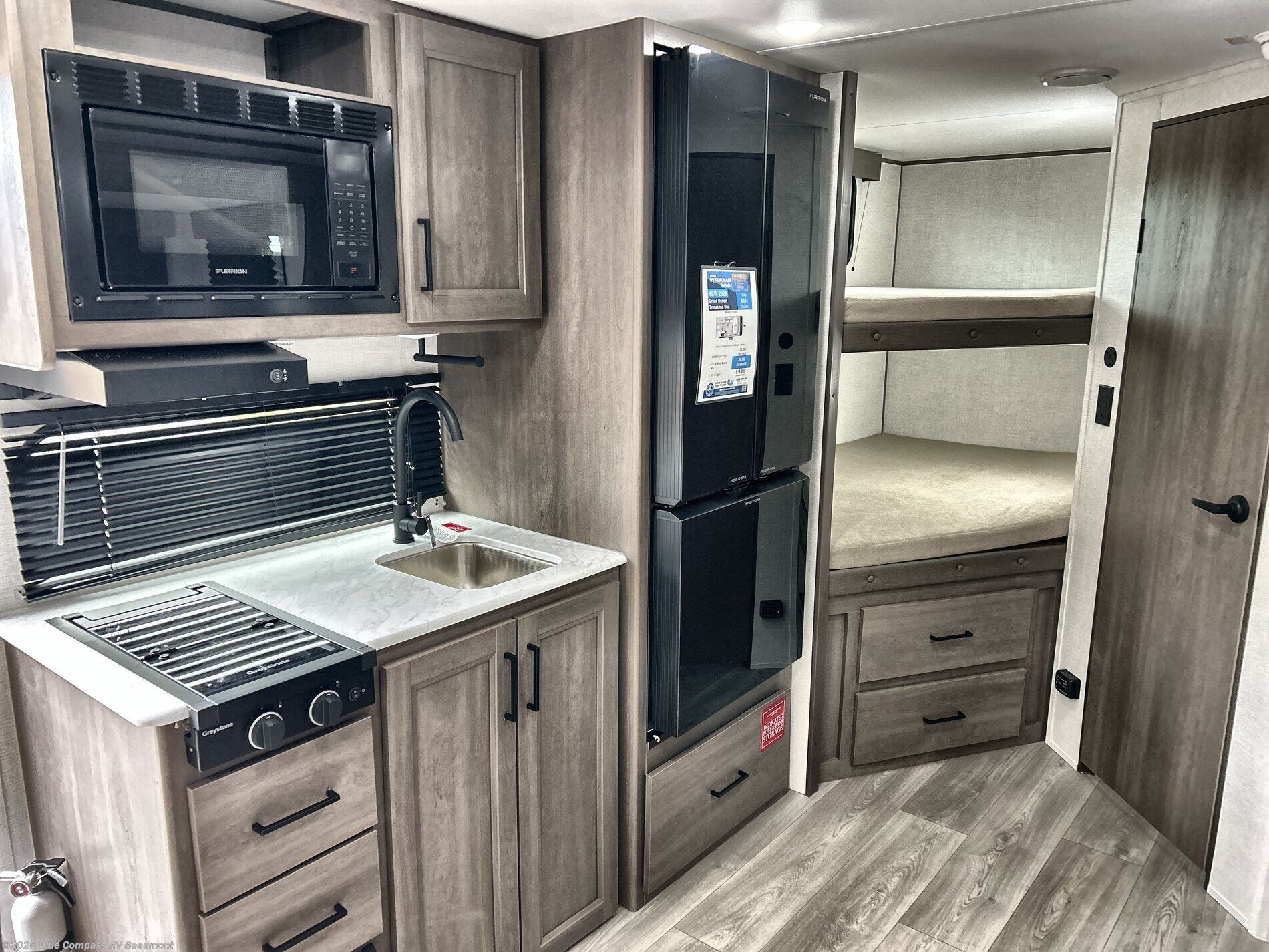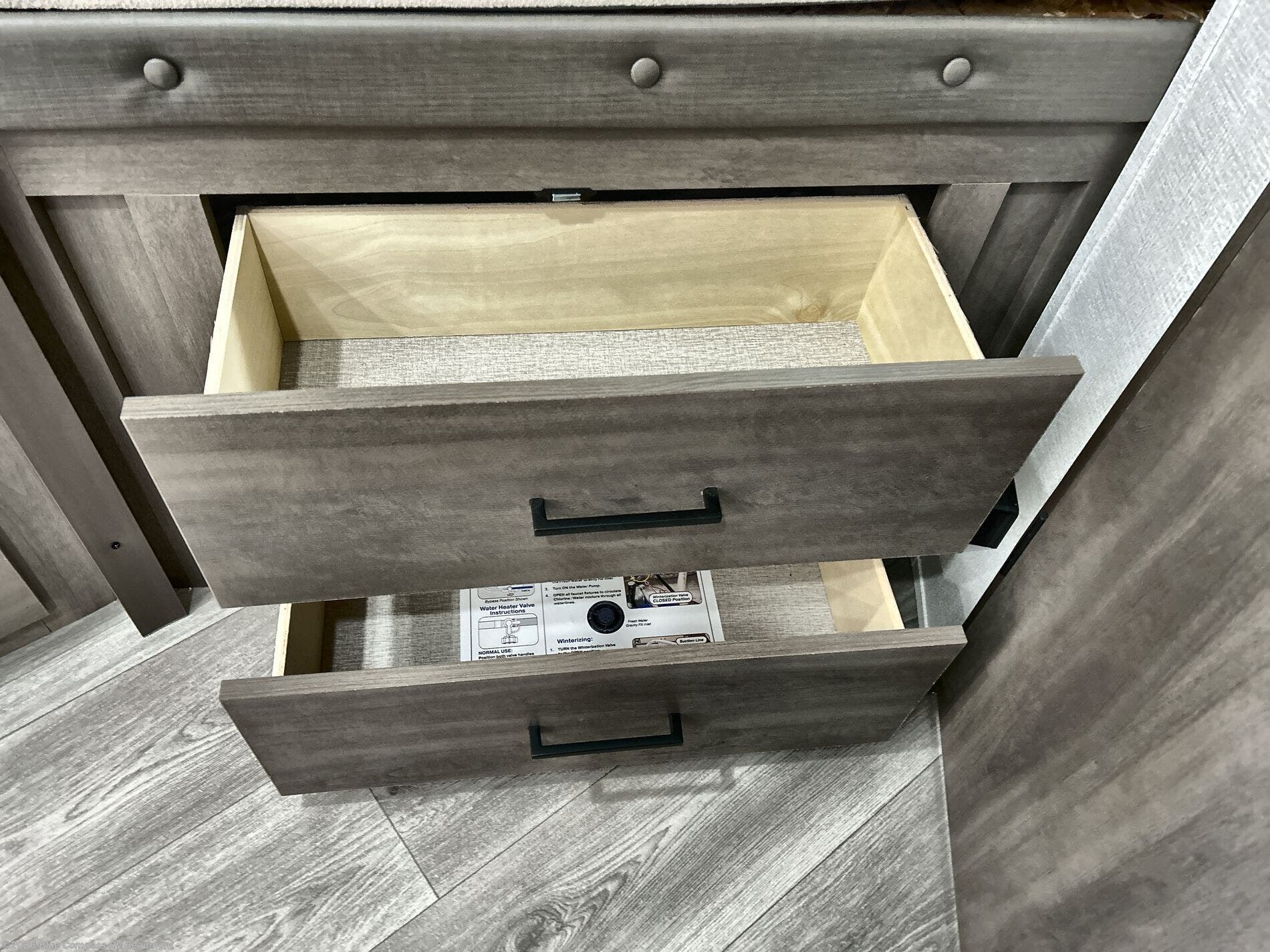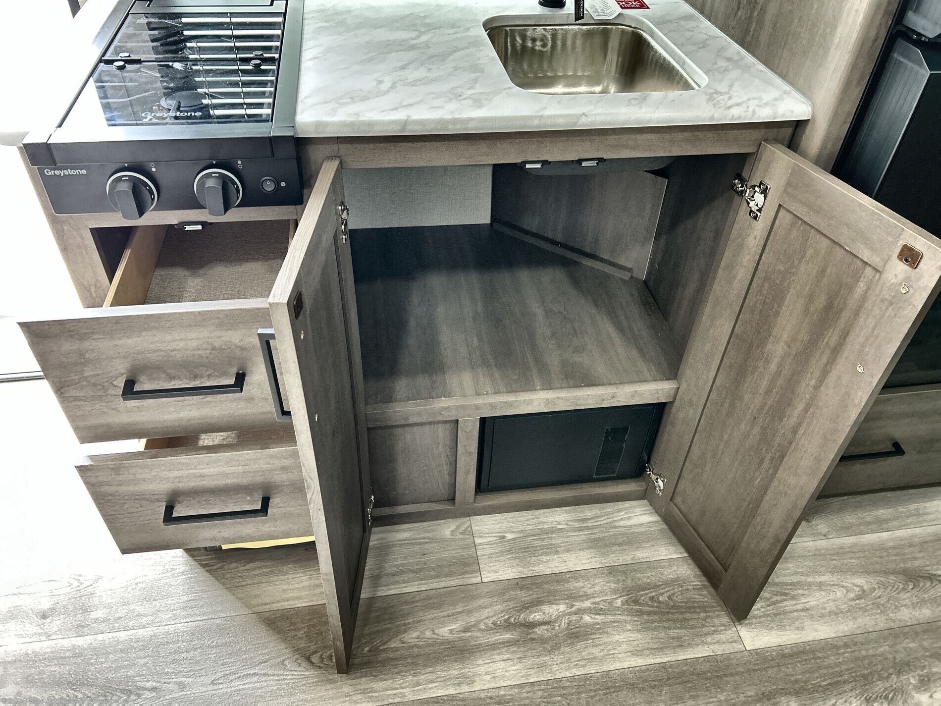 Spacious and versatile, this travel trailer is perfect for weekend trips to the campground or weeklong visits to the lake! There is a front Murphy bed with storage on both sides plus a pull-out pet drawer to keep your furry friends happy. Your guests or little ones will love the double-size bunks with privacy curtains, and the full bath is right next to the bunks for easy nighttime use. Once you make breakfast on the two burner range, you can dine at the booth dinette slide. And this model also includes an outdoor griddle and refrigerator if you want to make breakfast outdoors. Additional exterior features include a 16' power awning, an interior/exterior table, and a pass-thru storage for larger camp gear.
