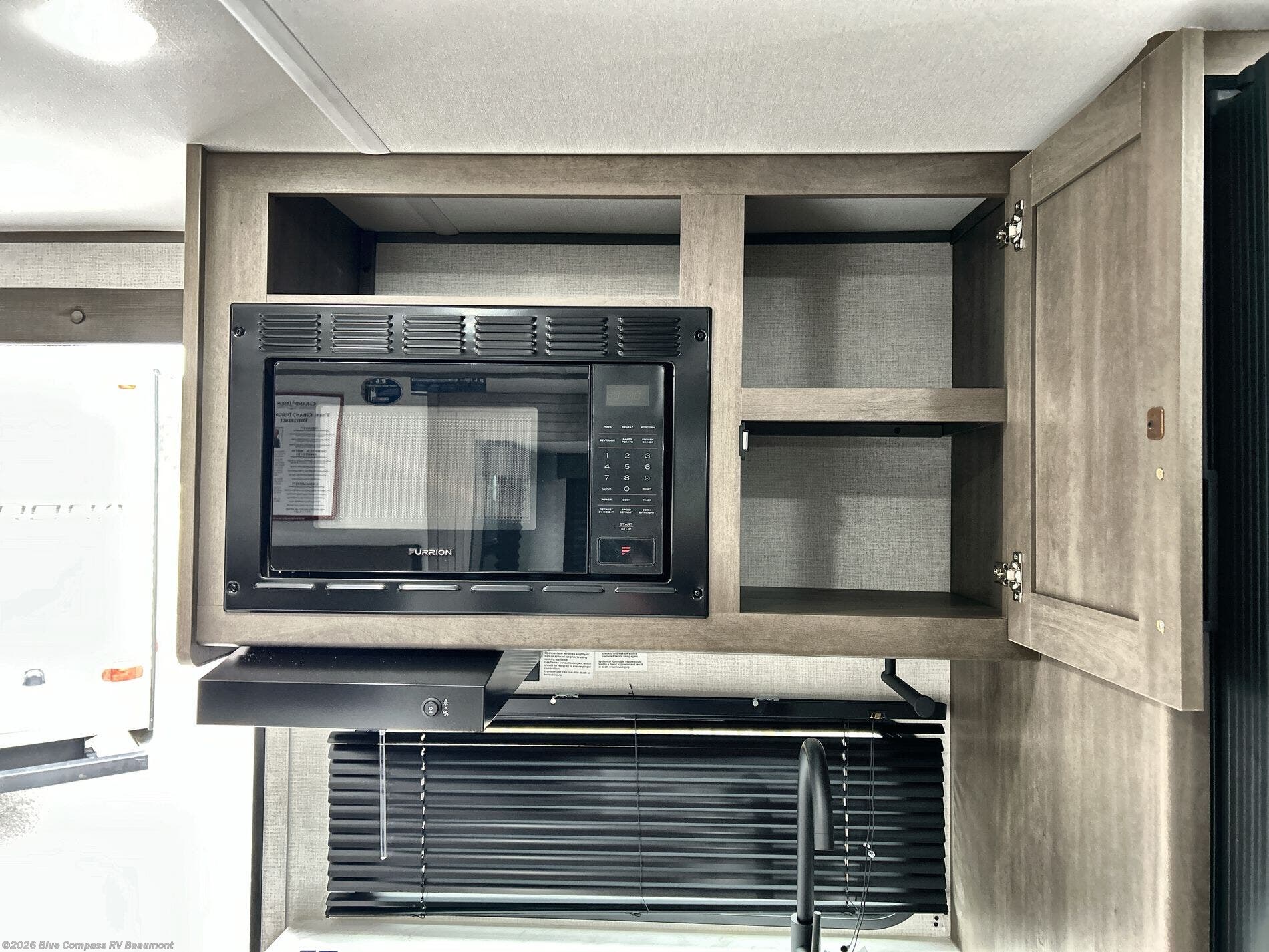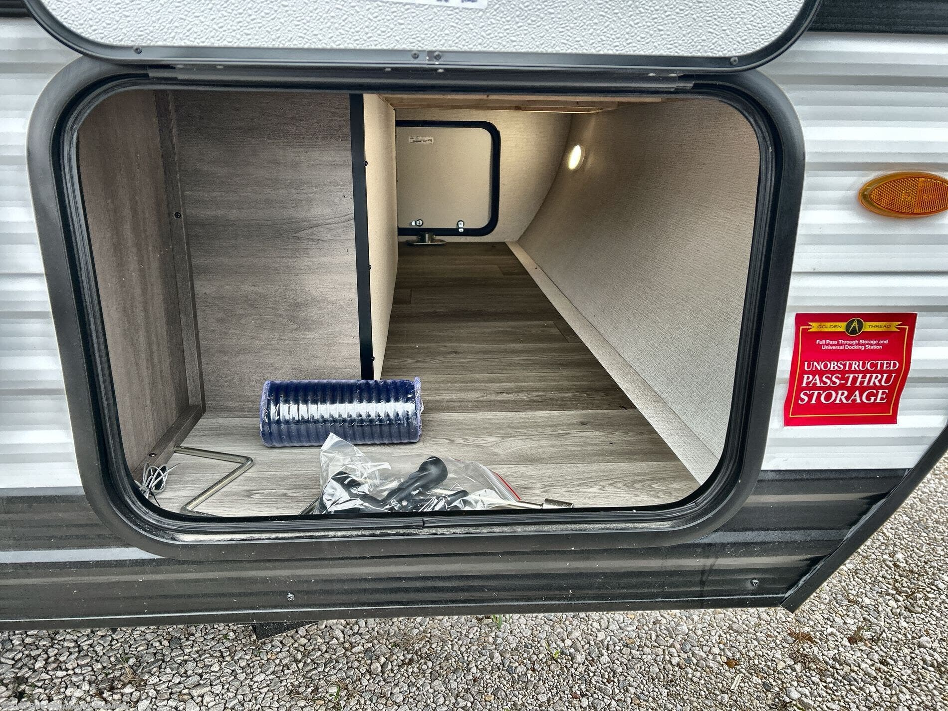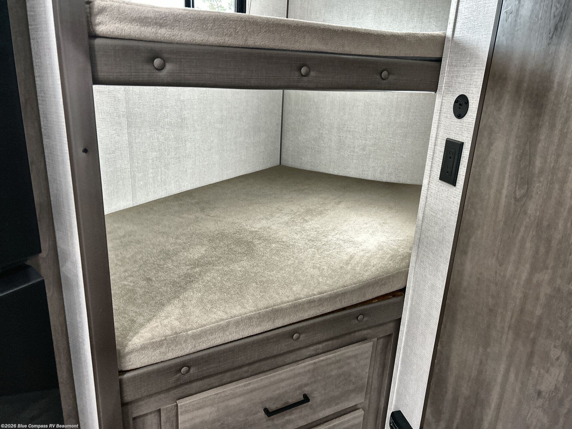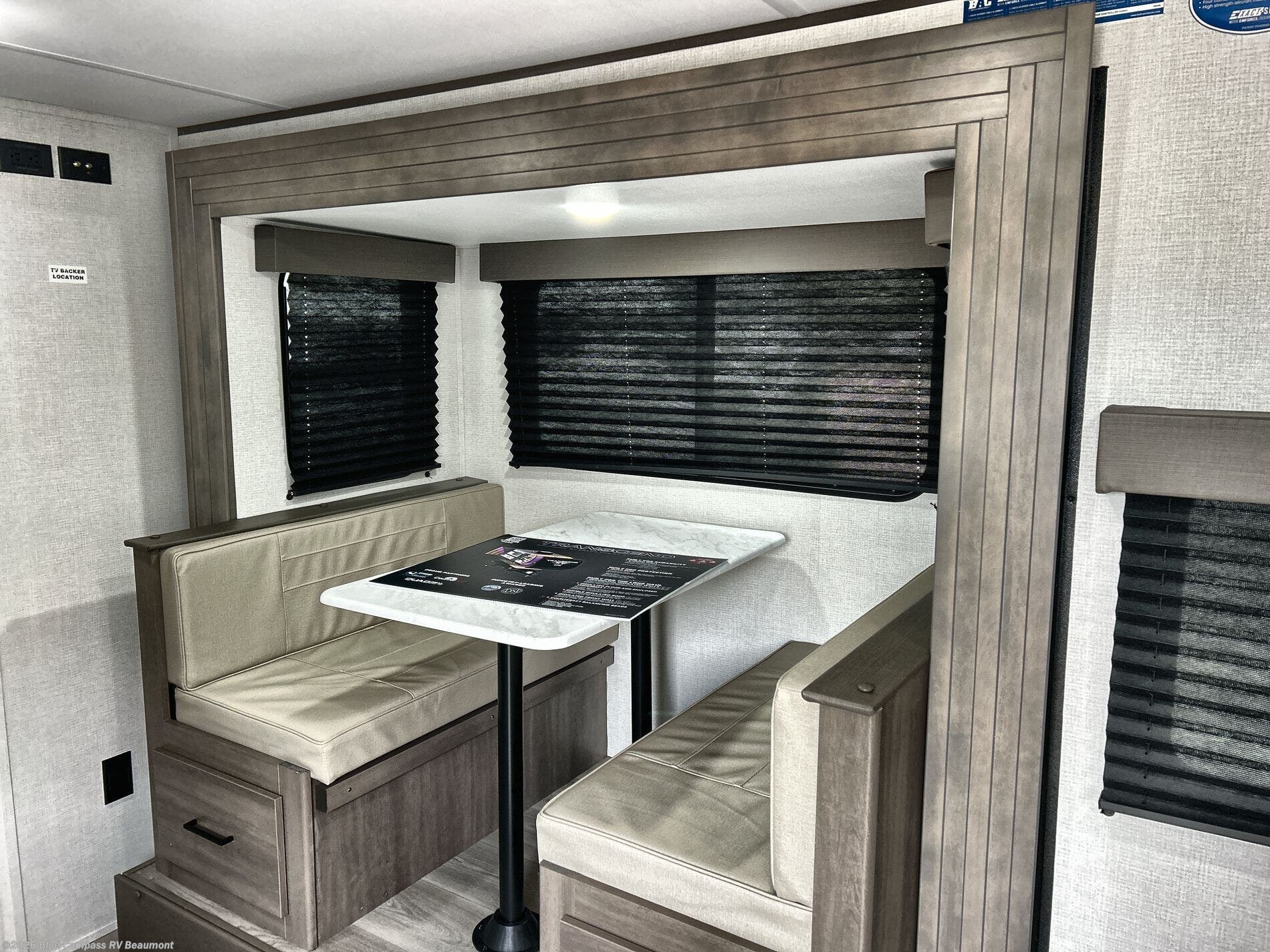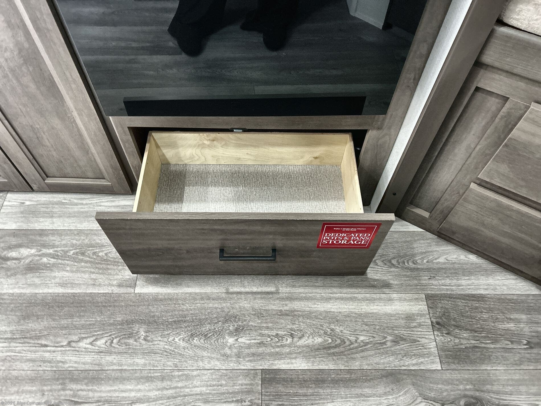 Spacious and versatile, this travel trailer is perfect for weekend trips to the campground or weeklong visits to the lake! There is a front Murphy bed with storage on both sides plus a pull-out pet drawer to keep your furry friends happy. Your guests or little ones will love the double-size bunks with privacy curtains, and the full bath is right next to the bunks for easy nighttime use. Once you make breakfast on the two burner range, you can dine at the booth dinette slide. And this model also includes an outdoor griddle and refrigerator if you want to make breakfast outdoors. Additional exterior features include a 16' power awning, an interior/exterior table, and a pass-thru storage for larger camp gear.