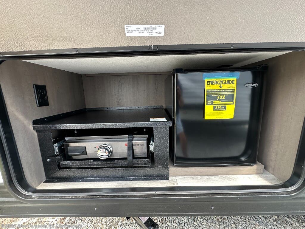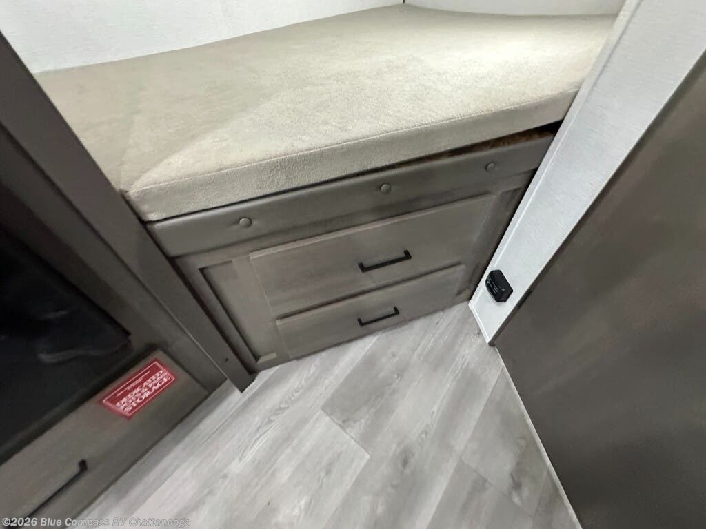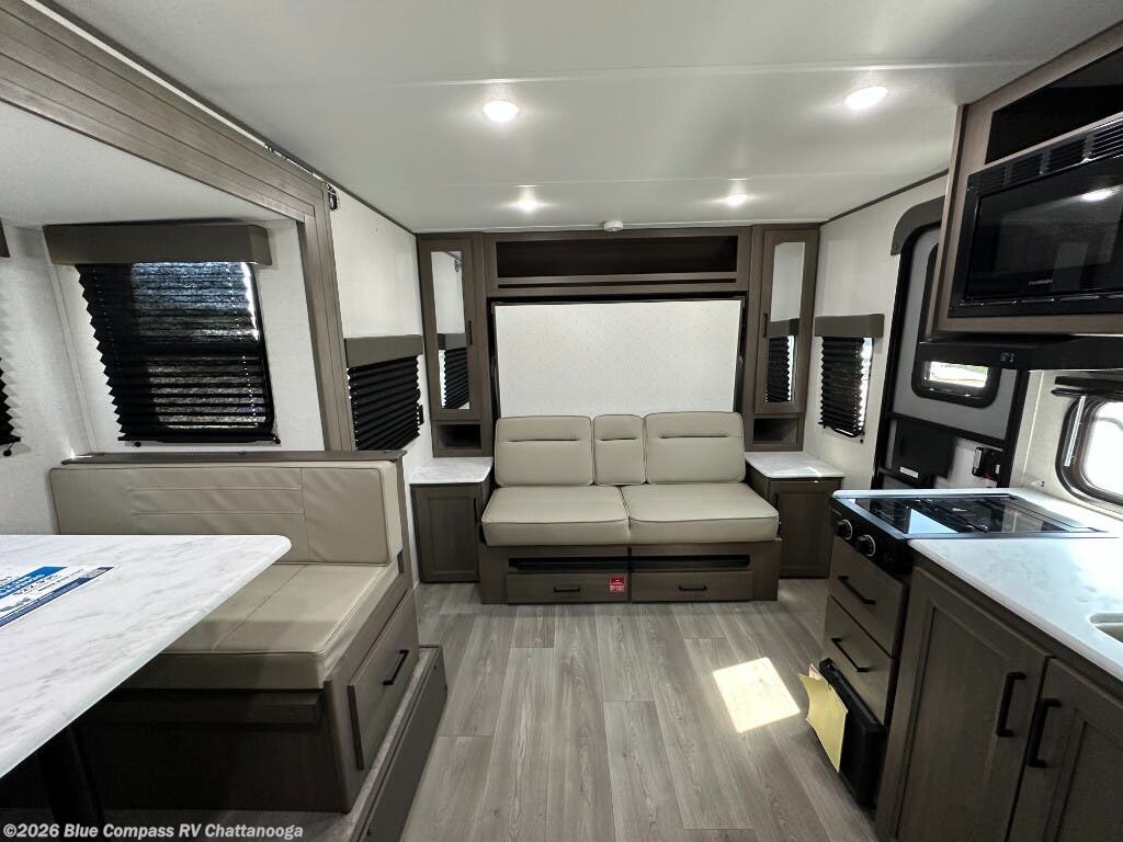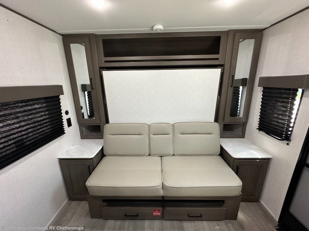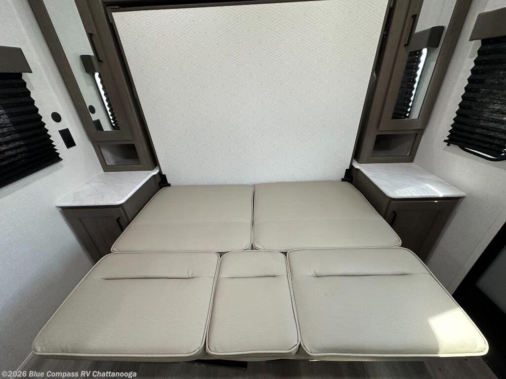 Spacious and versatile, this travel trailer is perfect for weekend trips to the campground or weeklong visits to the lake! There is a front Murphy bed with storage on both sides plus a pull-out pet drawer to keep your furry friends happy. Your guests or little ones will love the double-size bunks with privacy curtains, and the full bath is right next to the bunks for easy nighttime use. Once you make breakfast on the two burner range, you can dine at the booth dinette slide. And this model also includes an outdoor griddle and refrigerator if you want to make breakfast outdoors. Additional exterior features include a 16' power awning, an interior/exterior table, and a pass-thru storage for larger camp gear.