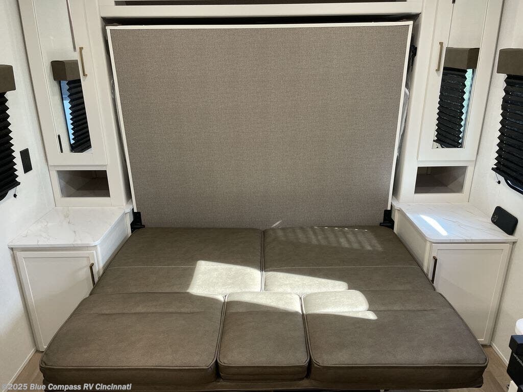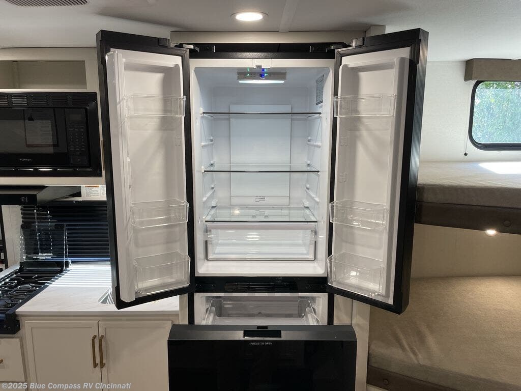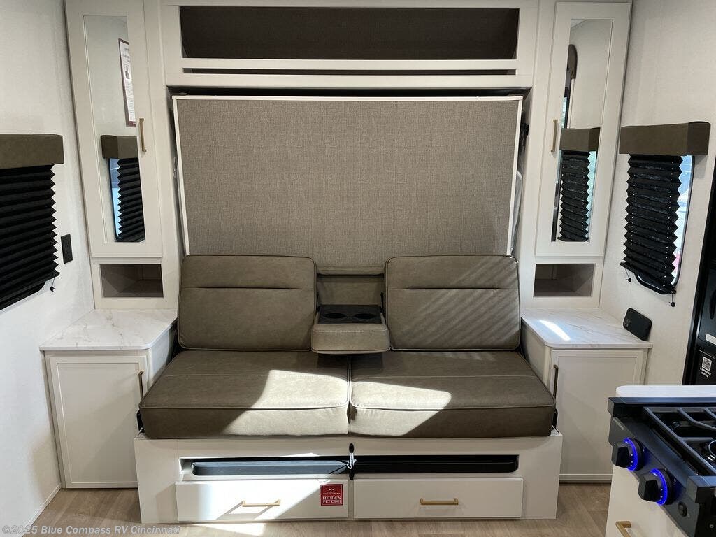 Spacious and versatile, this travel trailer is perfect for getaways to the campground or relaxing escapes by the lake! There is a front Murphy bed with storage on both sides plus a pull-out pet dish to keep your furry friends happy. Your guests or little ones will love the double-size bunks, and the full bath is right next to the bunks for easy nighttime use. Once you make breakfast on the two burner range, you can dine at the booth dinette slide. And this model also includes an outdoor griddle and refrigerator if you want to make breakfast outdoors. Additional exterior features include a 16' power awning, an interior/exterior table, and a pass-thru storage for larger camp gear.