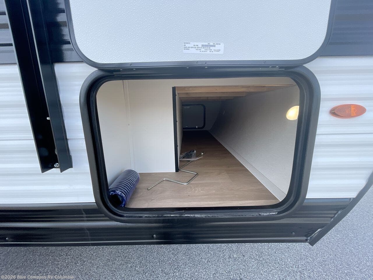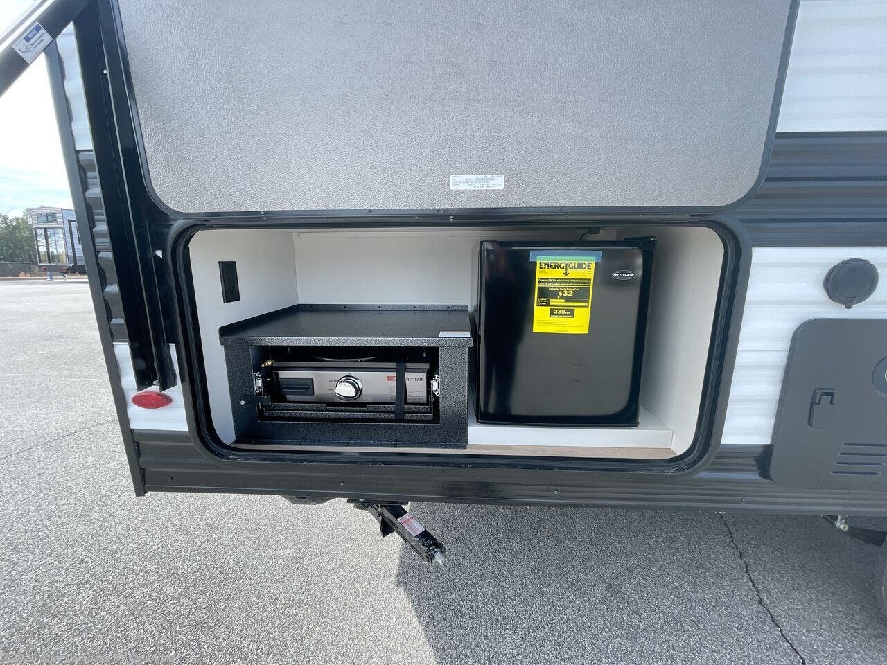 Spacious and versatile, this travel trailer is perfect for getaways to the campground or relaxing escapes by the lake! There is a front Murphy bed with storage on both sides plus a pull-out pet dish to keep your furry friends happy. Your guests or little ones will love the double-size bunks, and the full bath is right next to the bunks for easy nighttime use. Once you make breakfast on the two burner range, you can dine at the booth dinette slide. And this model also includes an outdoor griddle and refrigerator if you want to make breakfast outdoors. Additional exterior features include a 16' power awning, an interior/exterior table, and a pass-thru storage for larger camp gear.