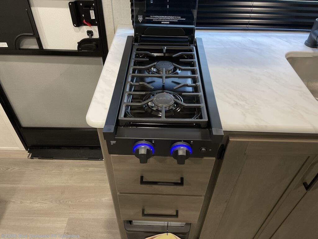 Spacious and versatile, this travel trailer is perfect for weekend trips to the campground or weeklong visits to the lake! There is a front Murphy bed with storage on both sides plus a pull-out pet drawer to keep your furry friends happy. Your guests or little ones will love the double-size bunks with privacy curtains, and the full bath is right next to the bunks for easy nighttime use. Once you make breakfast on the two burner range, you can dine at the booth dinette slide. And this model also includes an outdoor griddle and refrigerator if you want to make breakfast outdoors. Additional exterior features include a 16' power awning, an interior/exterior table, and a pass-thru storage for larger camp gear.
