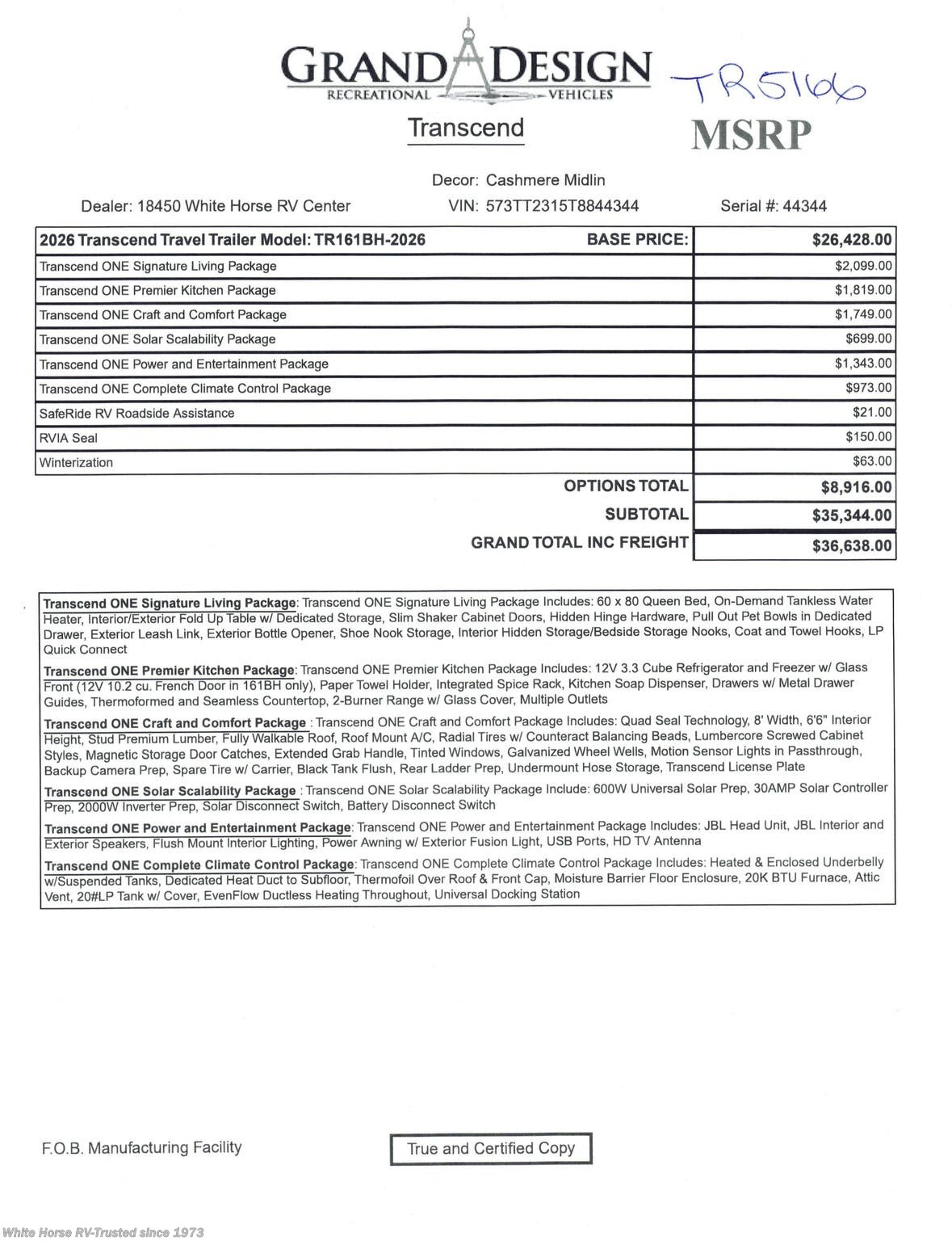 Request More Info on this 2026 Grand Design Transcend One 161BH Offered for sale by White Horse RV Center