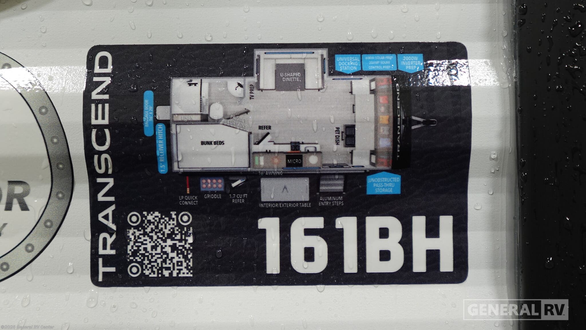 Grand Design Transcend One travel trailer 161BH highlights: Double-Size Bunks Unobstructed Pass-Thru Storage Full Bath Murphy Bed Exterior Griddle and Refrigerator Spacious and versatile, this travel trailer is perfect for getaways to the campground or relaxing escapes by the lake! There is a front Murphy bed with storage on both sides plus a pull-out pet dish to keep your furry friends happy. Your guests or little ones will love the double-size bunks, and the full bath is right next to the bunks for easy nighttime use. Once you make breakfast on the two burner range, you can dine at the booth dinette slide. And this model also includes an outdoor griddle and refrigerator if you want to make breakfast outdoors. Additional exterior features include a 16' power awning, an interior/exterior table, and a pass-thru storage for larger camp gear. With any Transcend One travel trailer by Grand Design, you will enjoy lightweight towing thanks to their single-axle. There are many interior comforts to make camping easier than ever, such as recessed lighting, residential countertops, and a 6' 6" interior height. Each model is constructed with a heated and enclosed underbelly with suspended tanks, a moisture barrier floor enclosure, and Thermofoil over the roof and front cap for added protection. And a JBL sound system will let you listen to tunes as you visit under the power awning with a Fusion light!