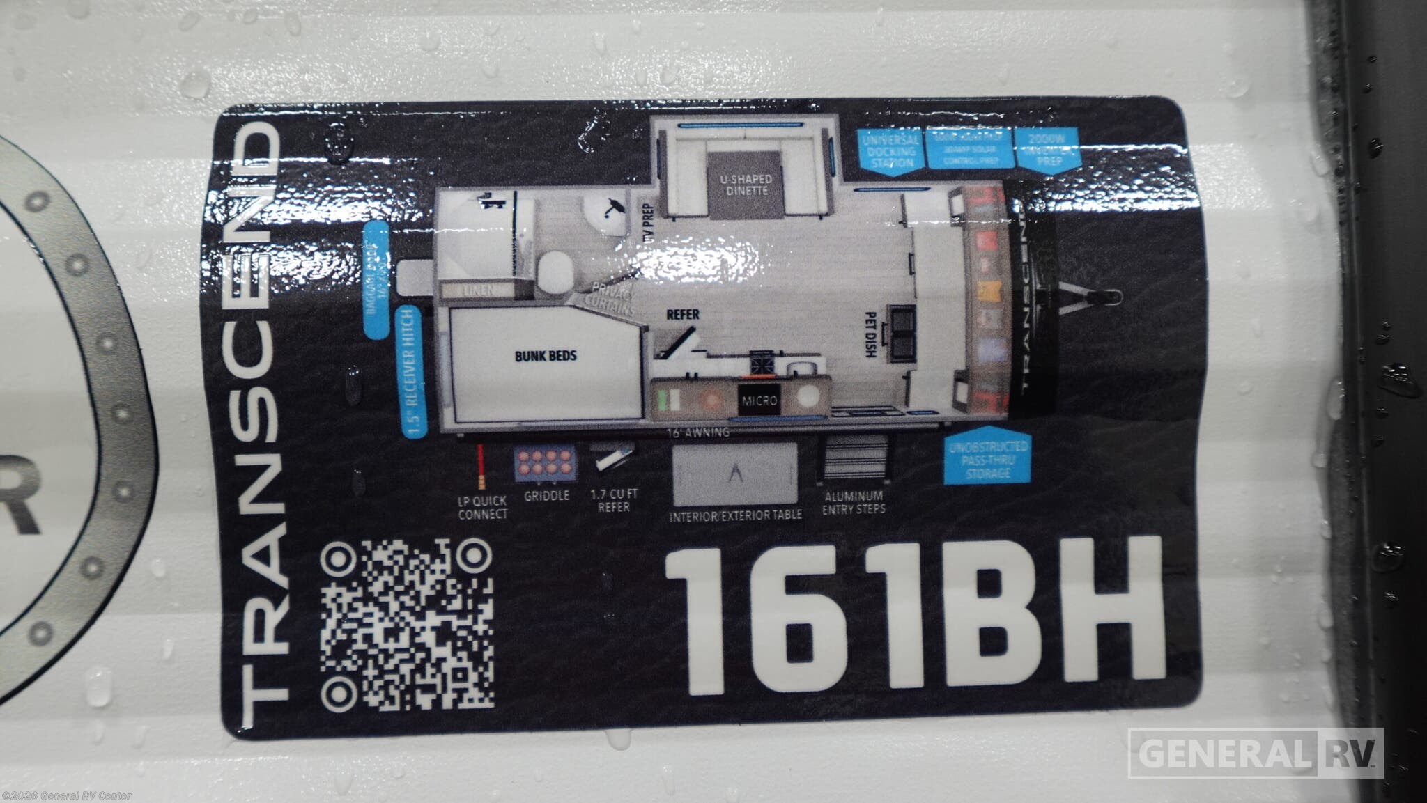 Grand Design Transcend One travel trailer 161BH highlights: Double-Size Bunks Unobstructed Pass-Thru Storage Full Bath Murphy Bed Exterior Griddle and Refrigerator Spacious and versatile, this travel trailer is perfect for getaways to the campground or relaxing escapes by the lake! There is a front Murphy bed with storage on both sides plus a pull-out pet dish to keep your furry friends happy. Your guests or little ones will love the double-size bunks, and the full bath is right next to the bunks for easy nighttime use. Once you make breakfast on the two burner range, you can dine at the booth dinette slide. And this model also includes an outdoor griddle and refrigerator if you want to make breakfast outdoors. Additional exterior features include a 16' power awning, an interior/exterior table, and a pass-thru storage for larger camp gear. With any Transcend One travel trailer by Grand Design, you will enjoy lightweight towing thanks to their single-axle. There are many interior comforts to make camping easier than ever, such as recessed lighting, residential countertops, and a 6' 6" interior height. Each model is constructed with a heated and enclosed underbelly with suspended tanks, a moisture barrier floor enclosure, and Thermofoil over the roof and front cap for added protection. And a JBL sound system will let you listen to tunes as you visit under the power awning with a Fusion light!