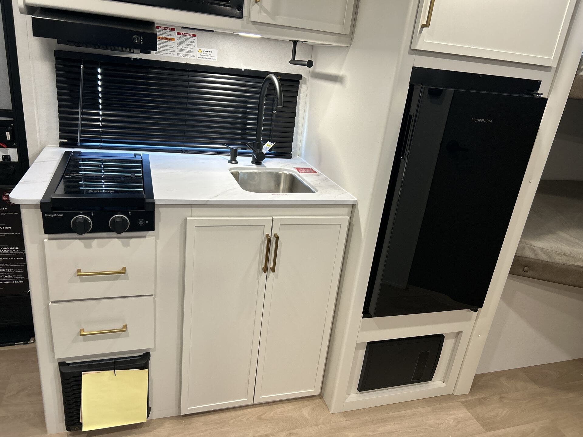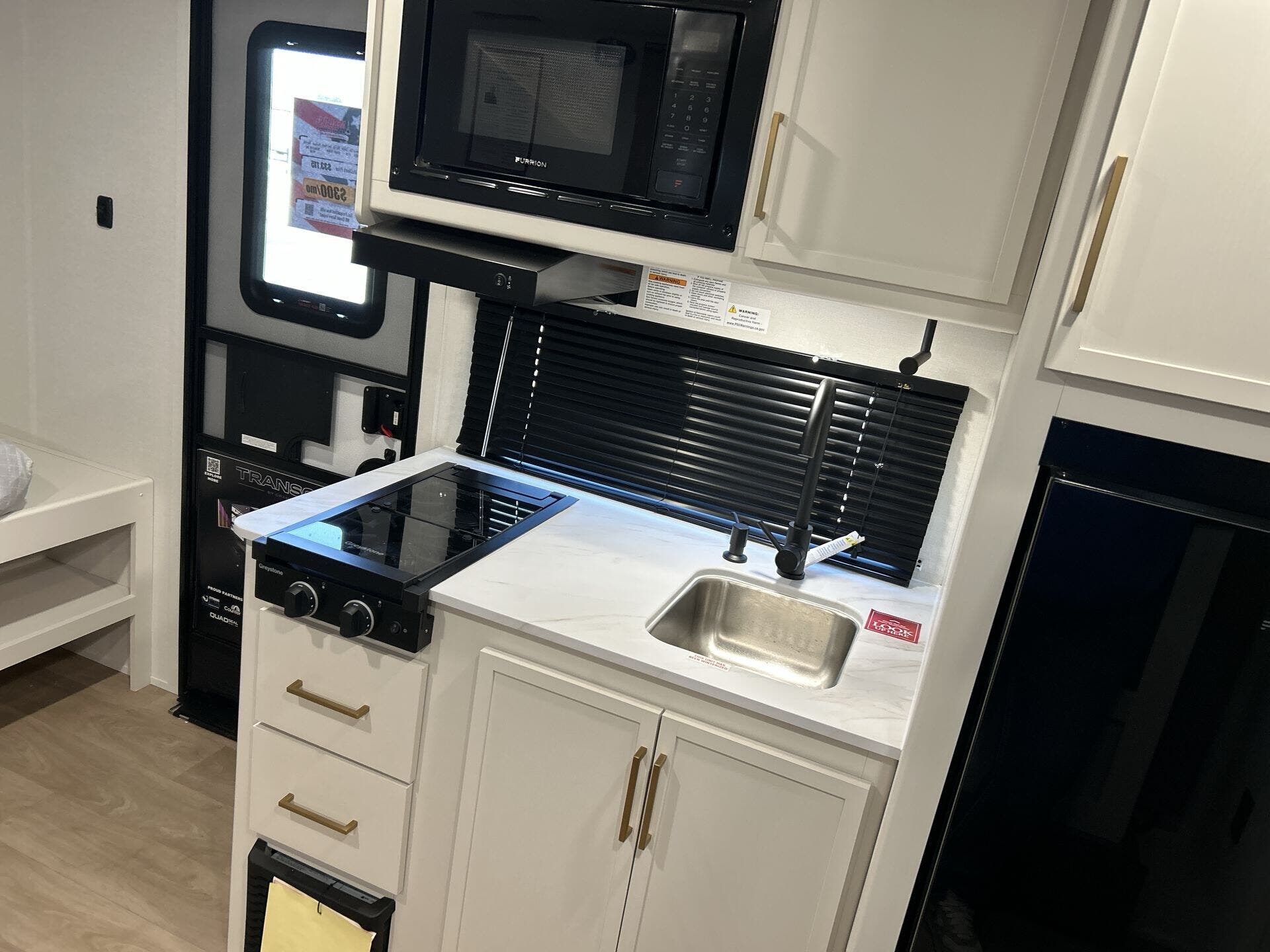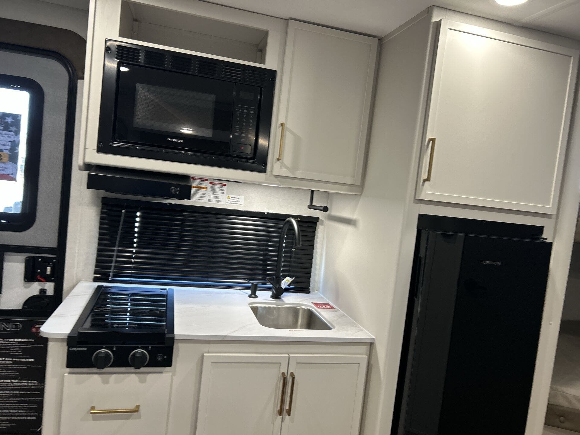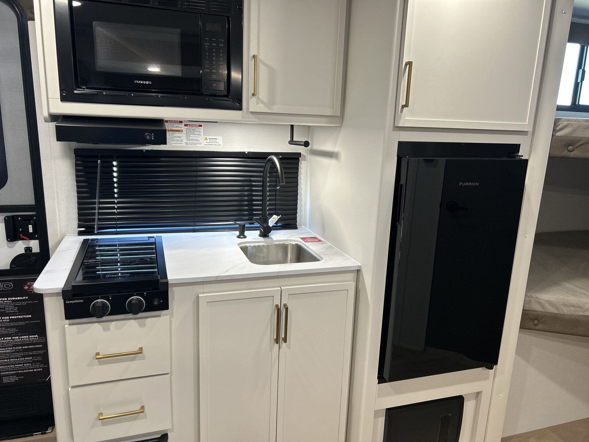 - Microwave, refrigerator, stove top burner, and water heater for everyday convenience