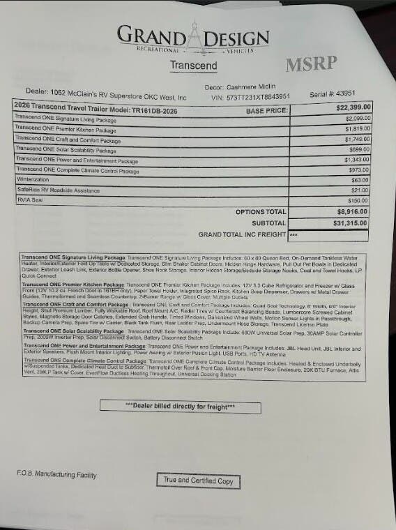 Request More Info on this 2026 Grand Design Transcend One 161DB Offered for sale by McClain's RV Oklahoma City