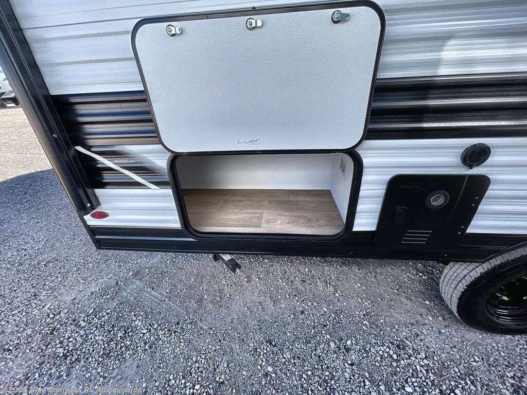 This travel trailer is perfect for getaways to the campground or relaxing escapes by the lake! There is a front queen bed with generous storage both above and below. Your guests or little ones will love the double-size bunks, and the full bath is right next to the bunks for easy nighttime use. Once you make breakfast on the two-burner range, you can dine at the booth dinette slide. An interior/exterior table provides more dining space when you need it, and a 15' power awning with a fusion light lets you stay up late to visit with friends!