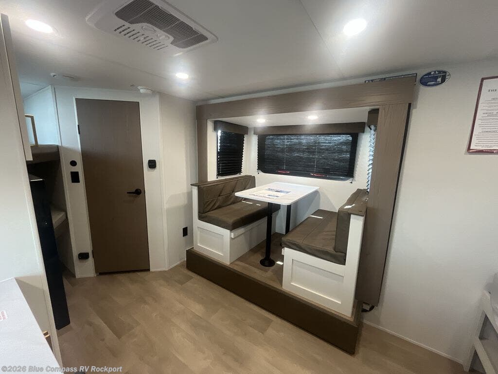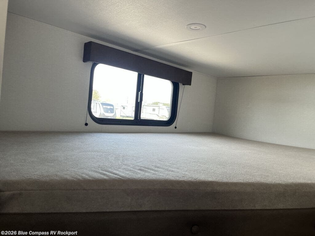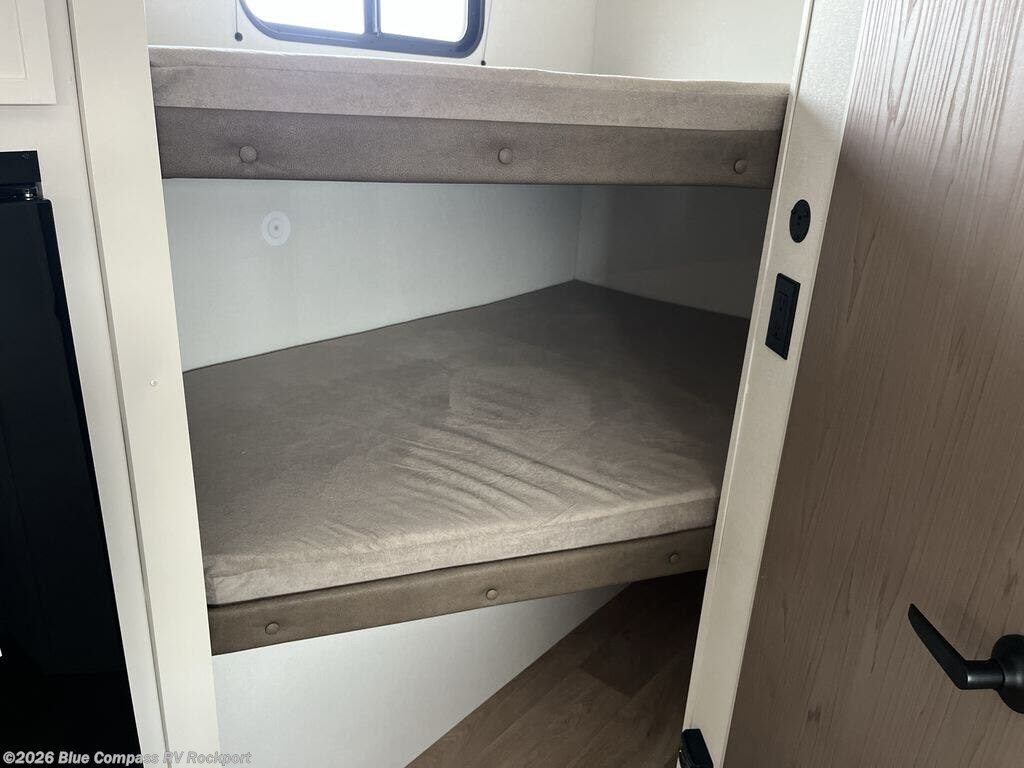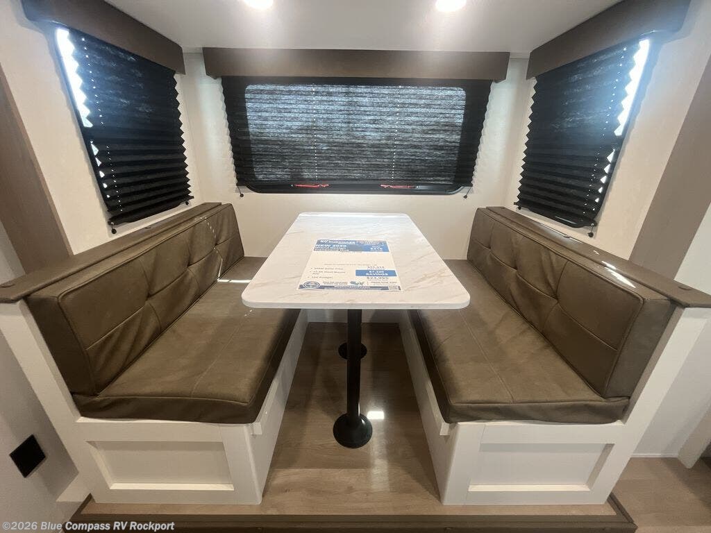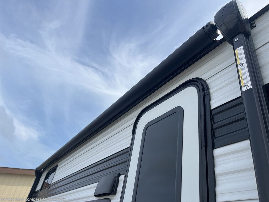 This travel trailer is perfect for getaways to the campground or relaxing escapes by the lake! There is a front queen bed with generous storage both above and below. Your guests or little ones will love the double-size bunks, and the full bath is right next to the bunks for easy nighttime use. Once you make breakfast on the two-burner range, you can dine at the booth dinette slide. An interior/exterior table provides more dining space when you need it, and a 15' power awning with a fusion light lets you stay up late to visit with friends!