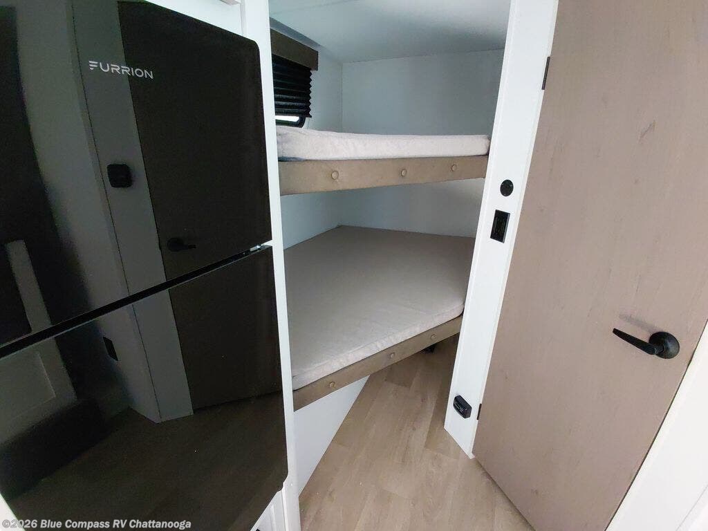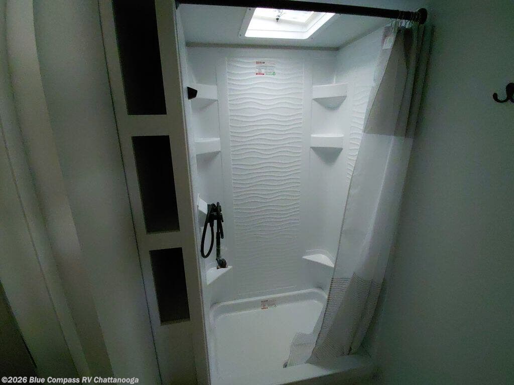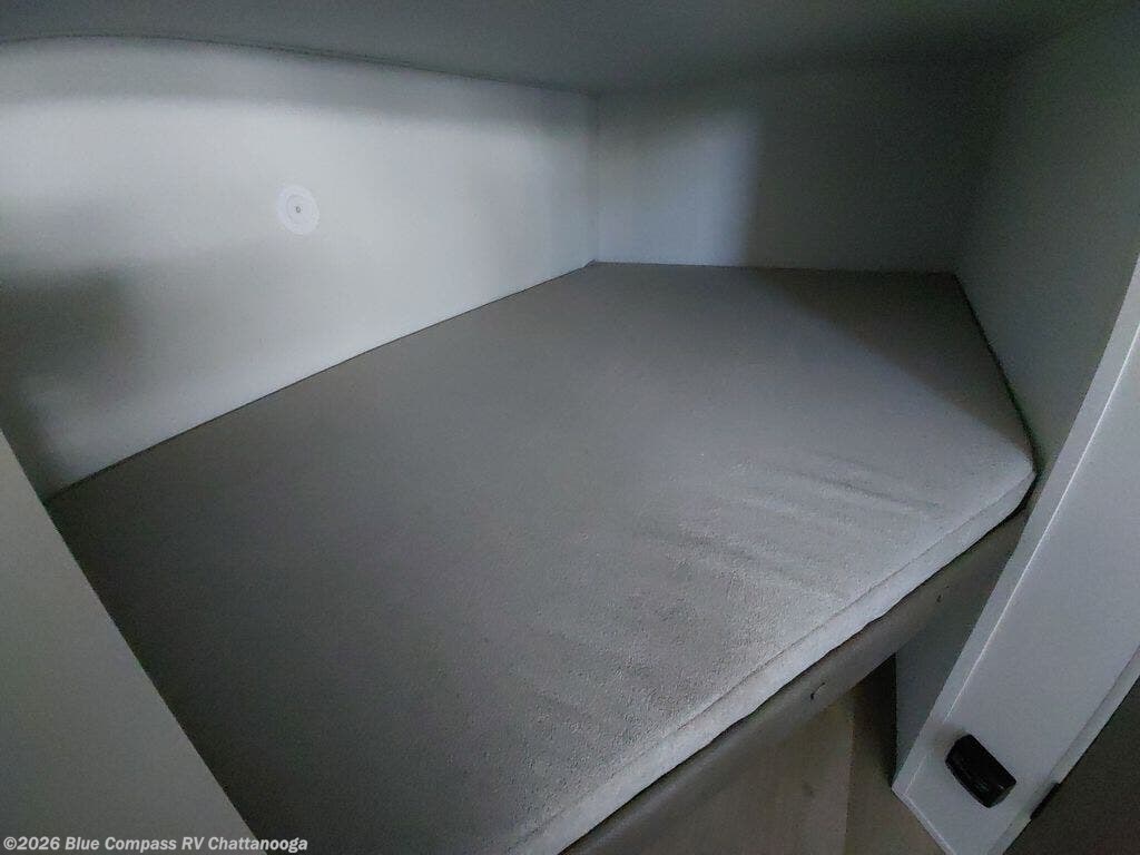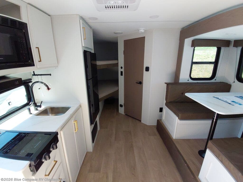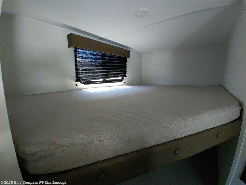 This travel trailer is perfect for getaways to the campground or relaxing escapes by the lake! There is a front queen bed with generous storage both above and below. Your guests or little ones will love the double-size bunks, and the full bath is right next to the bunks for easy nighttime use. Once you make breakfast on the two-burner range, you can dine at the booth dinette slide. An interior/exterior table provides more dining space when you need it, and a 15' power awning with a fusion light lets you stay up late to visit with friends!