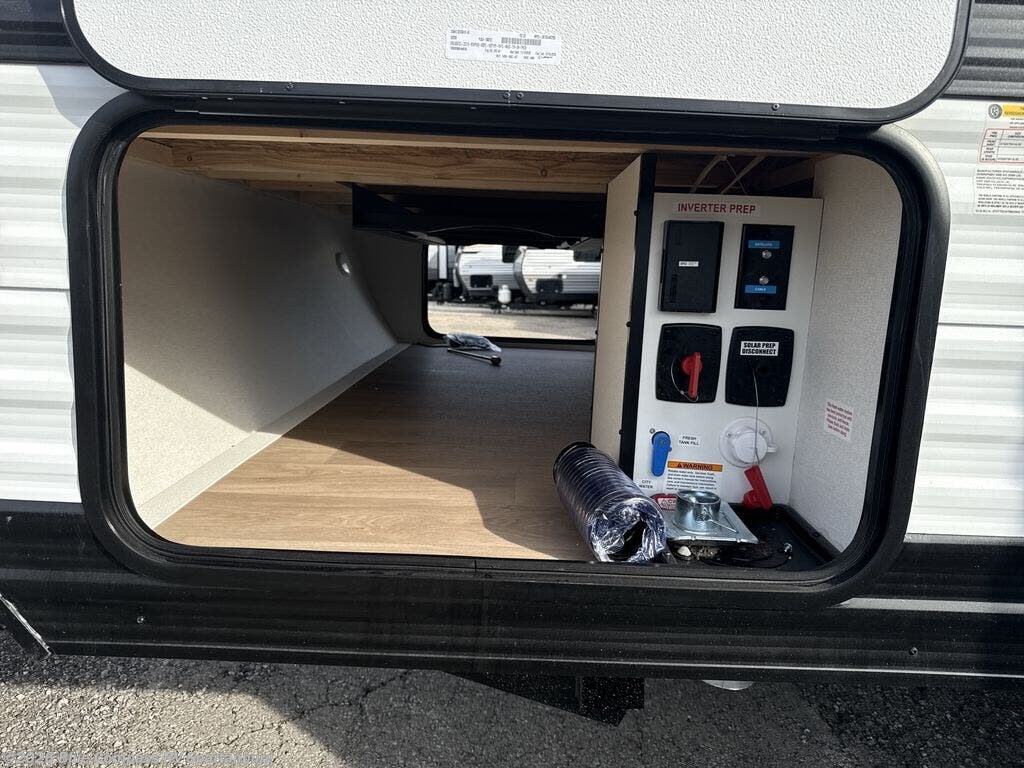 This travel trailer is perfect for getaways to the campground or relaxing escapes by the lake! There is a front queen bed with generous storage both above and below. Your guests or little ones will love the double-size bunks, and the full bath is right next to the bunks for easy nighttime use. Once you make breakfast on the two-burner range, you can dine at the booth dinette slide. An interior/exterior table provides more dining space when you need it, and a 15' power awning with a fusion light lets you stay up late to visit with friends!