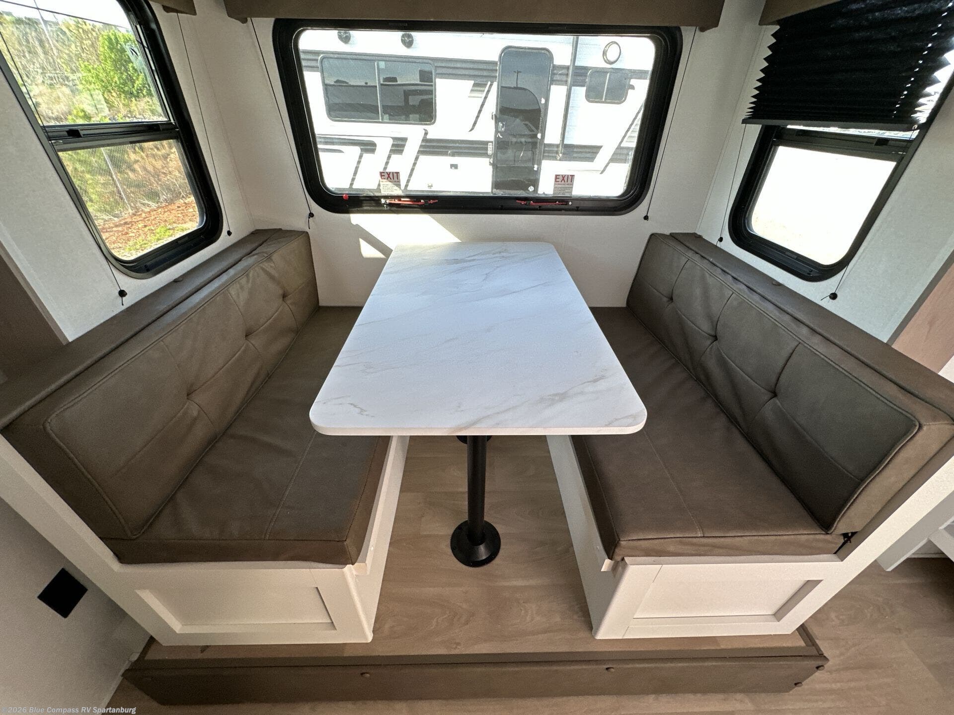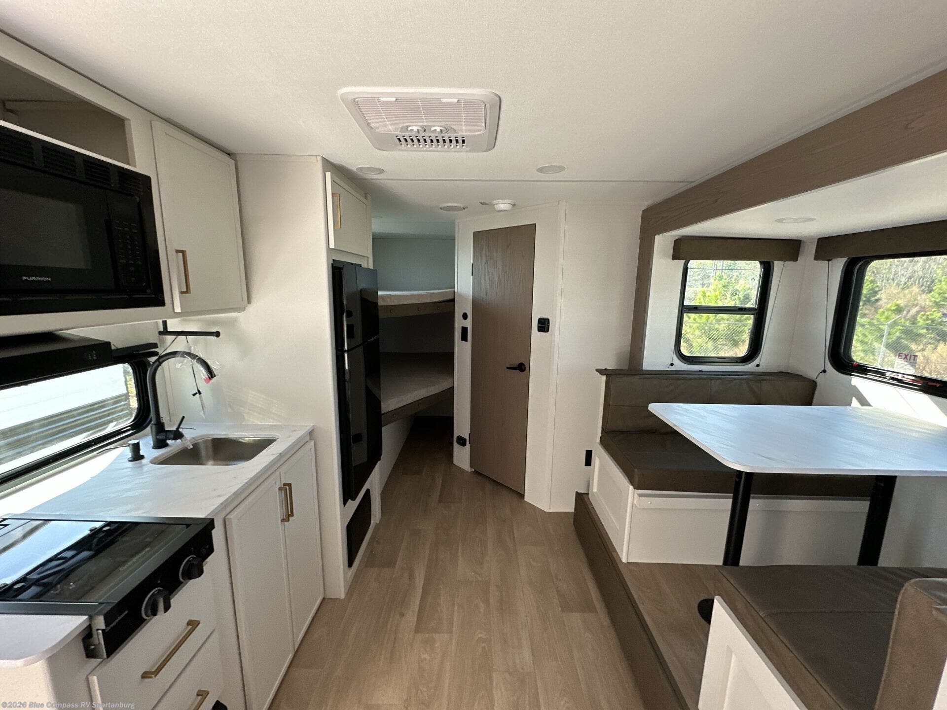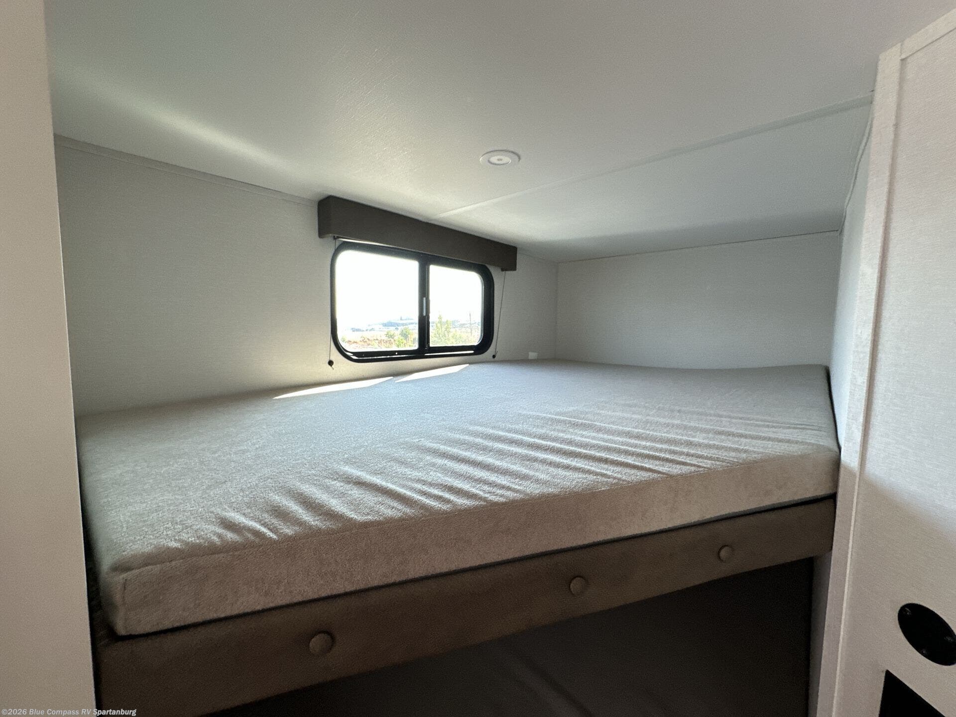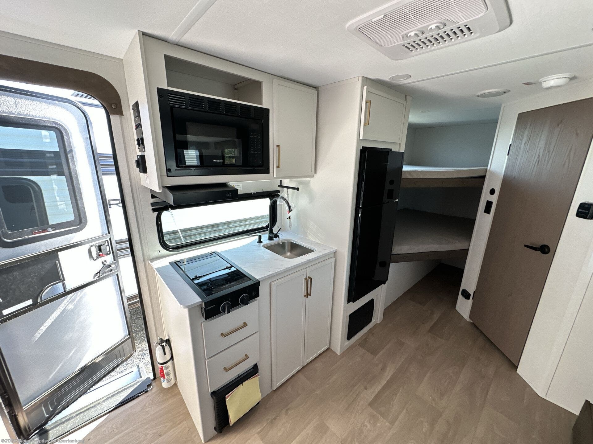 This travel trailer is perfect for getaways to the campground or relaxing escapes by the lake! There is a front queen bed with generous storage both above and below. Your guests or little ones will love the double-size bunks, and the full bath is right next to the bunks for easy nighttime use. Once you make breakfast on the two-burner range, you can dine at the booth dinette slide. An interior/exterior table provides more dining space when you need it, and a 15' power awning with a fusion light lets you stay up late to visit with friends!