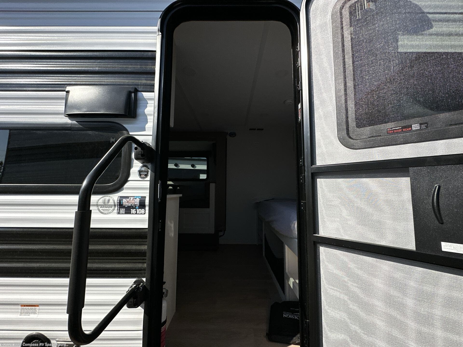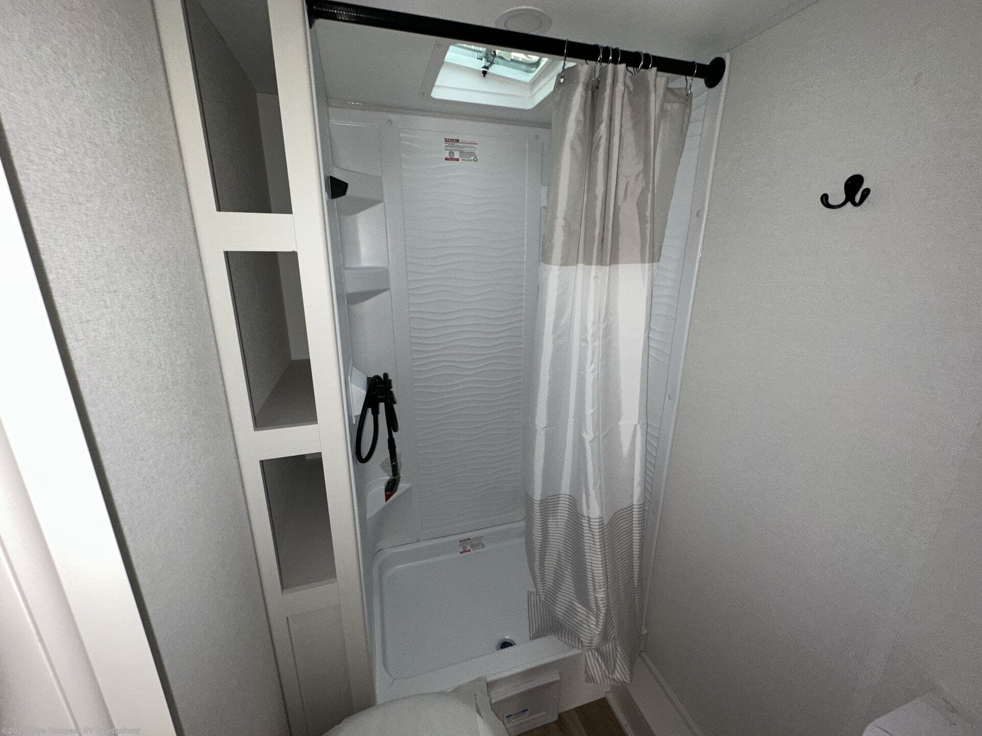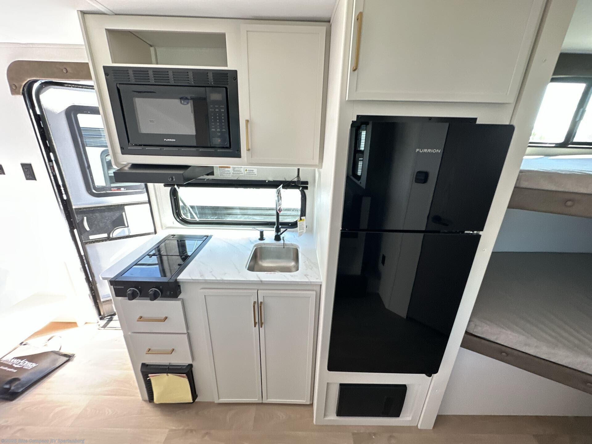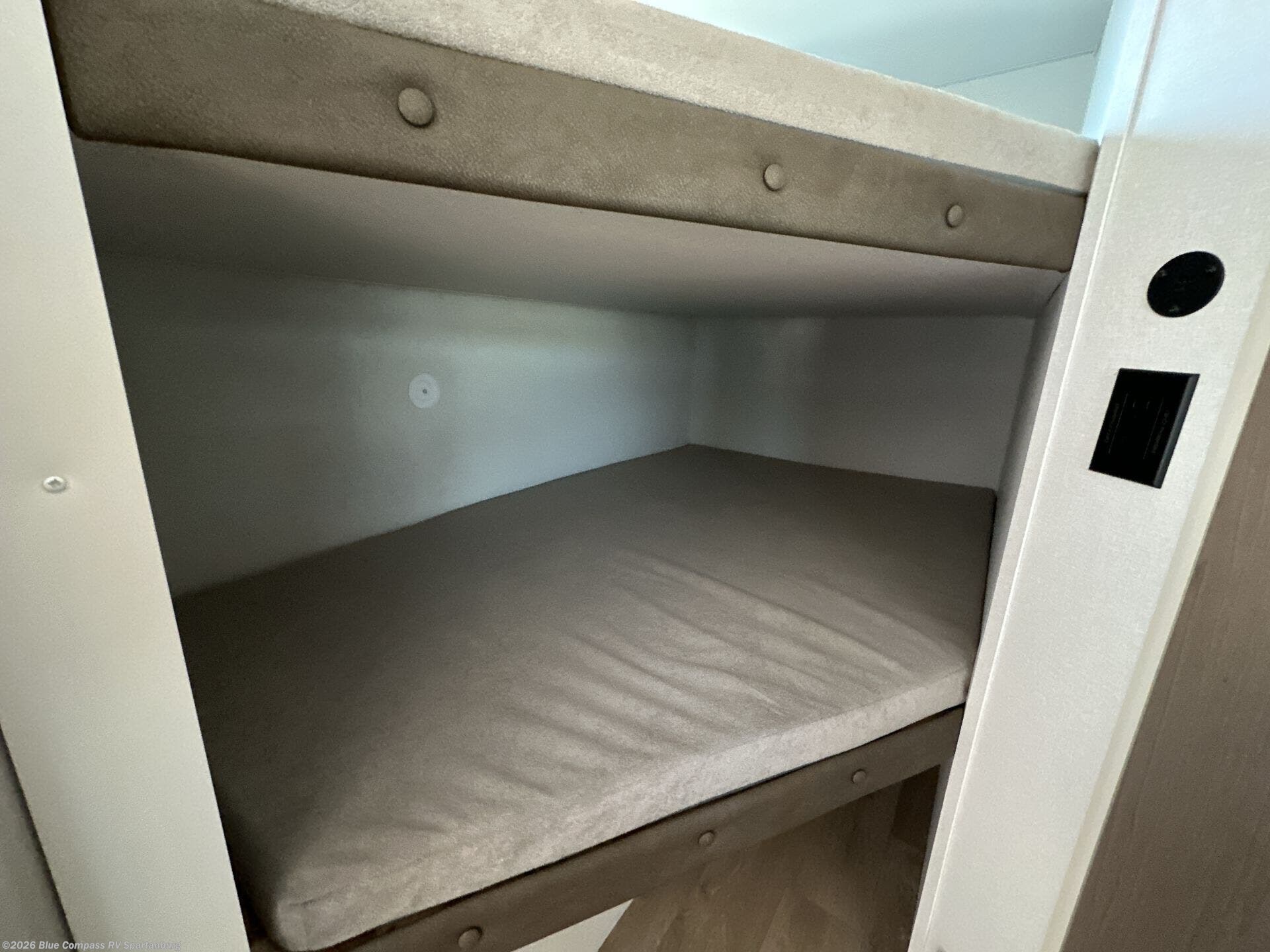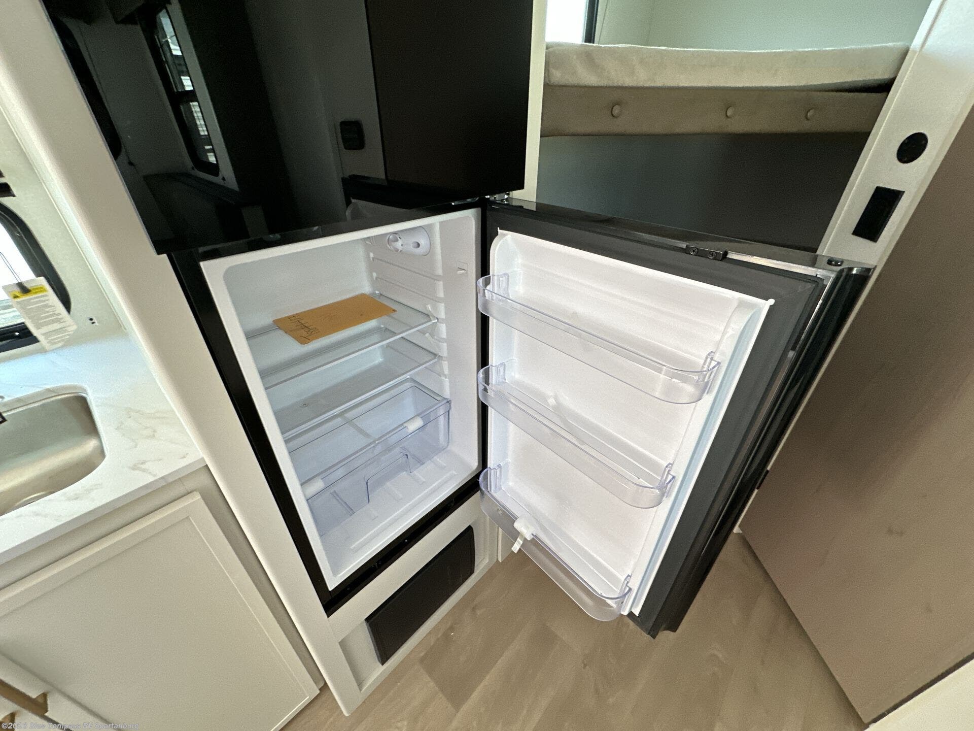 This travel trailer is perfect for getaways to the campground or relaxing escapes by the lake! There is a front queen bed with generous storage both above and below. Your guests or little ones will love the double-size bunks, and the full bath is right next to the bunks for easy nighttime use. Once you make breakfast on the two-burner range, you can dine at the booth dinette slide. An interior/exterior table provides more dining space when you need it, and a 15' power awning with a fusion light lets you stay up late to visit with friends!