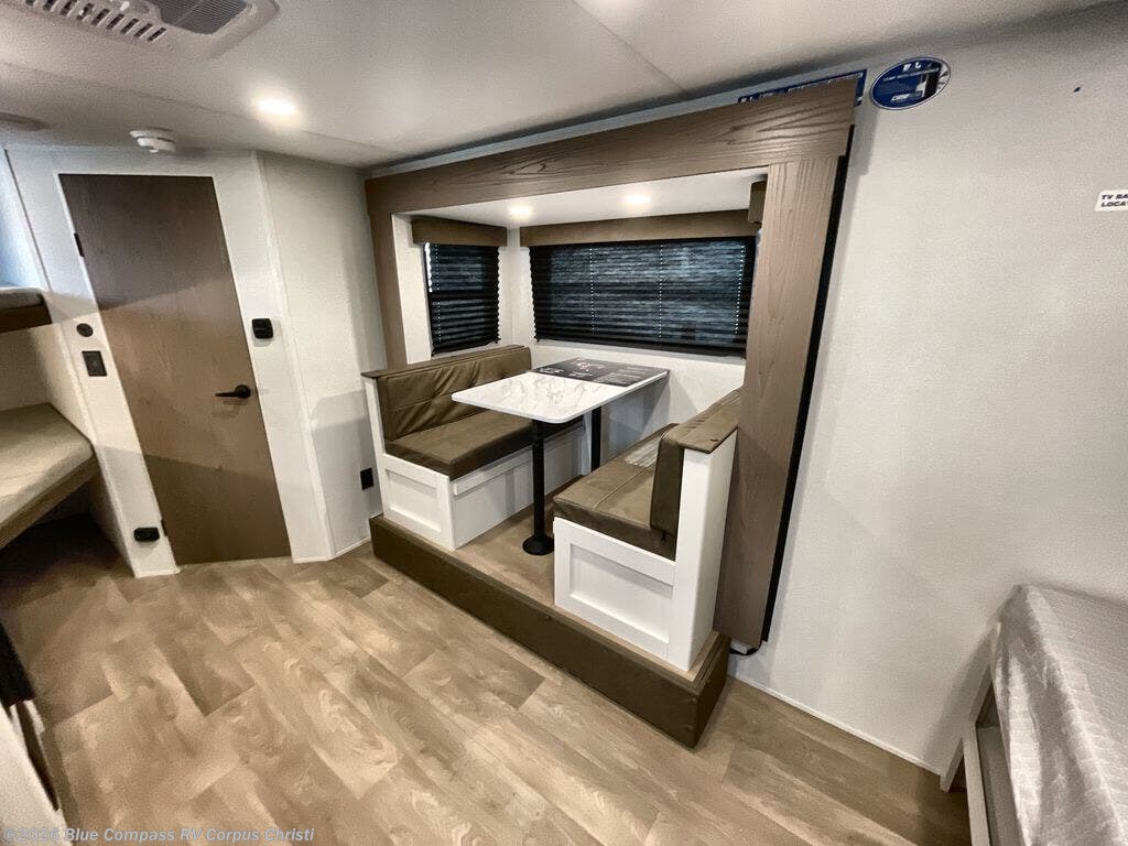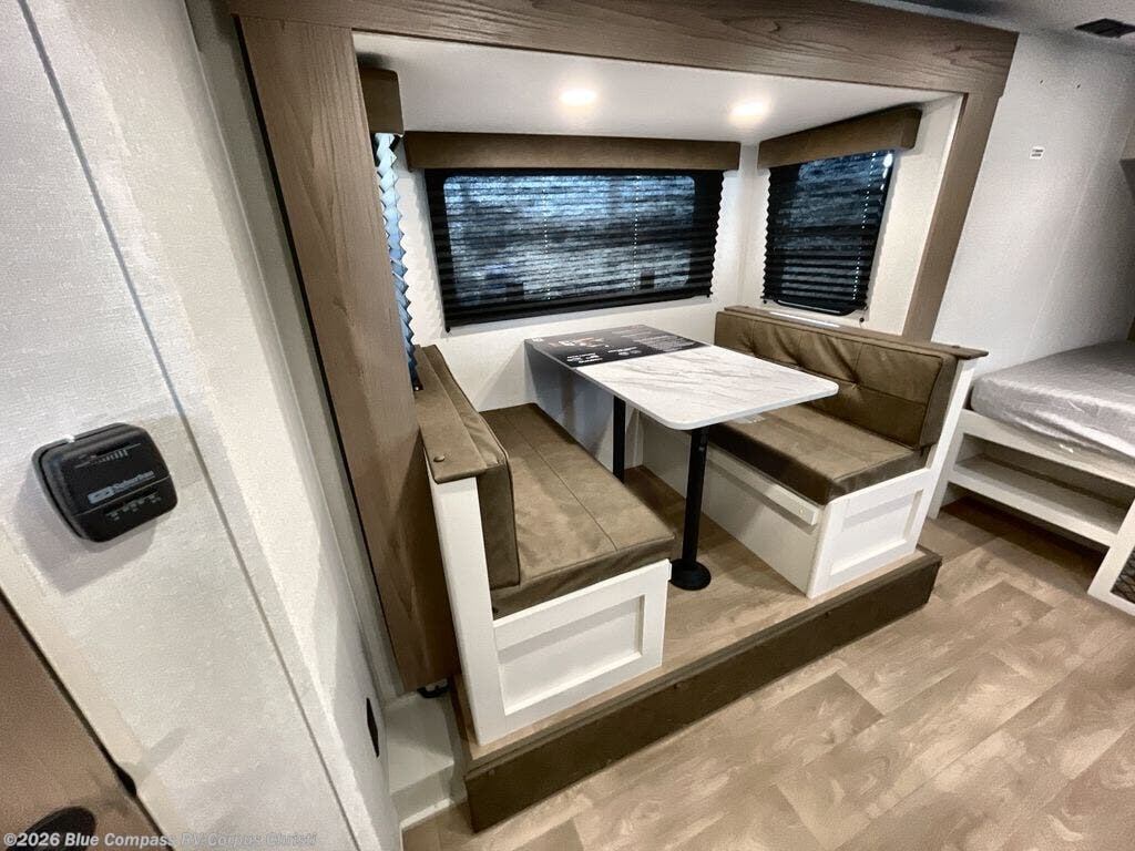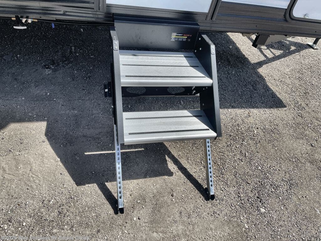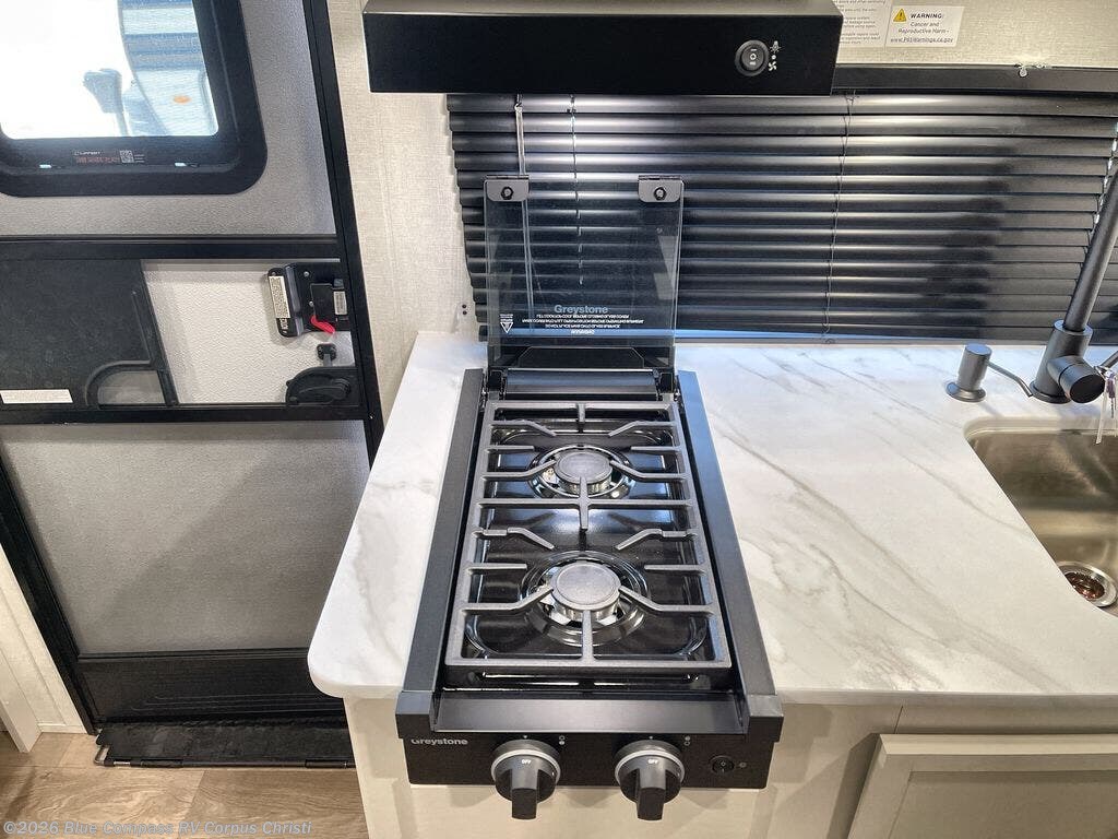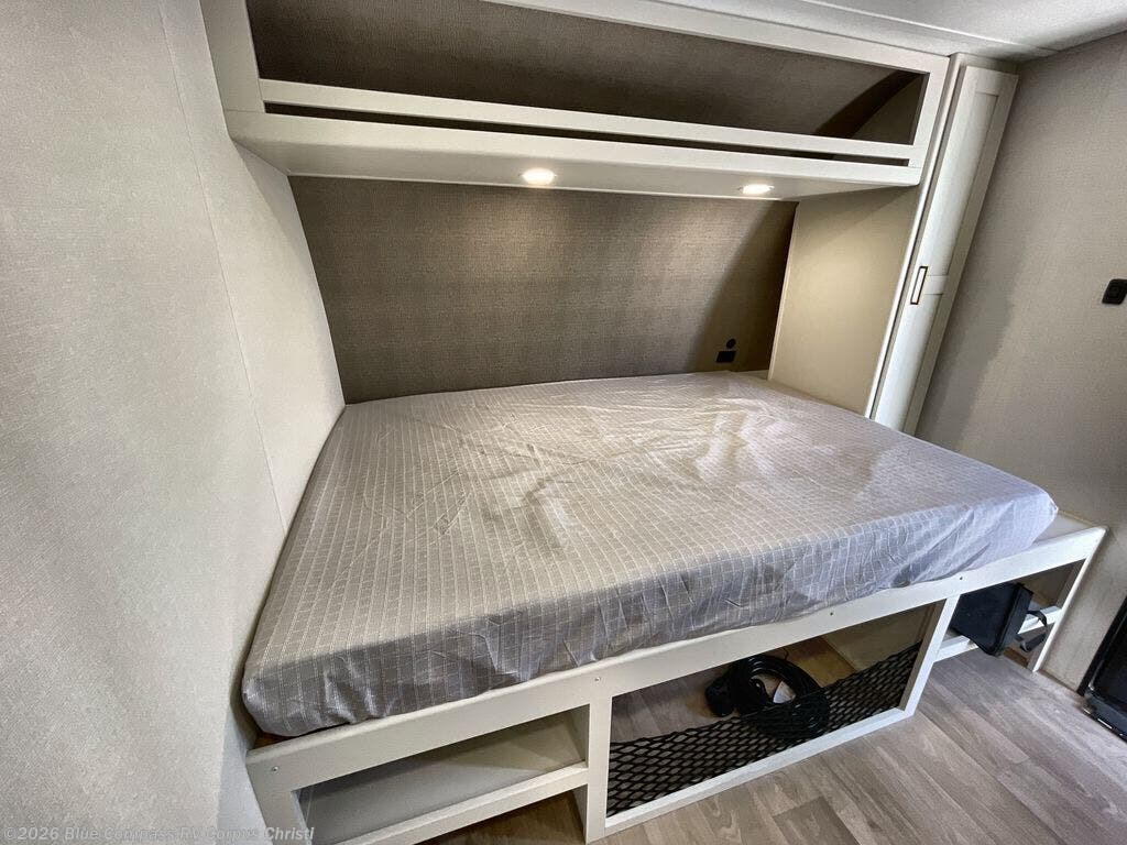 This travel trailer is perfect for getaways to the campground or relaxing escapes by the lake! There is a front queen bed with generous storage both above and below. Your guests or little ones will love the double-size bunks, and the full bath is right next to the bunks for easy nighttime use. Once you make breakfast on the two-burner range, you can dine at the booth dinette slide. An interior/exterior table provides more dining space when you need it, and a 15' power awning with a fusion light lets you stay up late to visit with friends!