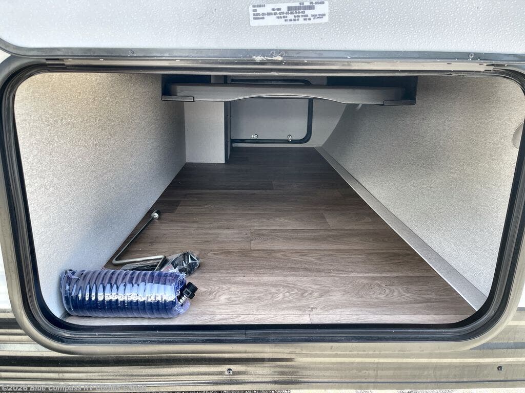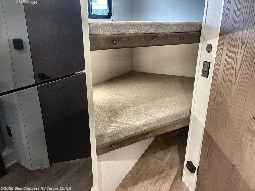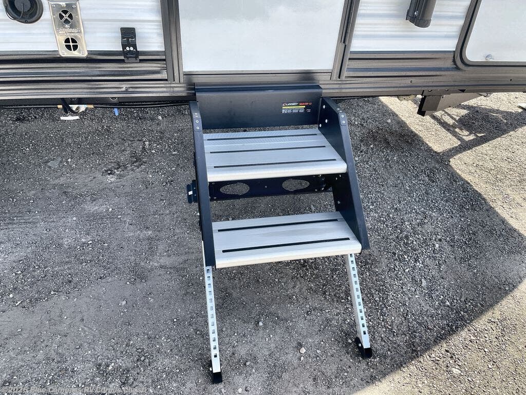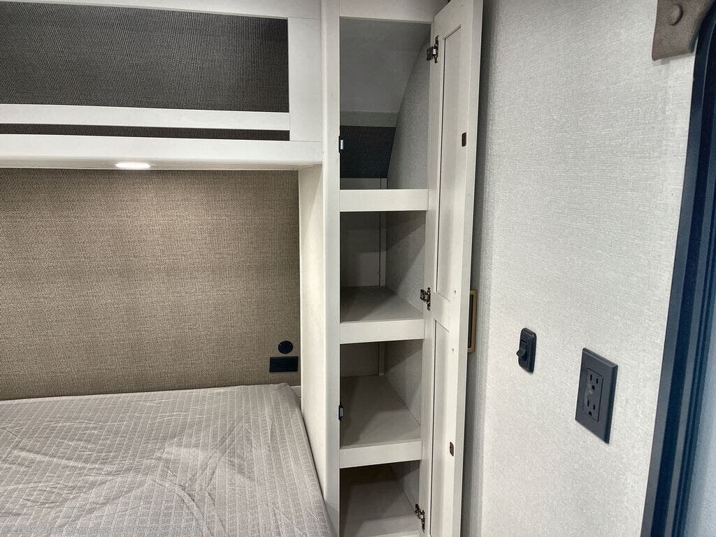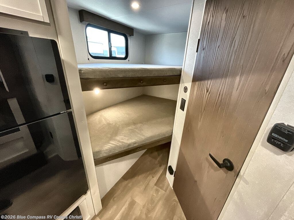 This travel trailer is perfect for getaways to the campground or relaxing escapes by the lake! There is a front queen bed with generous storage both above and below. Your guests or little ones will love the double-size bunks, and the full bath is right next to the bunks for easy nighttime use. Once you make breakfast on the two-burner range, you can dine at the booth dinette slide. An interior/exterior table provides more dining space when you need it, and a 15' power awning with a fusion light lets you stay up late to visit with friends!