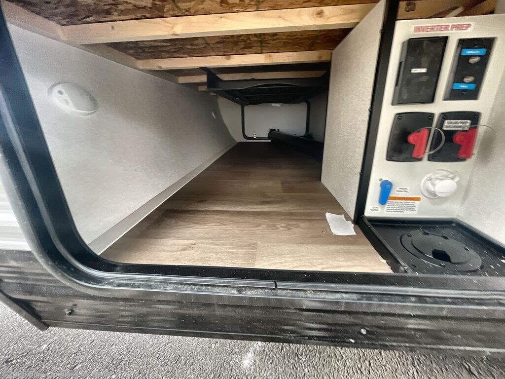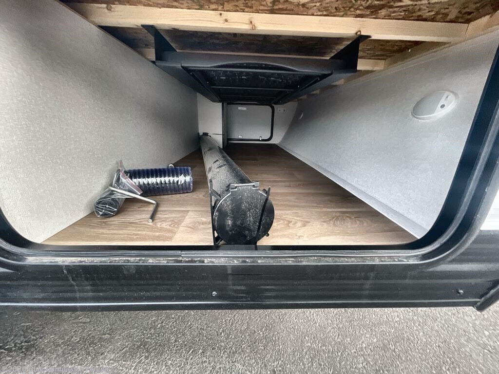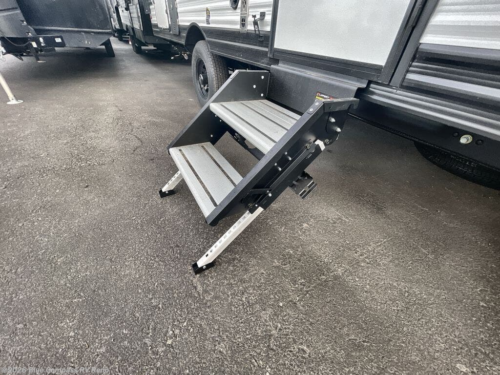 This travel trailer is perfect for getaways to the campground or relaxing escapes by the lake! There is a front queen bed with generous storage both above and below. Your guests or little ones will love the double-size bunks, and the full bath is right next to the bunks for easy nighttime use. Once you make breakfast on the two-burner range, you can dine at the booth dinette slide. An interior/exterior table provides more dining space when you need it, and a 15' power awning with a fusion light lets you stay up late to visit with friends!