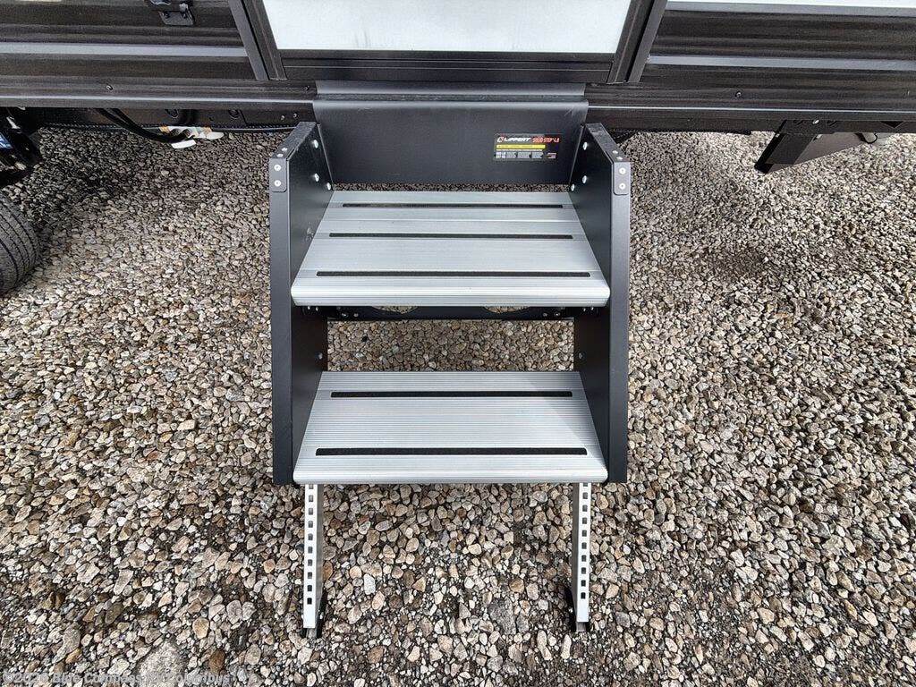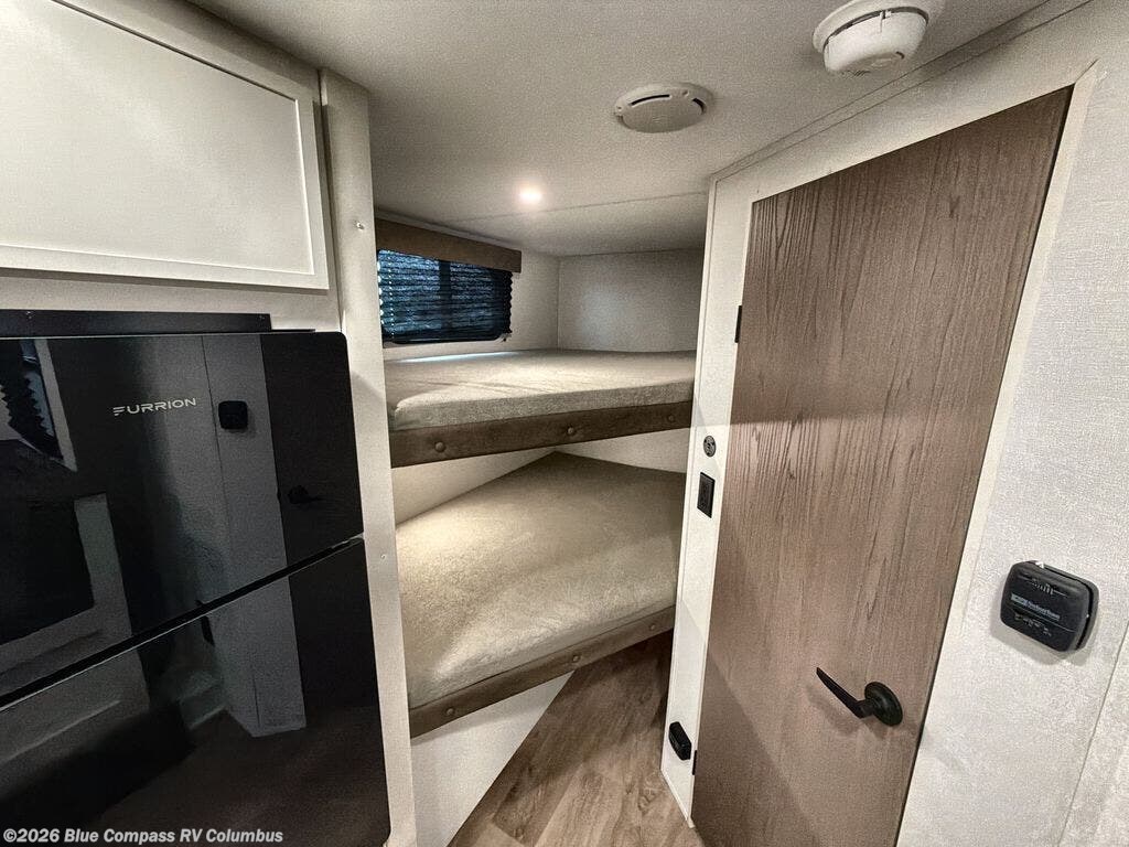 This travel trailer is perfect for getaways to the campground or relaxing escapes by the lake! There is a front queen bed with generous storage both above and below. Your guests or little ones will love the double-size bunks, and the full bath is right next to the bunks for easy nighttime use. Once you make breakfast on the two-burner range, you can dine at the booth dinette slide. An interior/exterior table provides more dining space when you need it, and a 15' power awning with a fusion light lets you stay up late to visit with friends!