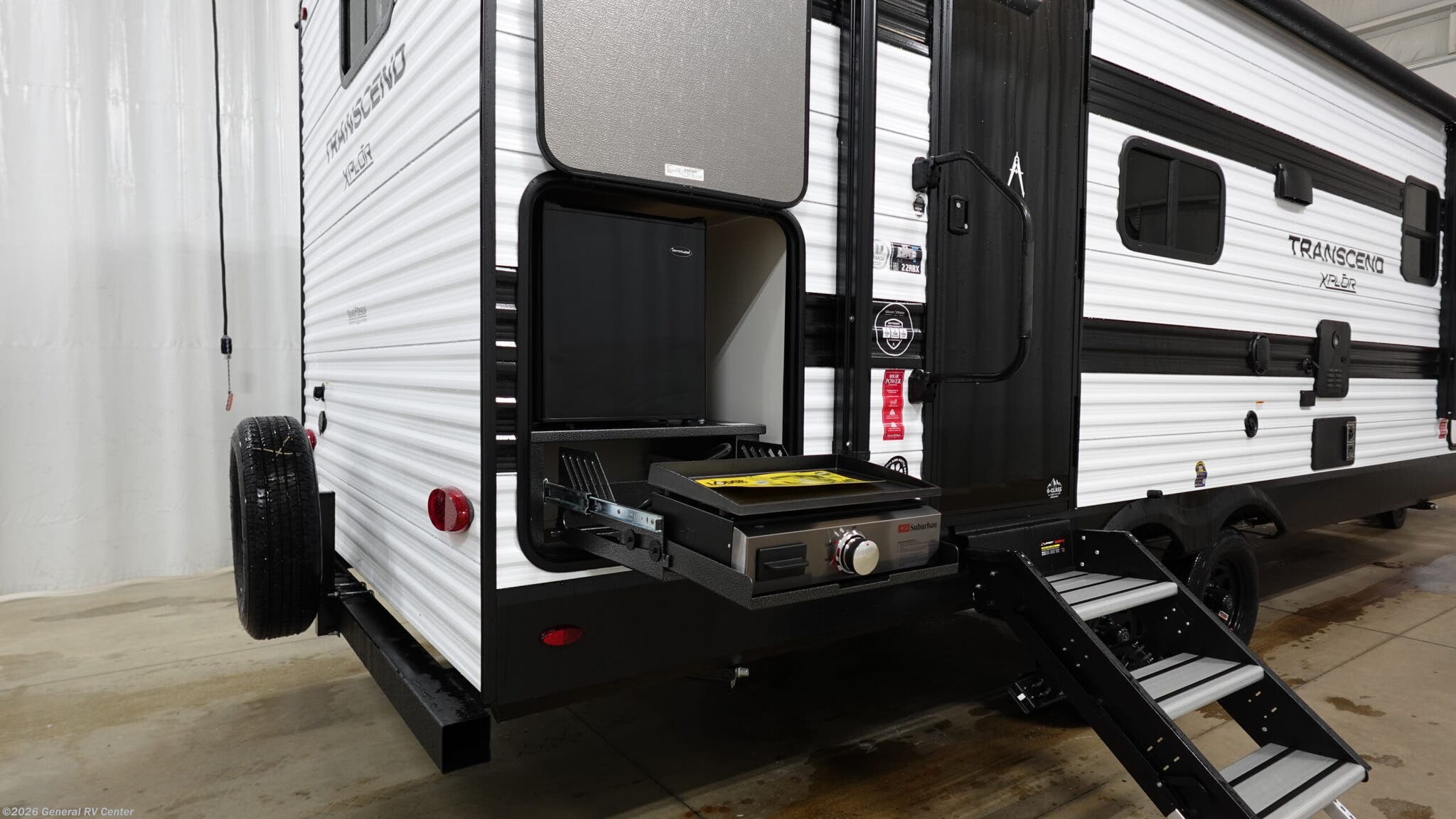 Grand Design Transcend Xplor travel trailer 22RBX highlights: Full Rear Bath Pull-Out Trash Can Exterior Griddle Front Private Bedroom Pack your bags and head for the campground in this spacious travel trailer! Once you arrive, you can unload the pass-thru storage, then make lunch on the exterior griddle with a 1.7 cu. ft. exterior refrigerator. The U-shaped dinette slide will provide a place to dine if you decide not to stay outside under the 16' power awning. Optional theater seats can be chosen in place of the dinette for even more comfort! You'll sleep soundly on the queen bed in the front bedroom, and the full rear bath lets you freshen up each day. The customer-focused, quality-built Transcend Xplor travel trailers by Grand Design are your ticket to fun and adventure. You will appreciate the power tongue jack when it comes time to set up, as well as the all-in-one utility center and the detachable power cord with an LED light. These models include many outlets throughout, USB ports to charge your gadgets, and a JBL exterior speaker to listen to your favorite tunes. The interior of the Transcend Xplor will have you feeling right at home with upgraded residential furniture, residential countertops, residential cabinet doors, and the list goes on!