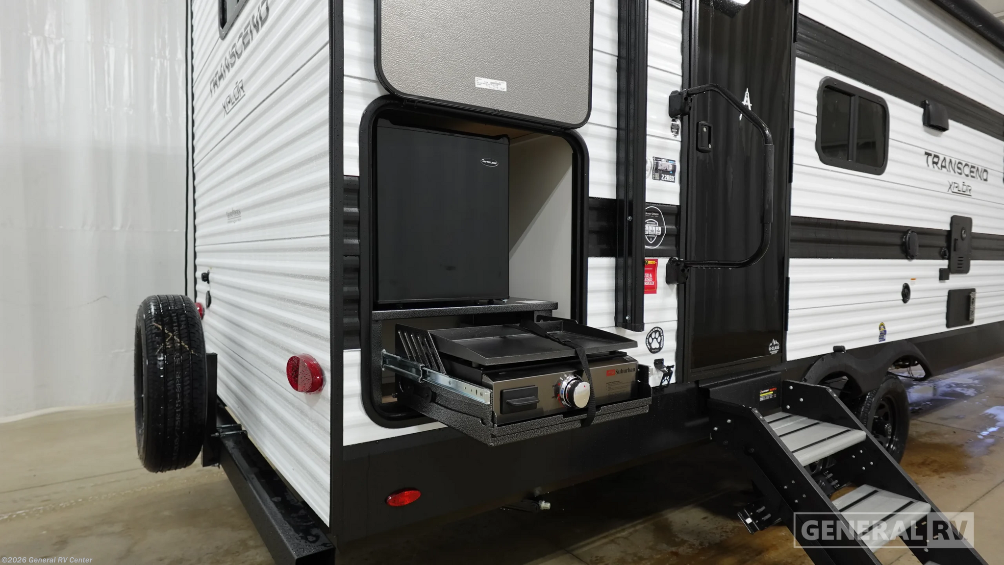 Grand Design Transcend Xplor travel trailer 22RBX highlights: Full Rear Bath Pull-Out Trash Can Exterior Griddle Front Private Bedroom Pack your bags and head for the campground in this spacious travel trailer! Once you arrive, you can unload the pass-thru storage, then make lunch on the exterior griddle with a 1.7 cu. ft. exterior refrigerator. The U-shaped dinette slide will provide a place to dine if you decide not to stay outside under the 16' power awning. Optional theater seats can be chosen in place of the dinette for even more comfort! You'll sleep soundly on the queen bed in the front bedroom, and the full rear bath lets you freshen up each day. The customer-focused, quality-built Transcend Xplor travel trailers by Grand Design are your ticket to fun and adventure. You will appreciate the power tongue jack when it comes time to set up, as well as the all-in-one utility center and the detachable power cord with an LED light. These models include many outlets throughout, USB ports to charge your gadgets, and a JBL exterior speaker to listen to your favorite tunes. The interior of the Transcend Xplor will have you feeling right at home with upgraded residential furniture, residential countertops, residential cabinet doors, and the list goes on!