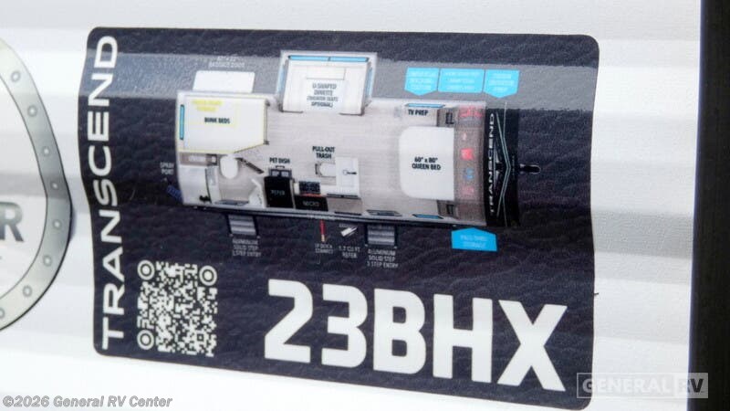 Discover the 2026 Grand Design Transcend Xplor 23BHX, where adventure meets comfort. This thoughtfully designed RV is perfect for families. The cozy bunk beds are ideal for the kids, while the spacious 60" x 80" queen bed provides a restful retreat for adults. With a length of 26 feet, this RV is both compact and spacious, making it easy to tow and maneuver while providing ample room for everyone. The Transcend Xplor 23BHX is equipped with practical features to enhance your travels. Enjoy the convenience of the pull-out trash and shoe storage, keeping your living space tidy. The pet dish ensures your furry friends feel right at home, and the 19-foot awning extends your living area outdoors, perfect for enjoying the fresh air. With solar prep and a 2000W inverter prep, this RV is ready for off-grid adventures. The ample storage, including pass-thru and under-bunk options, ensures you can bring all your essentials. Visit your nearest General RV dealership to explore this exceptional travel trailer and start your next adventure.