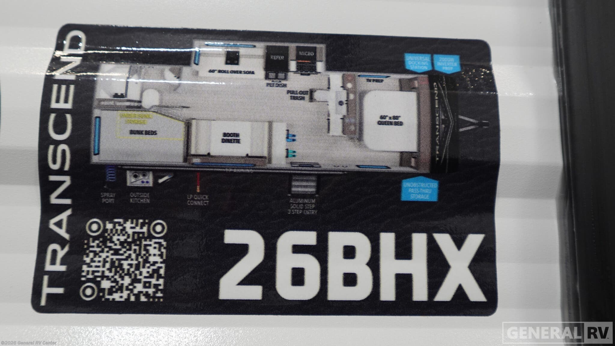 Discover the 2026 Grand Design Transcend Xplor 26BHX, a travel trailer that effortlessly combines style, comfort, and functionality for your adventures. With a length of just over 30 feet, this RV is designed to accommodate up to 10 sleepers, making it perfect for family trips or gatherings with friends. The front bedroom features a cozy queen bed, ensuring restful nights, while the bunkhouse at the rear provides additional sleeping space with double beds. The versatile convertible seating options, including a booth dinette and a 60" roll-over sofa, offer both relaxation and extra sleeping capacity. The center kitchen is equipped with a full-size electric refrigerator and a three-burner cooktop, making meal preparation a breeze. Enjoy the convenience of the outside kitchen for alfresco dining under the 17-foot powered retractable awning. The thoughtfully designed floorplan includes a rear bath with a shower curtain, ensuring privacy and comfort. With ample storage options, including under-bunk storage and unobstructed pass-thru storage, you'll have plenty of room for all your gear. Plus, the 2000W inverter prep and universal docking station enhance your camping experience with modern conveniences. Whether you're exploring the countryside or setting up at a favorite campsite, the Transcend Xplor 26BHX is your ideal home on wheels. For more details or to experience this RV firsthand, visit your nearest General RV Dealership.