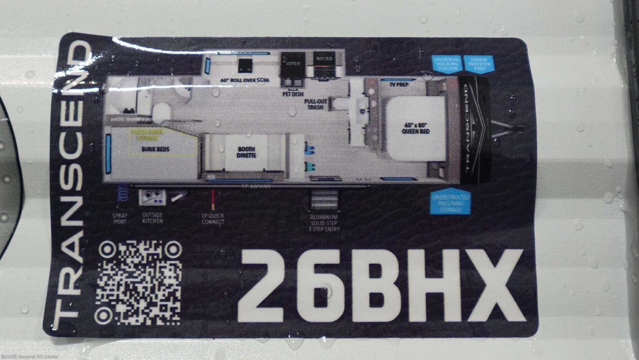 Discover the 2026 Grand Design Transcend Xplor 26BHX, a travel trailer that effortlessly combines style, comfort, and functionality for your adventures. With a length of just over 30 feet, this RV is designed to accommodate up to 10 sleepers, making it perfect for family trips or gatherings with friends. The front bedroom features a cozy queen bed, ensuring restful nights, while the bunkhouse at the rear provides additional sleeping space with double beds. The versatile convertible seating options, including a booth dinette and a 60" roll-over sofa, offer both relaxation and extra sleeping capacity. The center kitchen is equipped with a full-size electric refrigerator and a three-burner cooktop, making meal preparation a breeze. Enjoy the convenience of the outside kitchen for alfresco dining under the 17-foot powered retractable awning. The thoughtfully designed floorplan includes a rear bath with a shower curtain, ensuring privacy and comfort. With ample storage options, including under-bunk storage and unobstructed pass-thru storage, you'll have plenty of room for all your gear. Plus, the 2000W inverter prep and universal docking station enhance your camping experience with modern conveniences. Whether you're exploring the countryside or setting up at a favorite campsite, the Transcend Xplor 26BHX is your ideal home on wheels. For more details or to experience this RV firsthand, visit your nearest General RV Dealership.